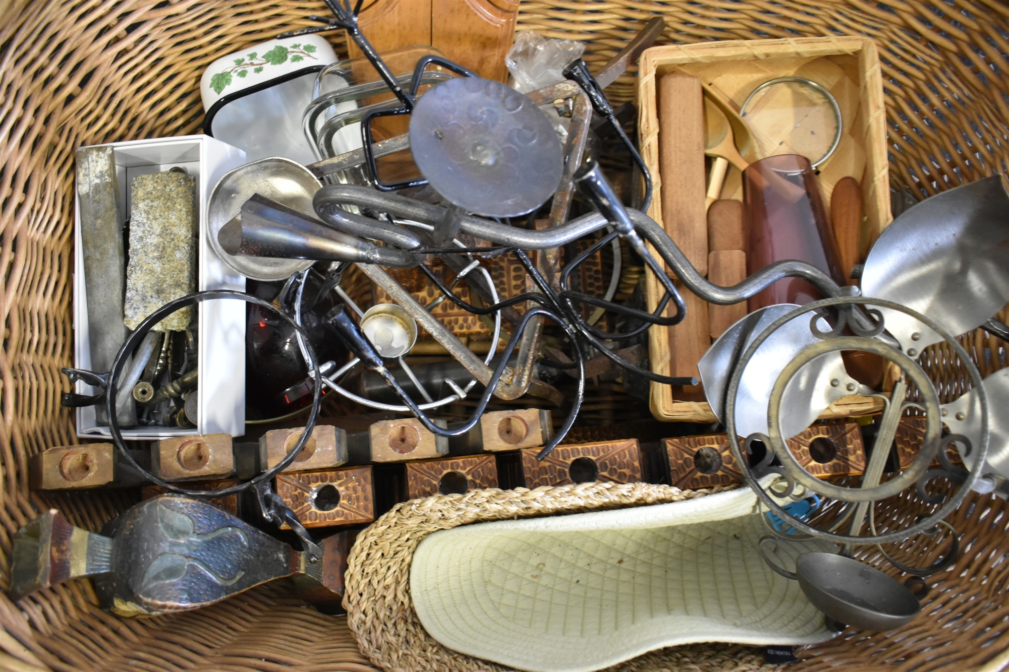 Korg med diverse föremål bl.a träljusstakar och metallföremål, längd på korg 100 cm