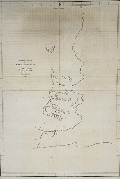 This geographical print is a nautical chart Port Mulgrave, Alaska). The chart provides a hydrographic sketch of the port, a coastal inlet, detailing the coastal outlines and offshore hazards. The port is located in Icy Bay, Alaska, and was surveyed during Captain Cook's Third Voyage to the North Pacific. Navigational data (latitude, longitude, time of high water) is inscribed on the left side of the map. This map was published posthumously as part of the official account of Captain Cook's Third Voyage (1776–1779).