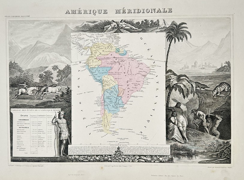 This work is an impressive, highly decorated map of South America ("Amérique Méridionale"). The central map provides geographical and political boundaries, with key regions differentiated by hand-coloring. The map is set within an elaborate frame featuring vignettes that depict the natural history, indigenous people, and landscape of the continent, including mountains, plains, a palm tree, and a table of statistical information. This style of decorative, informative border is characteristic of Levasseur’s work, and the map was included in his international cartographic works like the Atlas Universel Illustré.