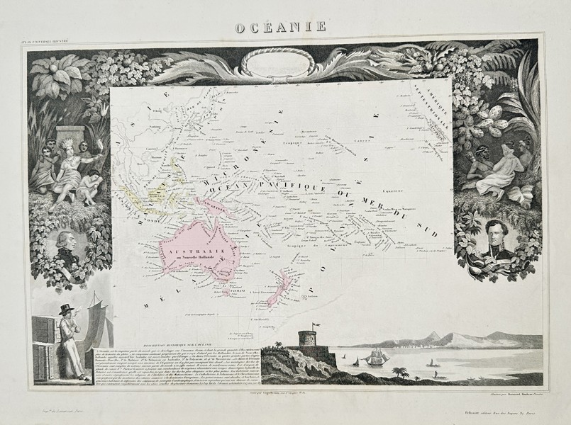 This work is a decorative map of Oceania ("Océanie"), which includes Australia and the islands of the Pacific. The central geographical map shows the region's main islands and political divisions, with sections of Australia highlighted by hand-coloring. The map is framed by an elaborate engraved border that features vignettes illustrating the region's flora, fauna, and indigenous people, as well as a scene of a coastline with a fort and shipping, all characteristic of the illustrative style of Levasseur's atlas plates. This map was published in the Atlas Universel Illustré.
