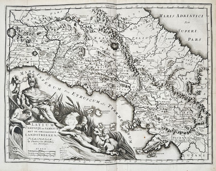 This work is an historical map of central Italy, specifically depicting the ancient regions of Latium, Campania, and Samnium. The cartography details the geography, ancient place names, cities, and historical boundaries of the areas around Rome and extending to the Adriatic and Tyrrhenian Seas. The title cartouche is highly decorative, featuring allegorical figures of reclining river gods and cherubs amongst the text. The map was engraved by Pieter Leisterbäck and published by Francis Halma, as an illustration for an atlas of classical or historical geography.