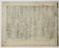 This print illustrates a New Testament scene, Christ Before the High Priest Caiaphas or a similar episode from the Passion of Christ. Christ stands centrally, surrounded by a large crowd of richly dressed figures, soldiers, and various onlookers within an elaborate architectural setting of arches and columns, suggesting a palace or temple hall. The figures display a range of expressions, emphasizing the dramatic judicial setting. This engraving is a religious print created for the market by the influential Galle publishing house.