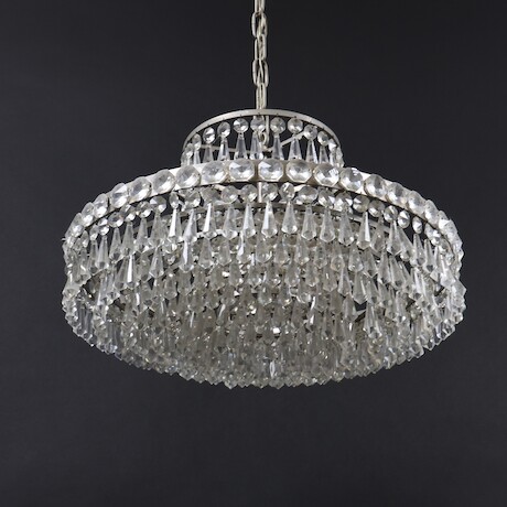 Bilder Taklampa, 1900-talets andra hälft, vitmetall, behängd med prismor diameter 44 cm