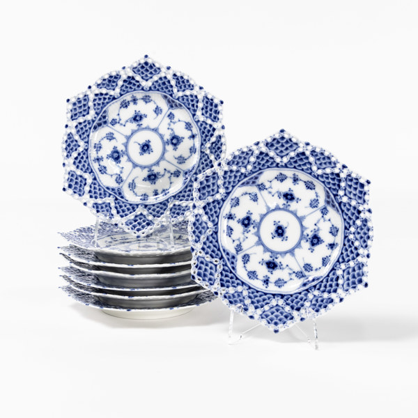 Assietter, 8 st, "Musselmalet", 1144, Royal Copenhagen, diameter 17 cm, förstasortering