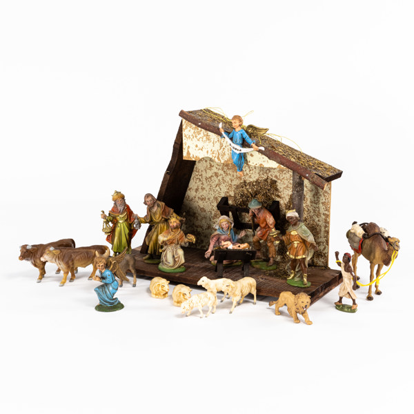 Julkrubba med figurer, 1900-tal, bredd 35 cm, höjd 26 cm