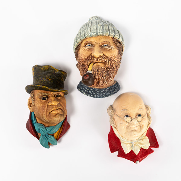 Väggreliefer, 3 st, handmålat gips, "Fisherman", "Mr. Pickwick" samt "Bill Sikes", 1900-tal, Bosson's, England, höjd ca 14 cm och mindre