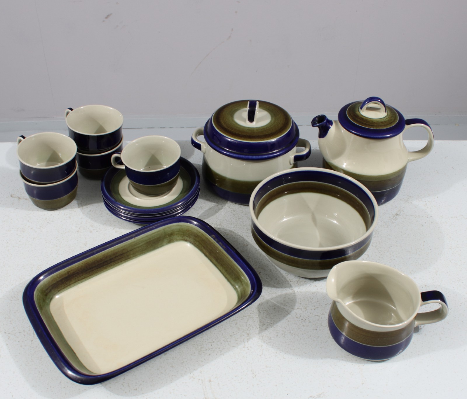 14 delar, 5st tekoppar, 4st tefat, 1st tekanna, 1st mjölk/såskanna, 1st karott med lock, 1st skål samt 1st ugnseldfast form. (vån3)
