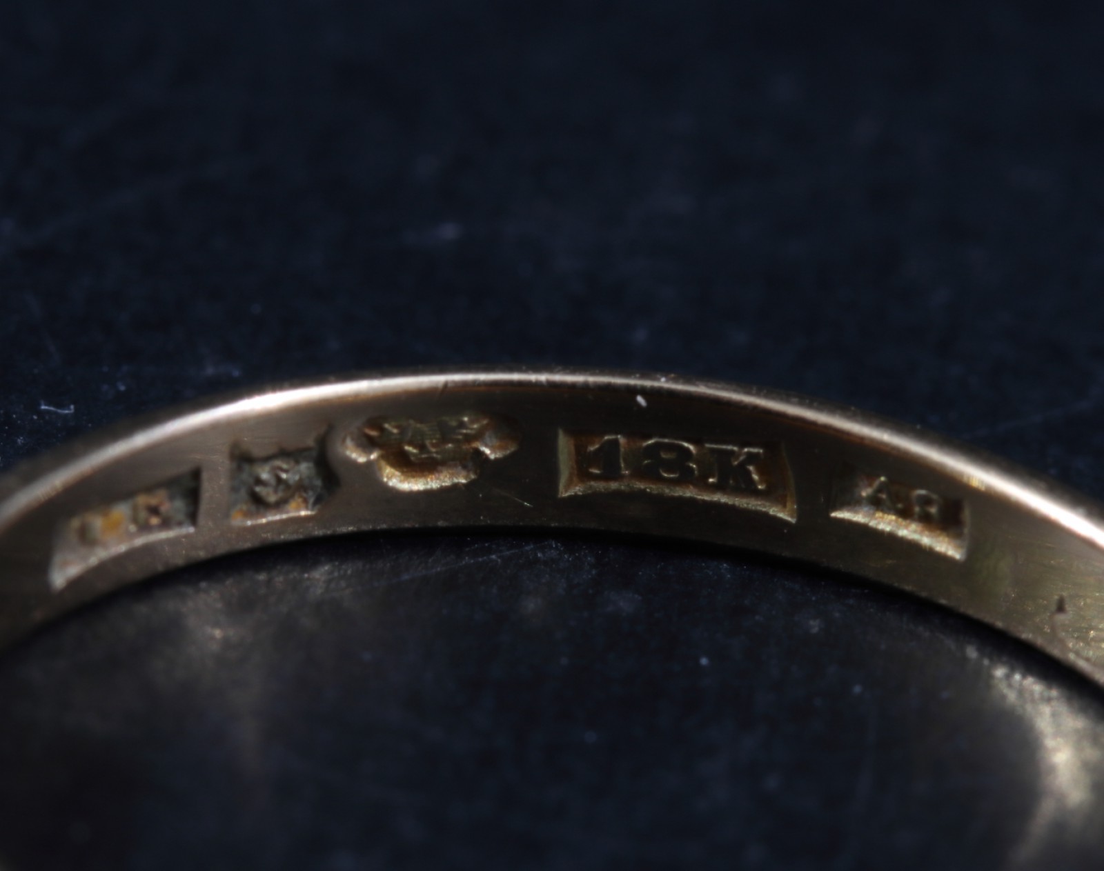 18 karat guld, gåvogravyr, bredd 3 mm, strl:22,5 mm, vikt 4,70 gram. (vån3)