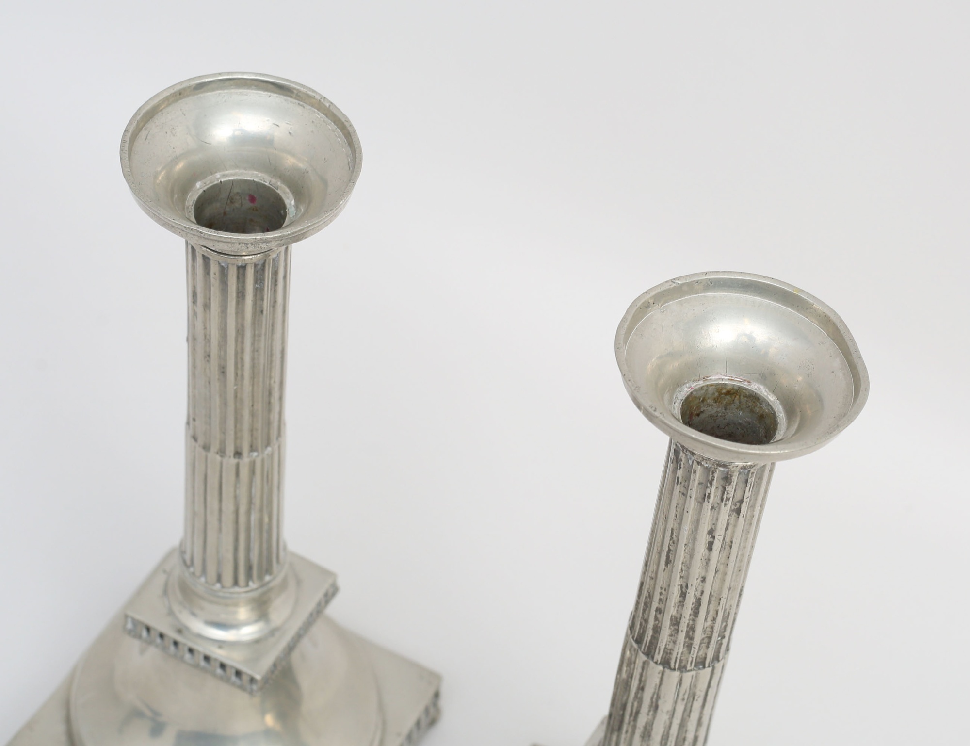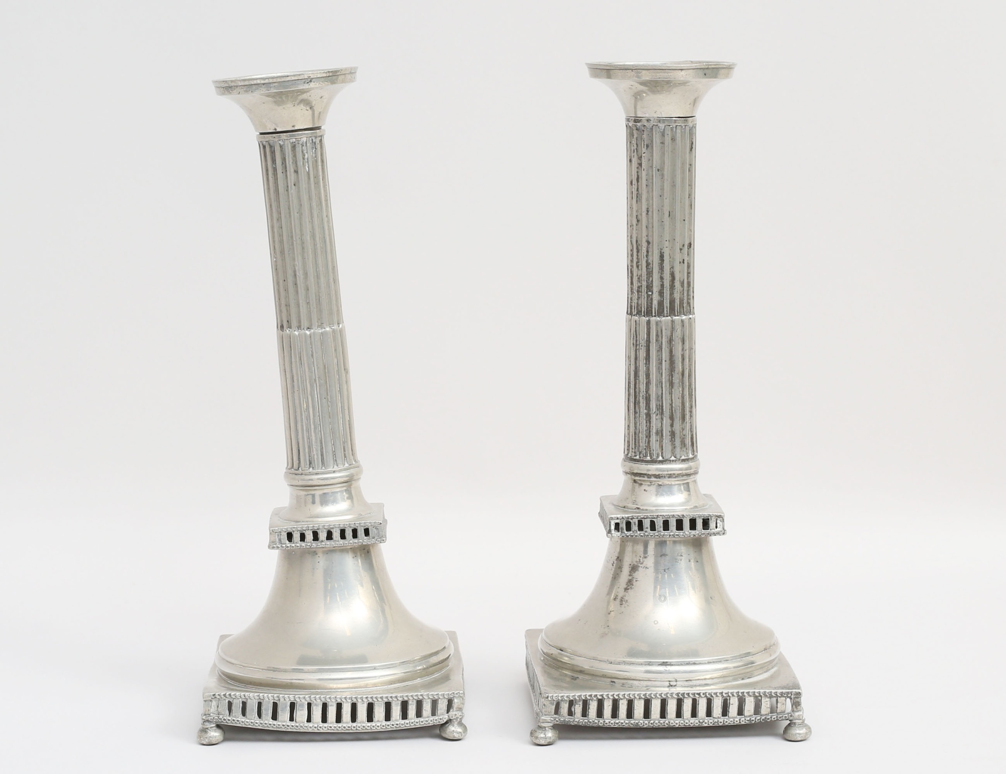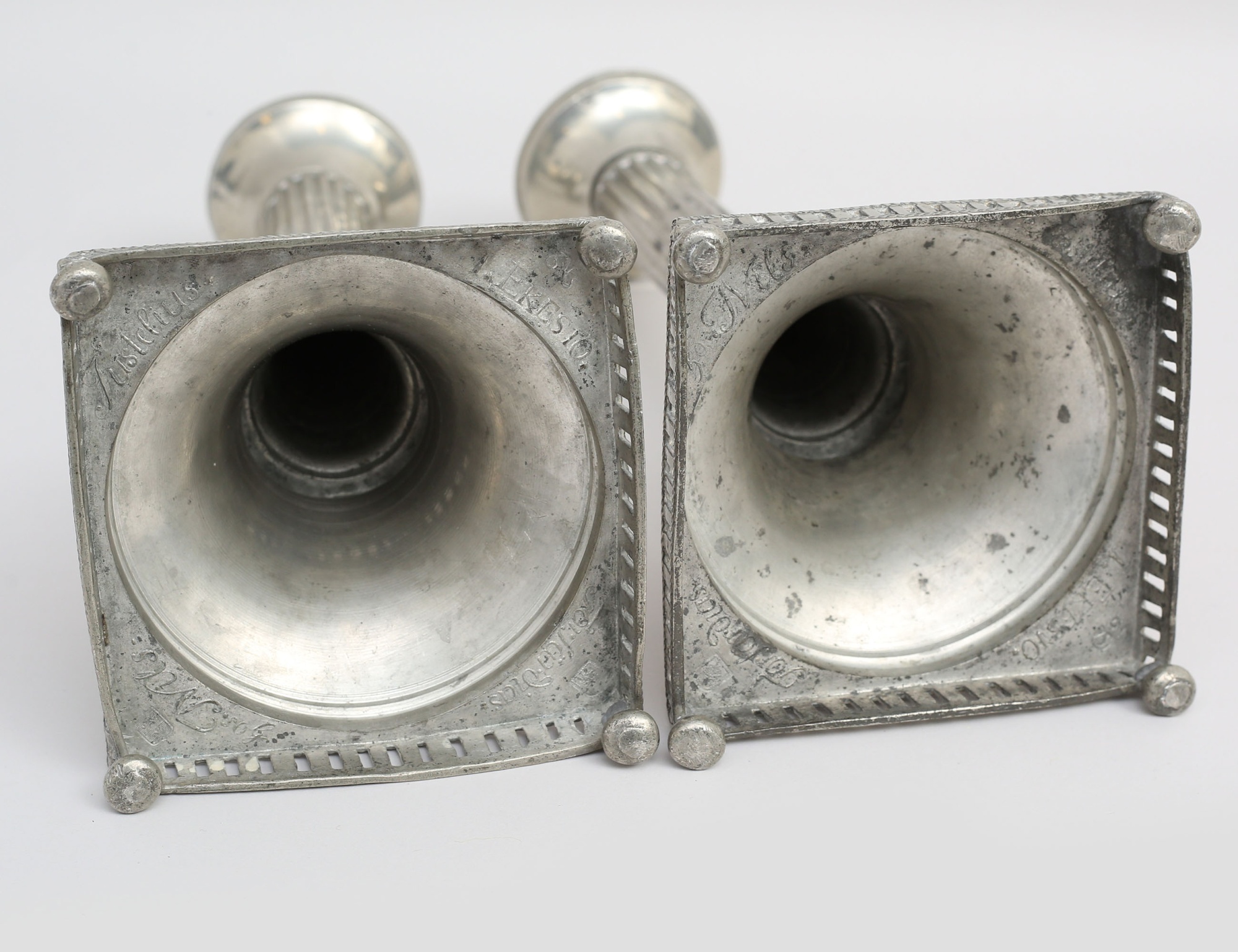 Nicolaus Justelius Eksjö varav en 1799 respektive 1800, tenn, kvadratisk fotplatta med galler på kulfötter, räfflad stam, lösa ljusmanschetter, höjd 29 (en ljusstake sned, en kulfot sned)