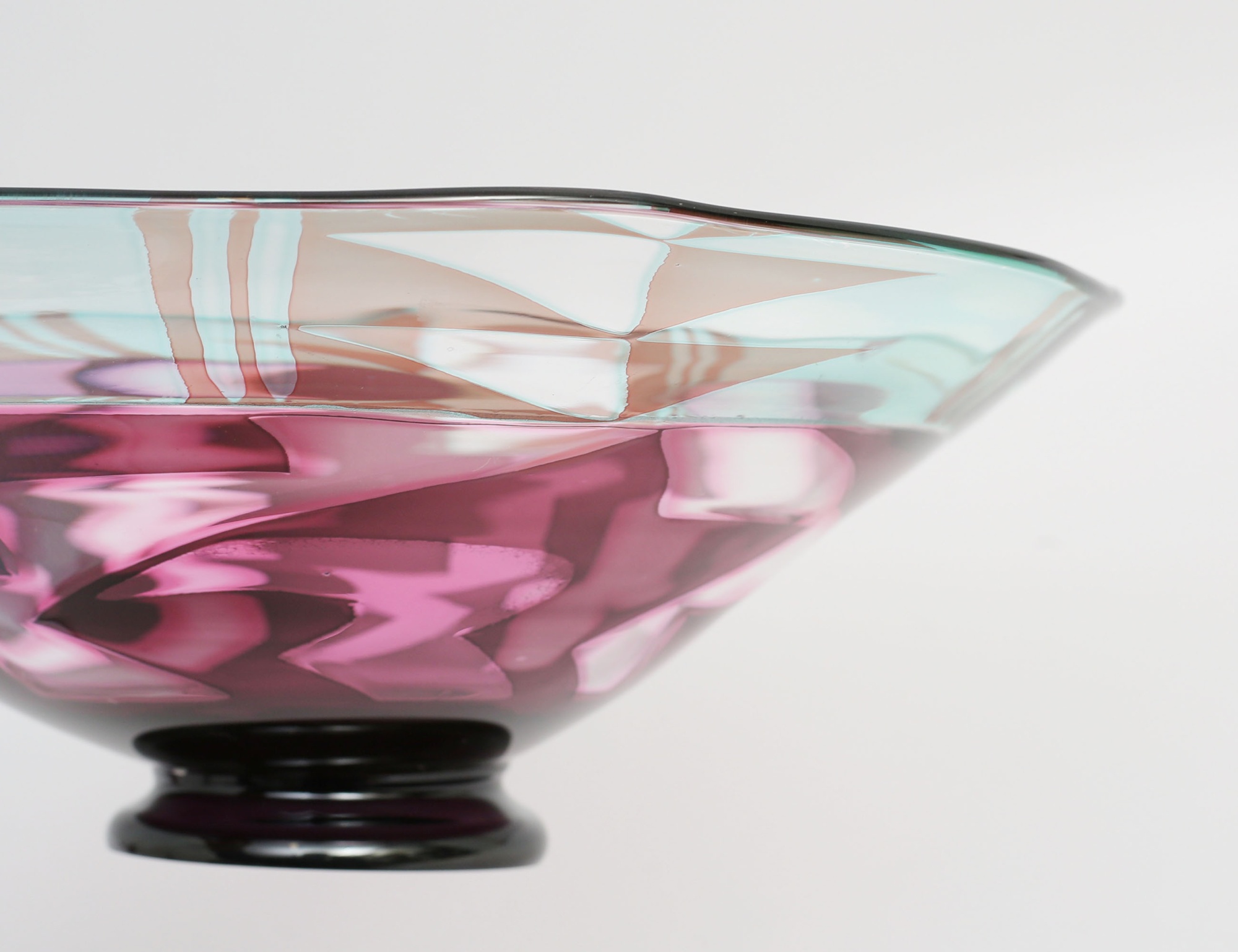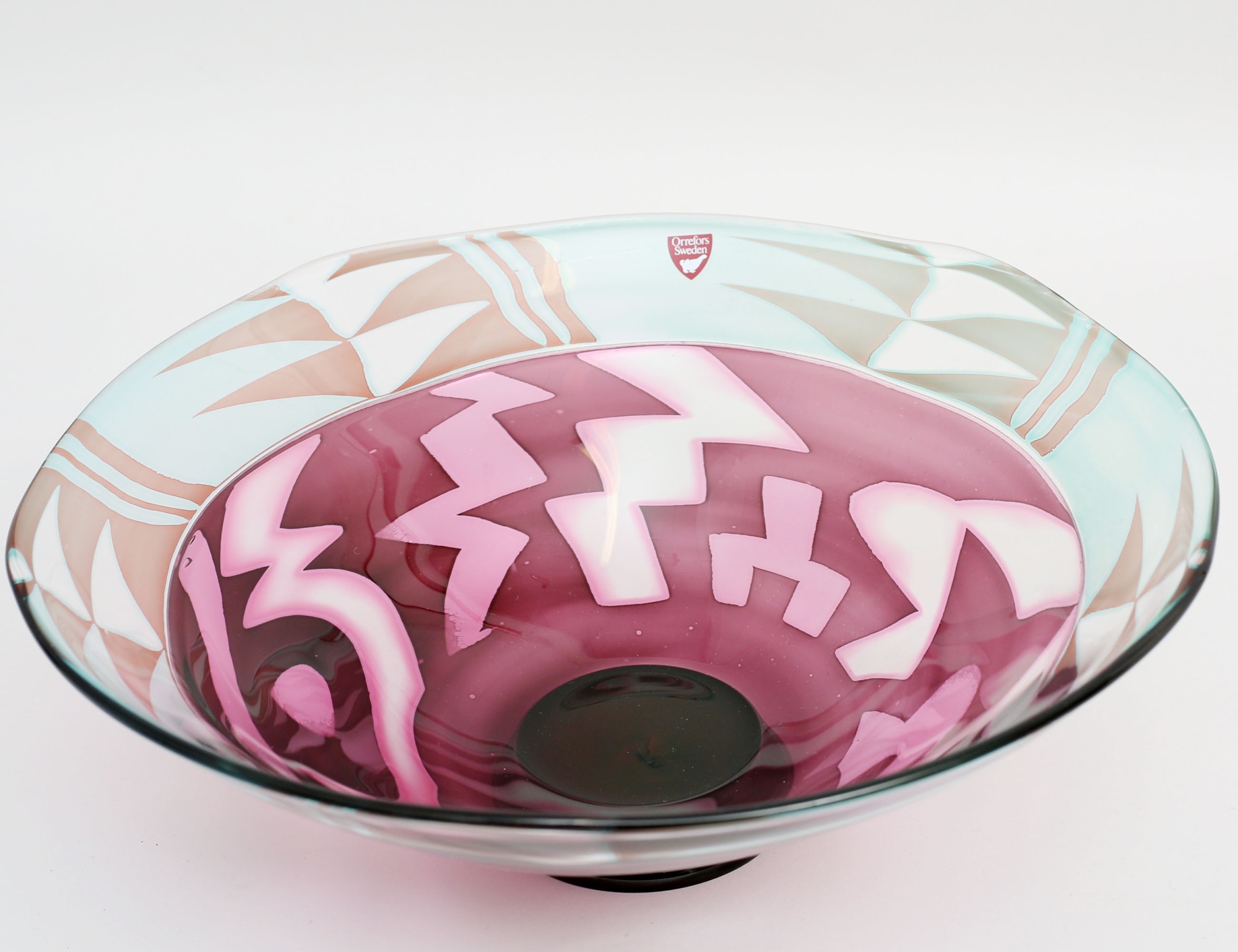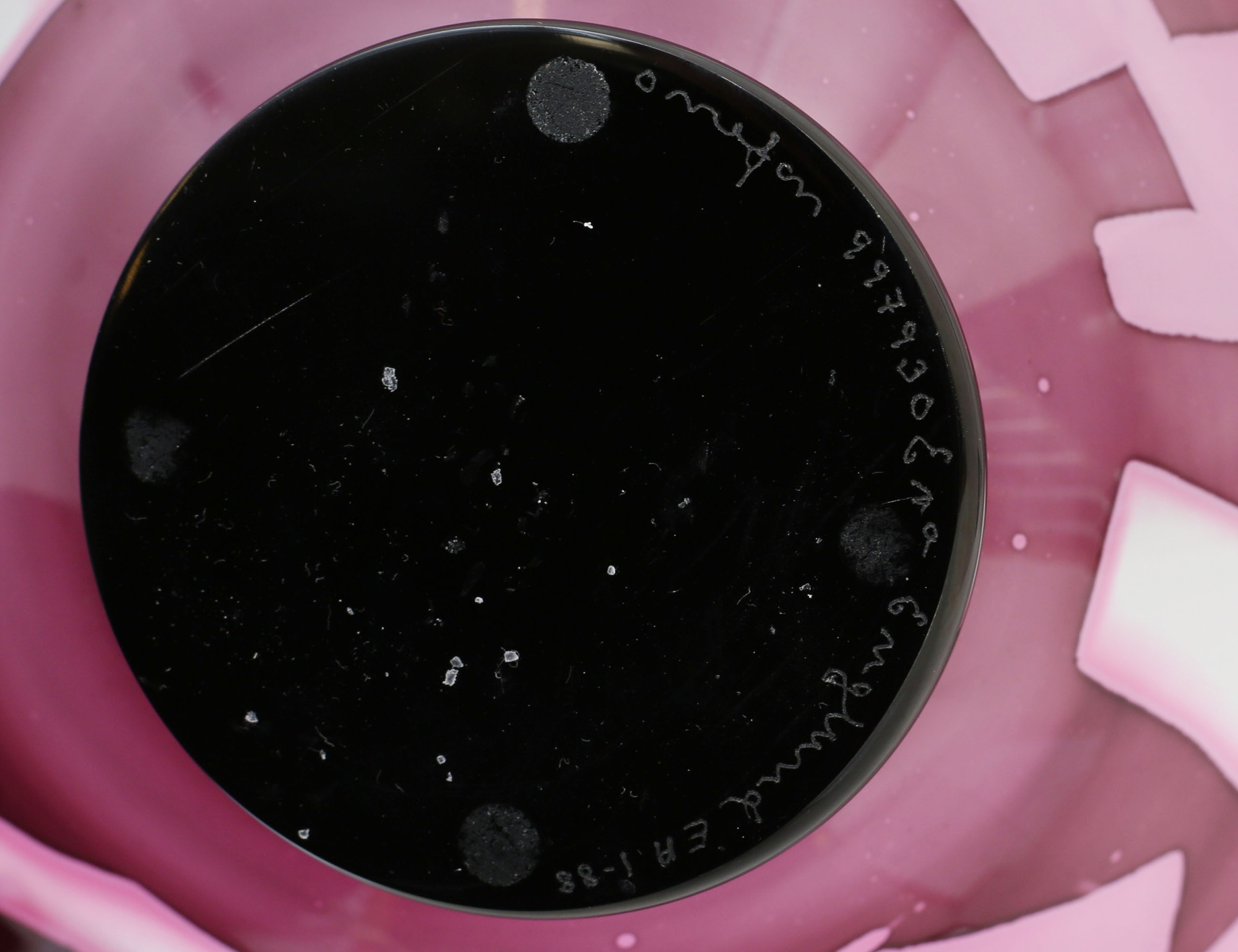 skål underfång, rosa och ljust gröntonat glas, abstrakt dekor, signerad och numrerad 997930, höjd 10, diameter 28