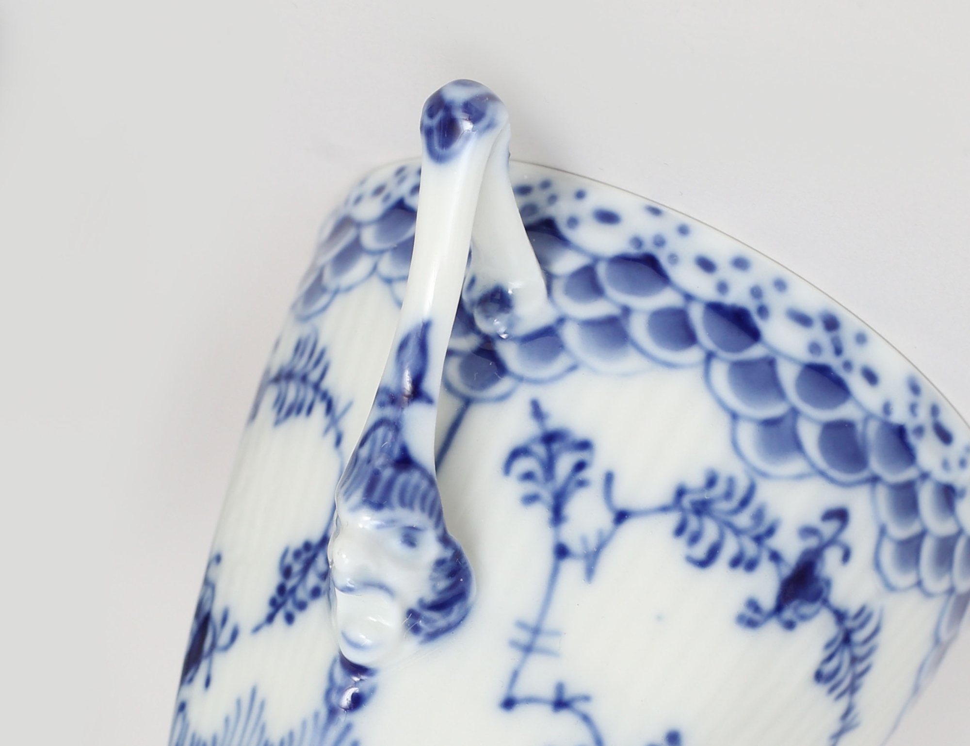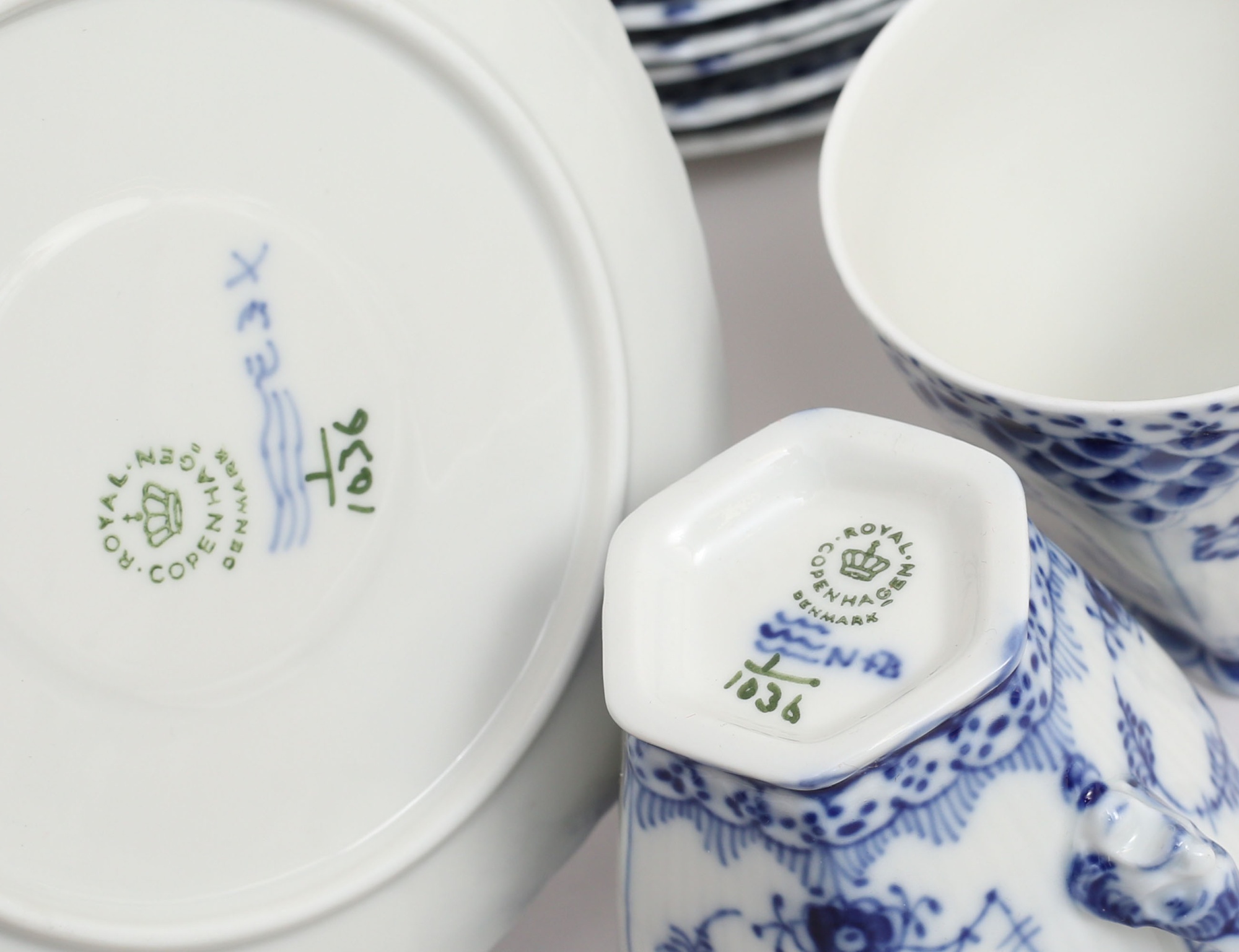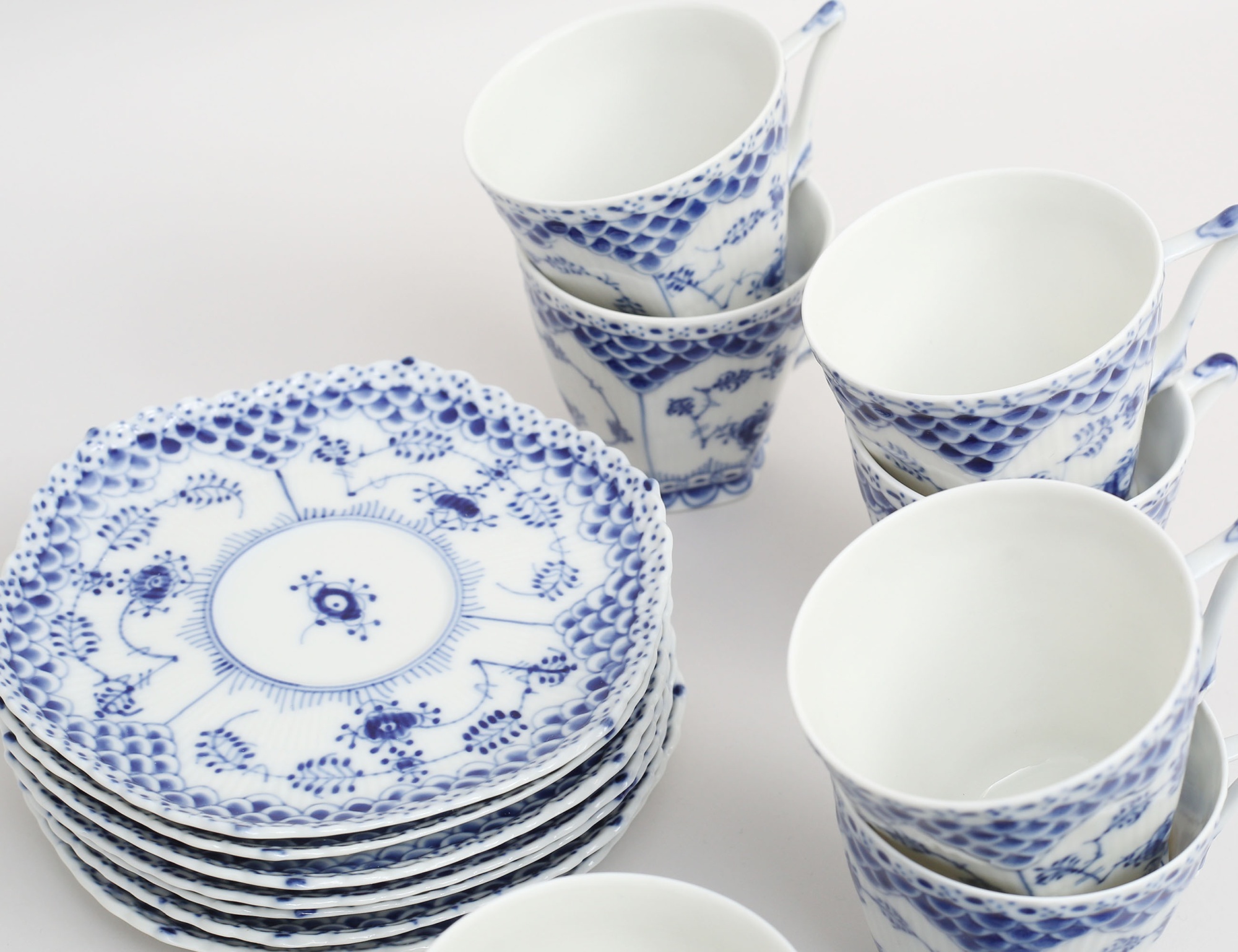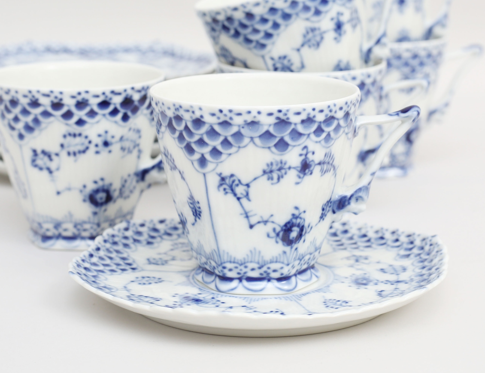 8 kaffekoppar med fat, modellnummer 1036, "Blue Fluted Full Lace" helblond, 1:a sortering, höjd 7, diameter 7/14