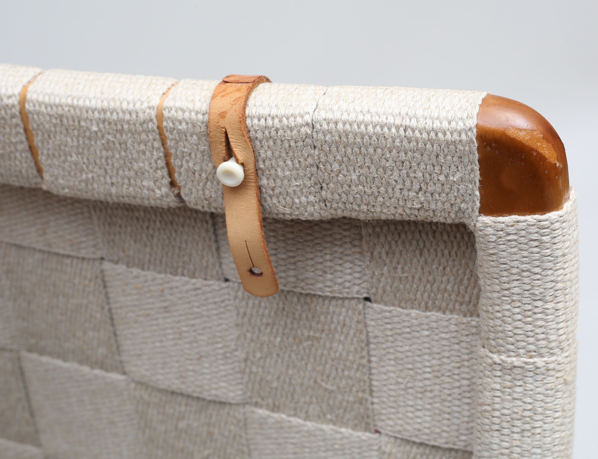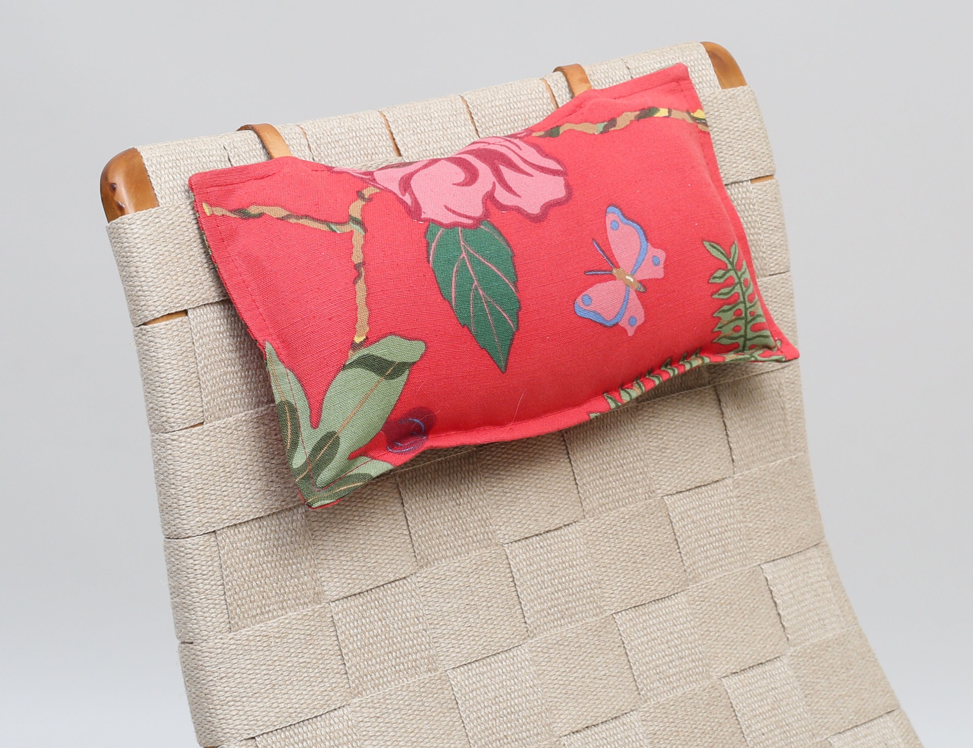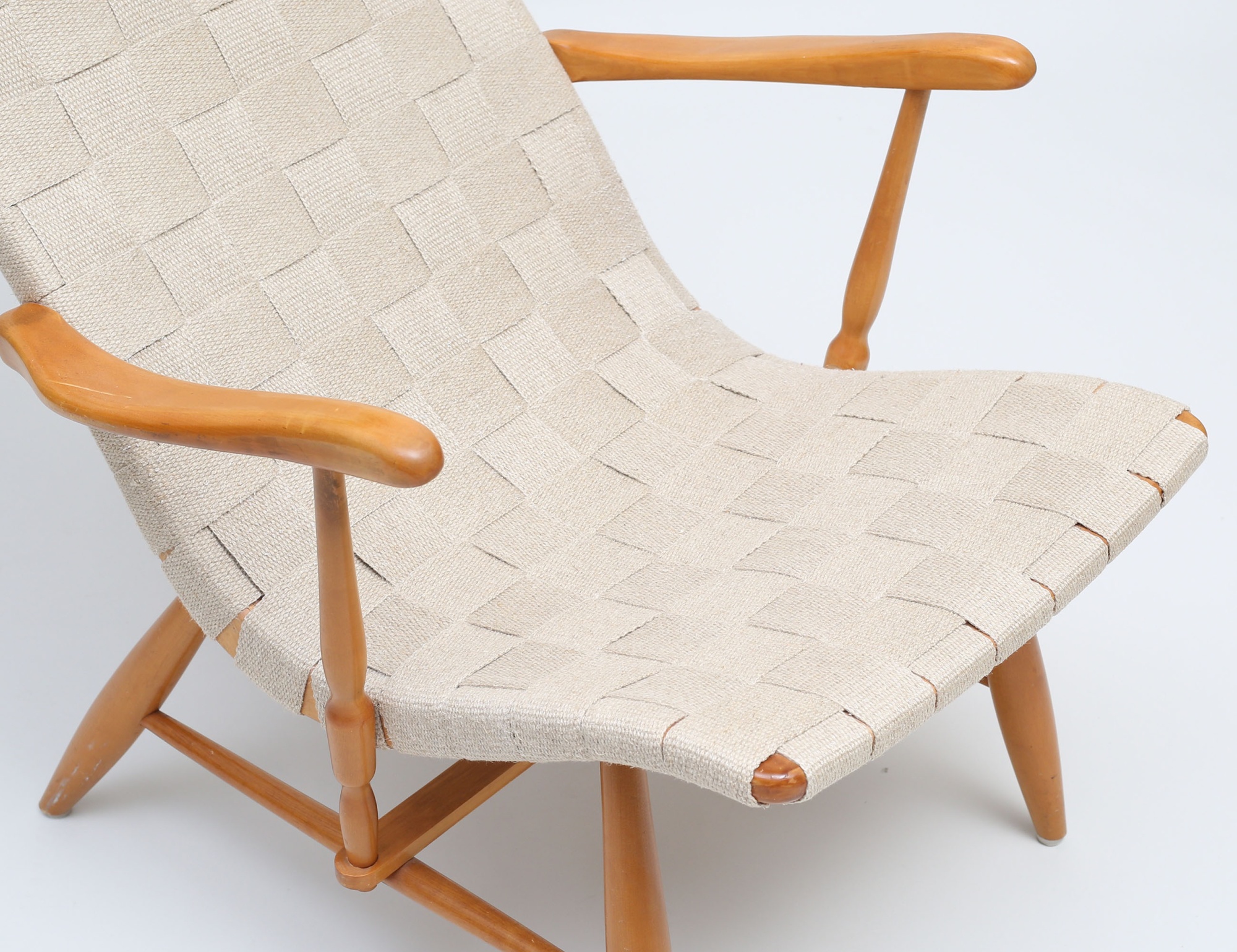 Yngve Ekström 1900-talets mitt, modellen formgiven 1945, stomme i björk, sits i sadelgjord, lös nackkudde klädd i rött mönstrat tyg, höjd 95, bredd 70 (obetydligt bruksslitage)