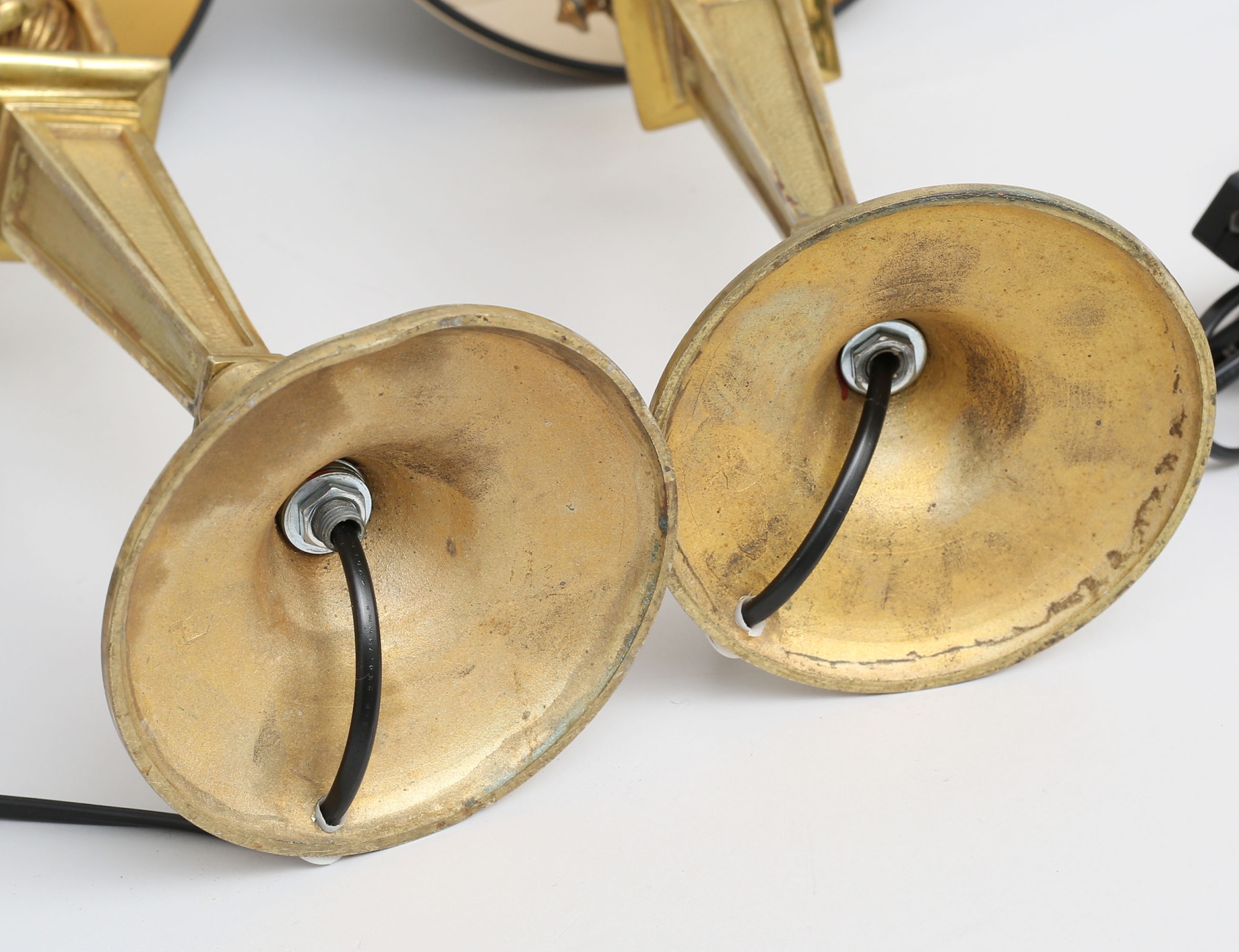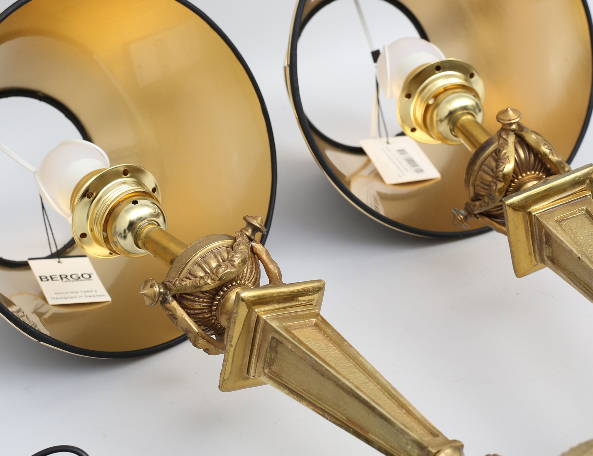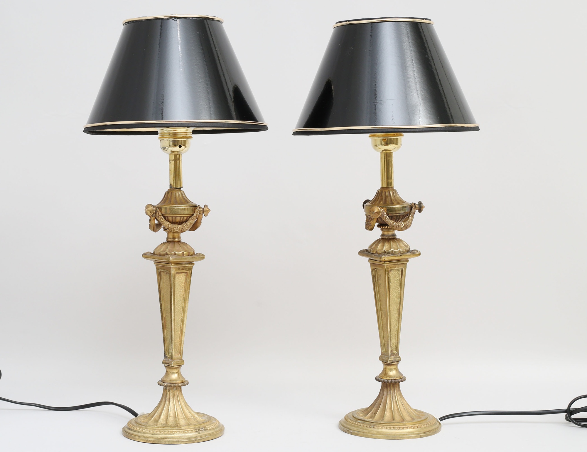 Frankrike sent 1800-tal, gjuten delvis polerad mässing, dekor av bla. pärlstav och girlanger, ursprungligen ljusstakar senare omarbetade, lackskärmar Bergö, höjd 40 (50)