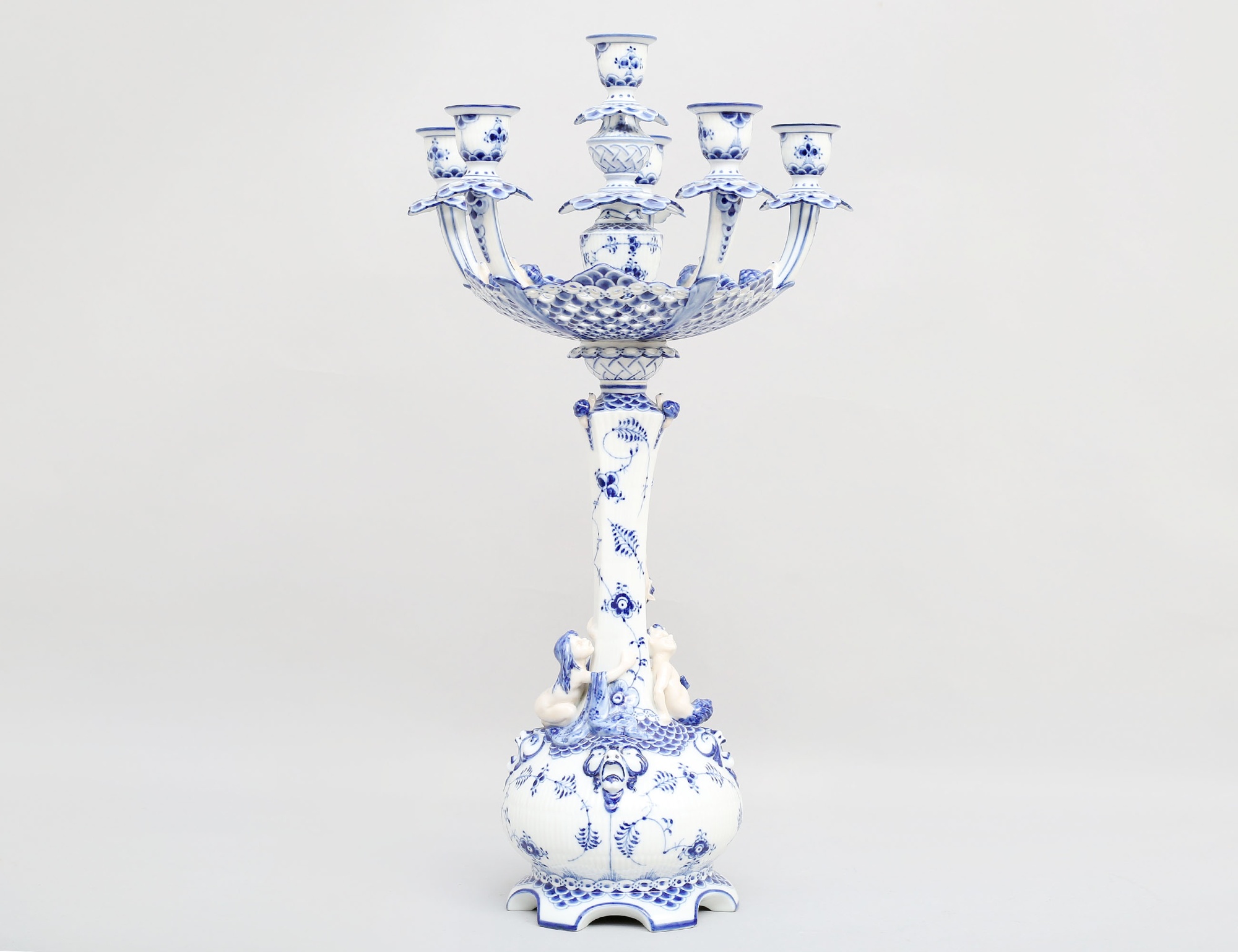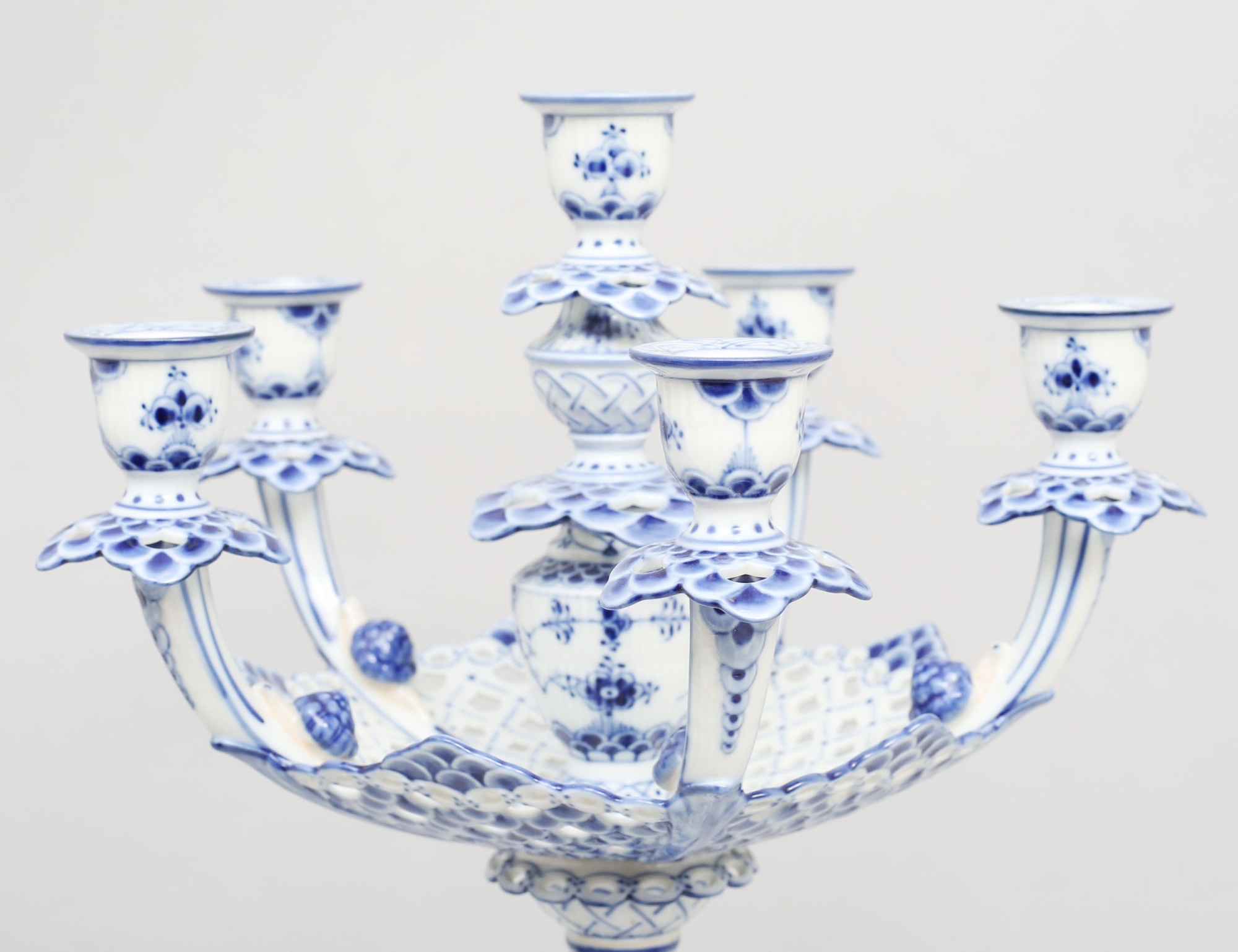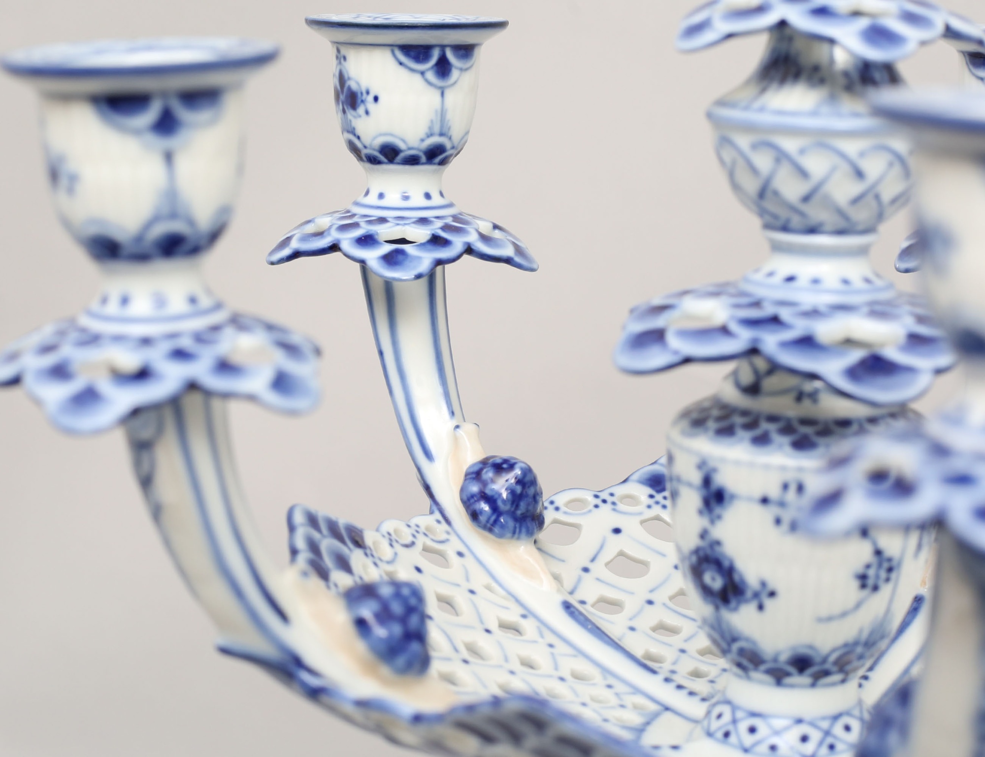 kandelaber modellnummer 1006, "Blue Fluted Full Lace", helblond, för sex ljus, dekor av bla. sniglar och fauner, 1:a sortering, höjd 55