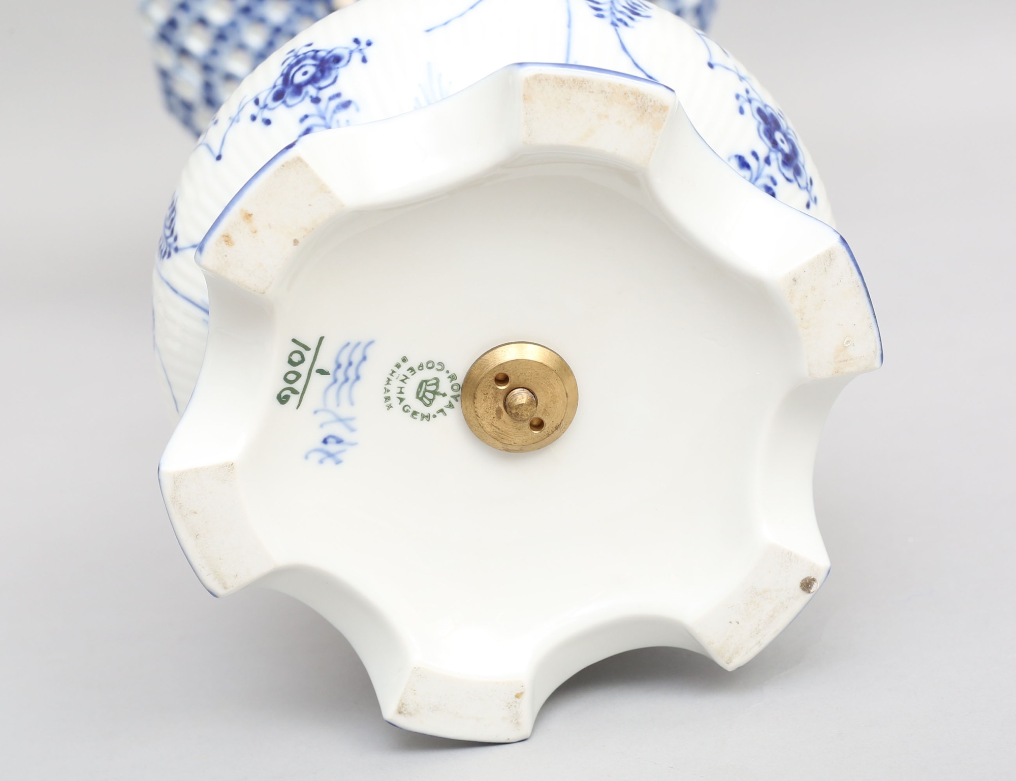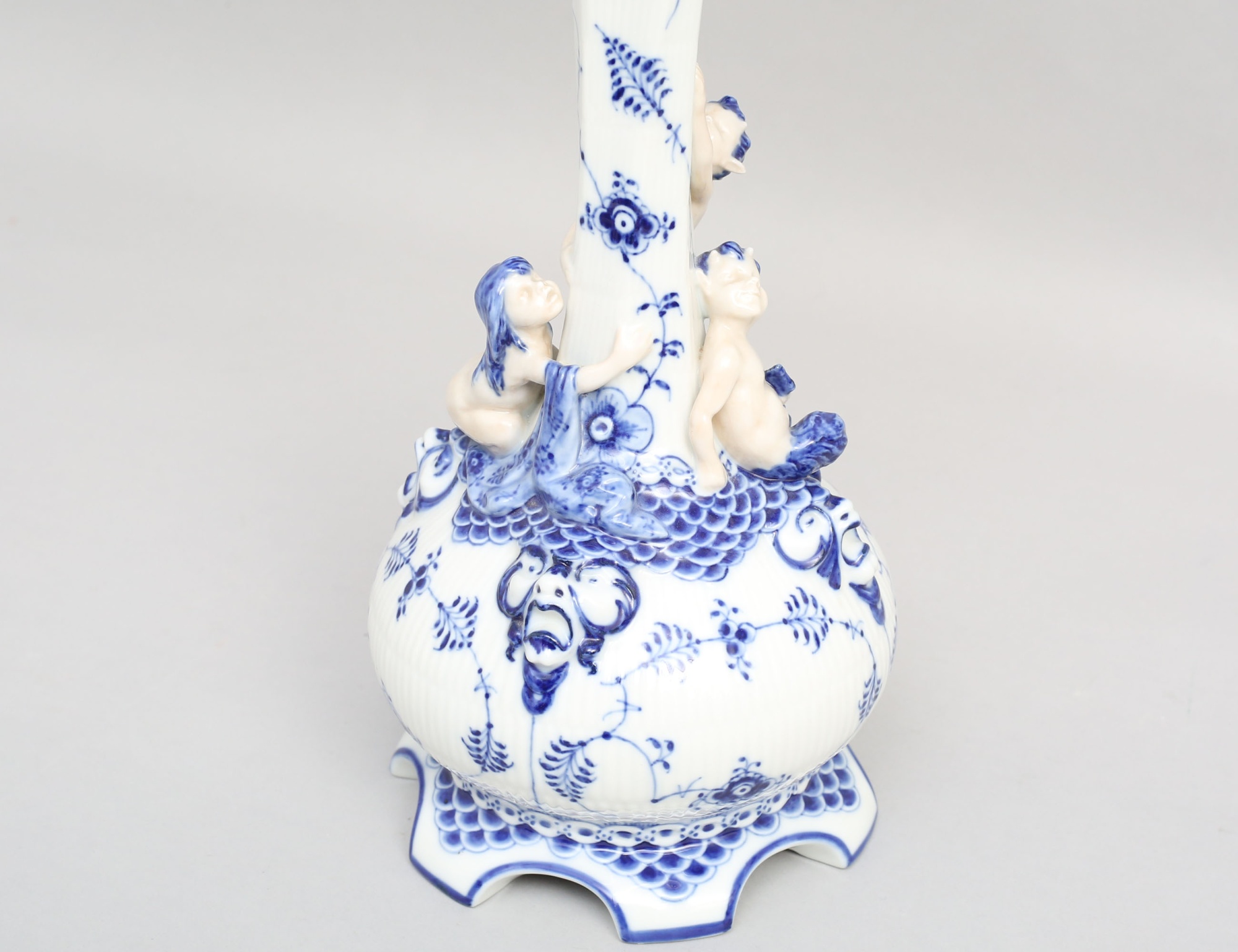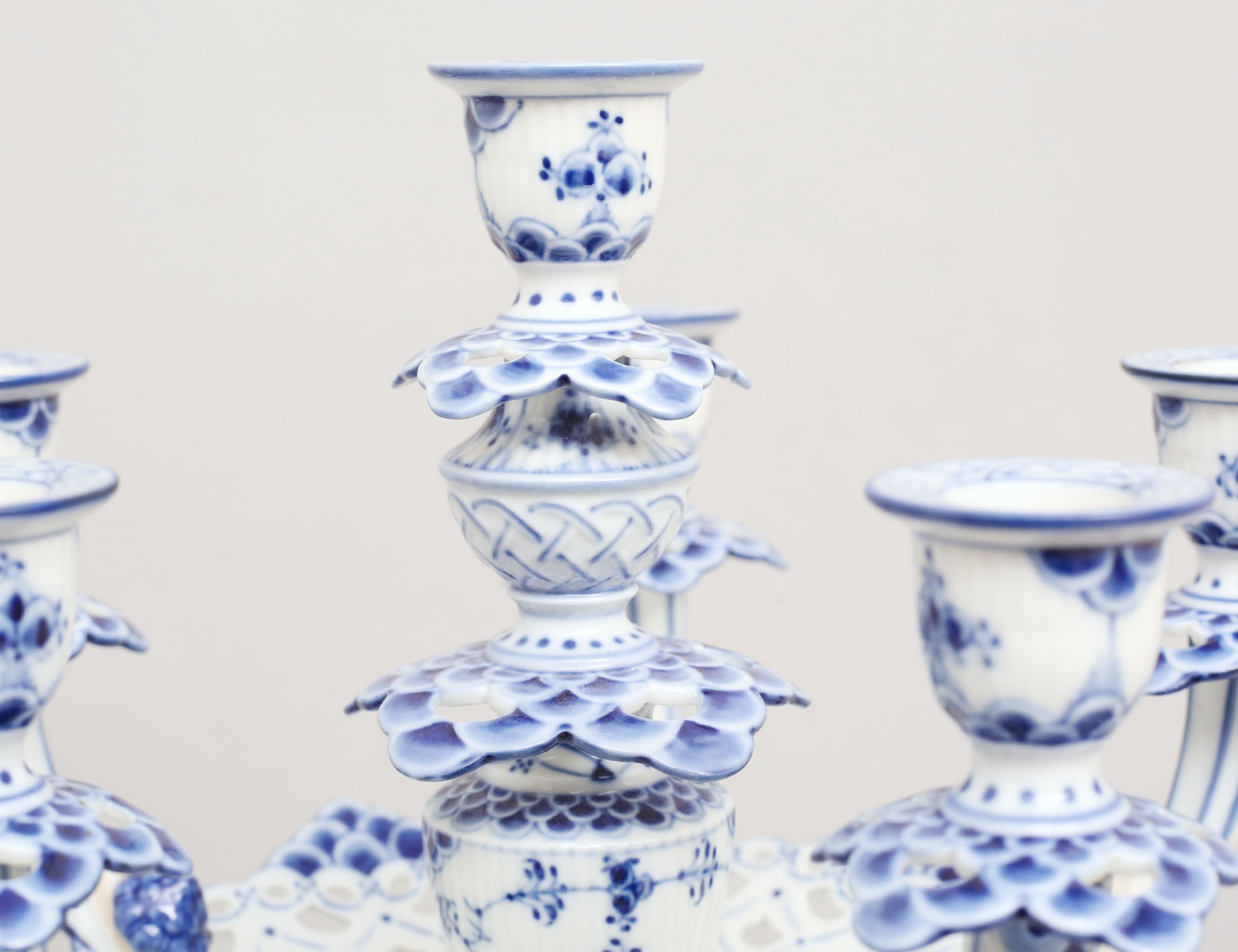 kandelaber modellnummer 1006, "Blue Fluted Full Lace", helblond, för sex ljus, dekor av bla. sniglar och fauner, 1:a sortering, höjd 55