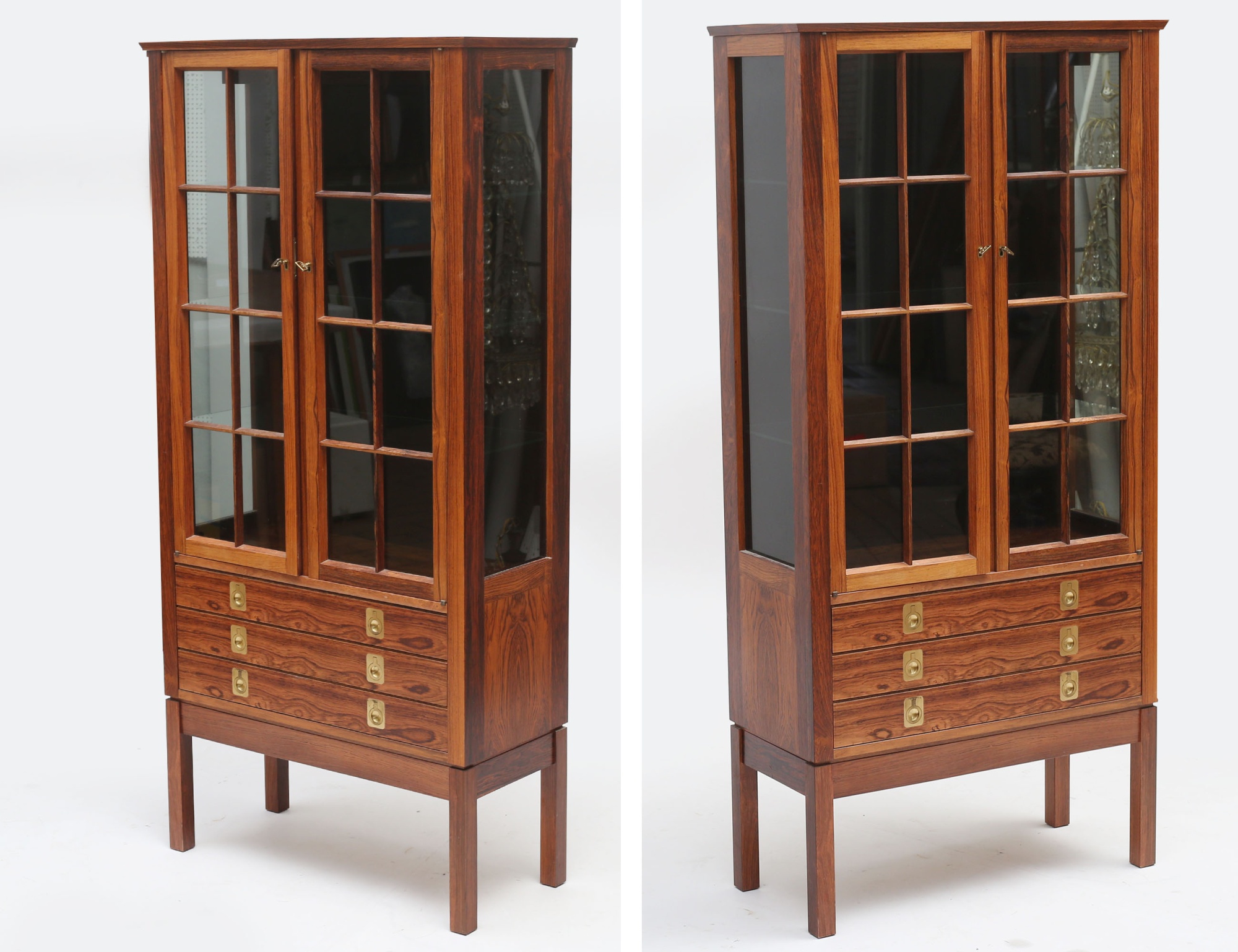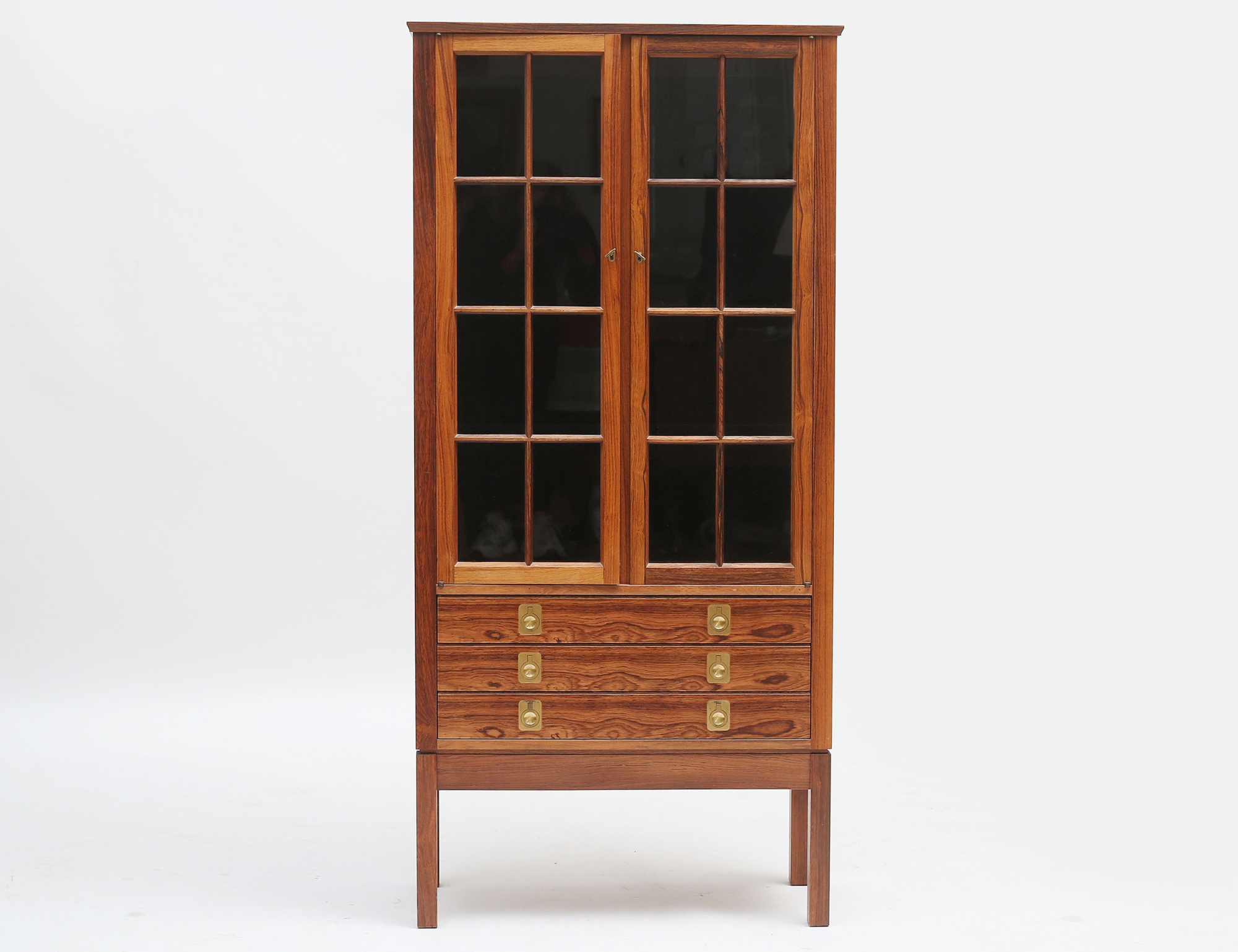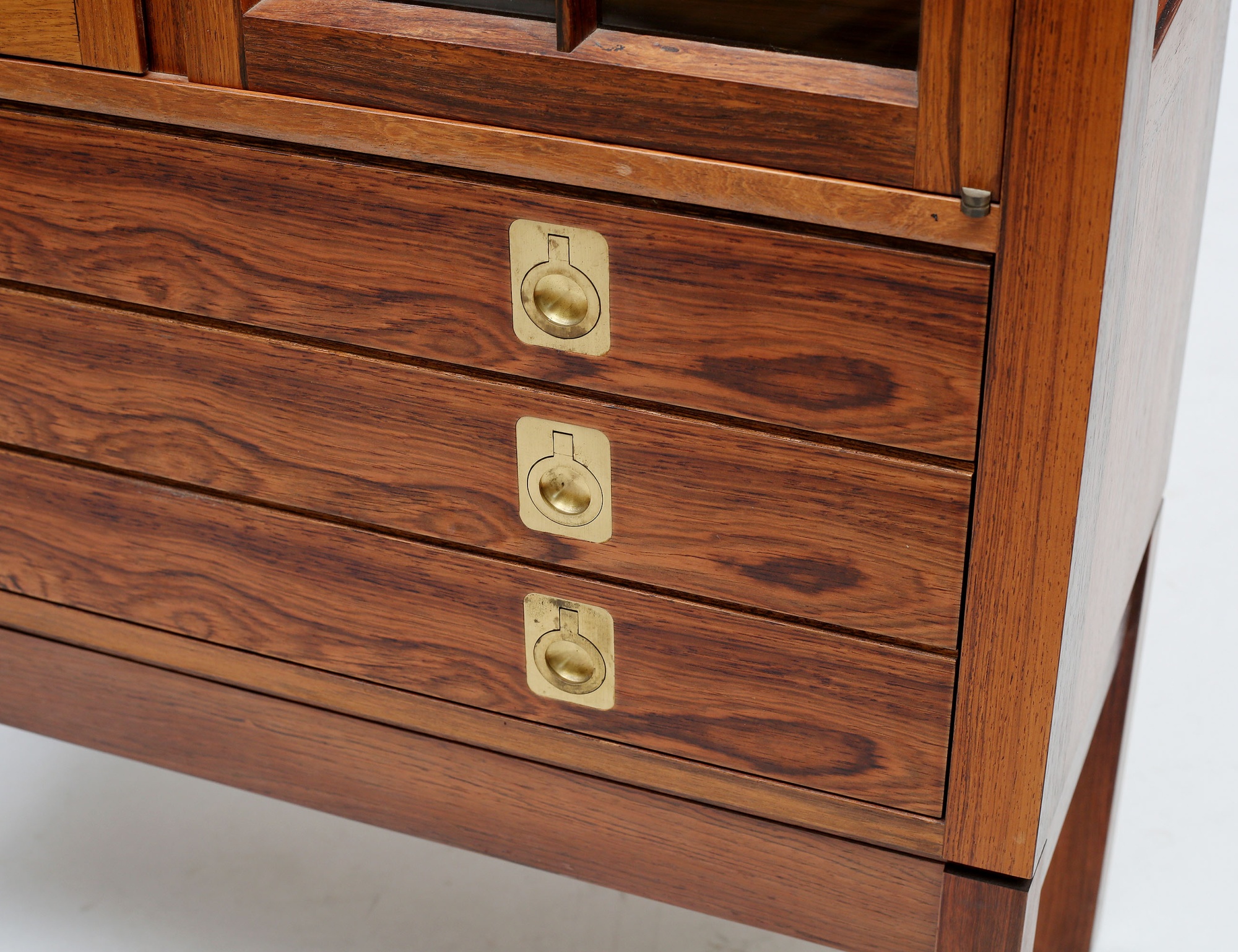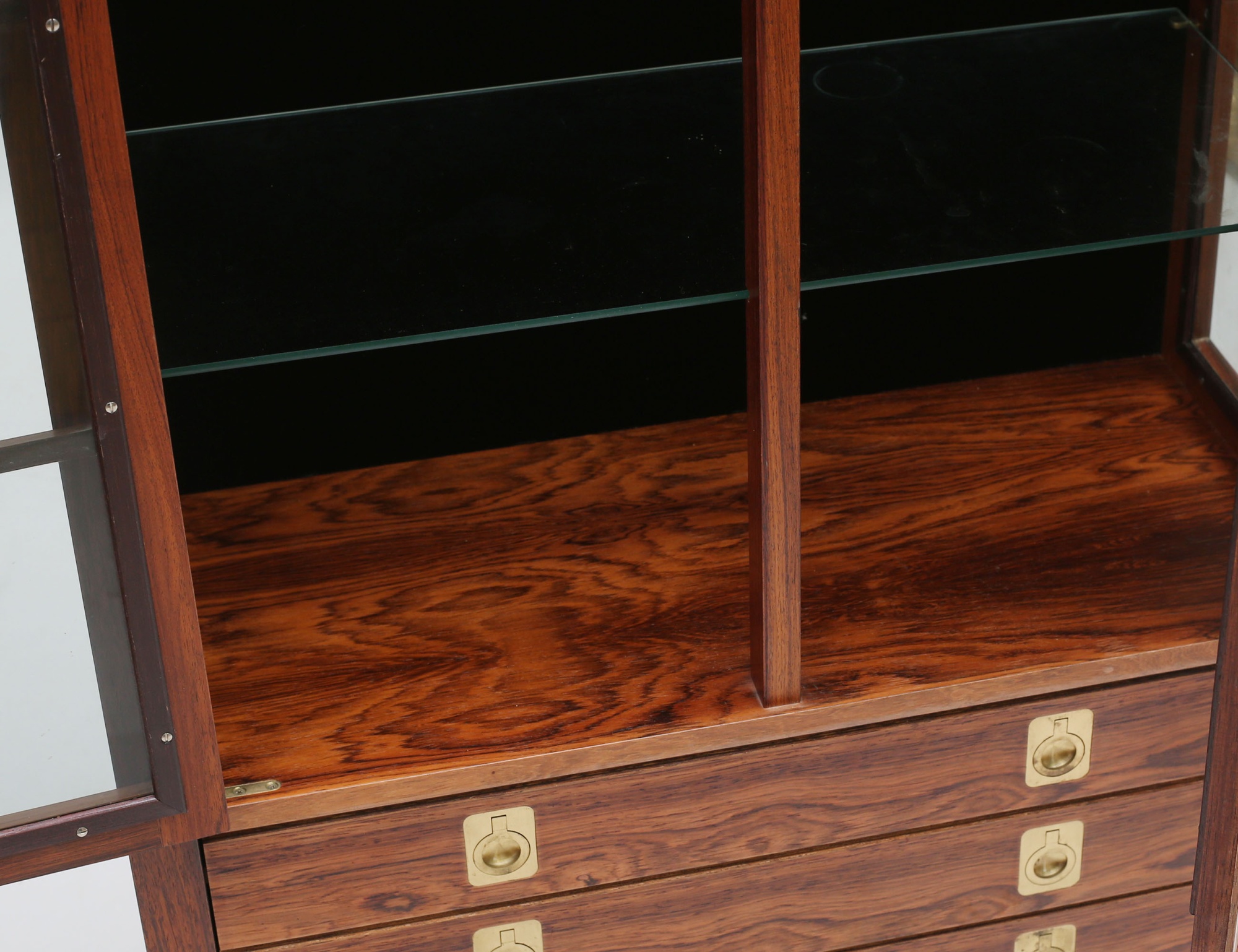 Torbjörn Afdal Bruksbo Norge, jakaranda, glasade spröjsade dörrar, tre hyllplan i glas, tre lådor med beslag i mässing, invändig belysning, citesintyg medföljer, höjd 150, bredd 72, djup 32