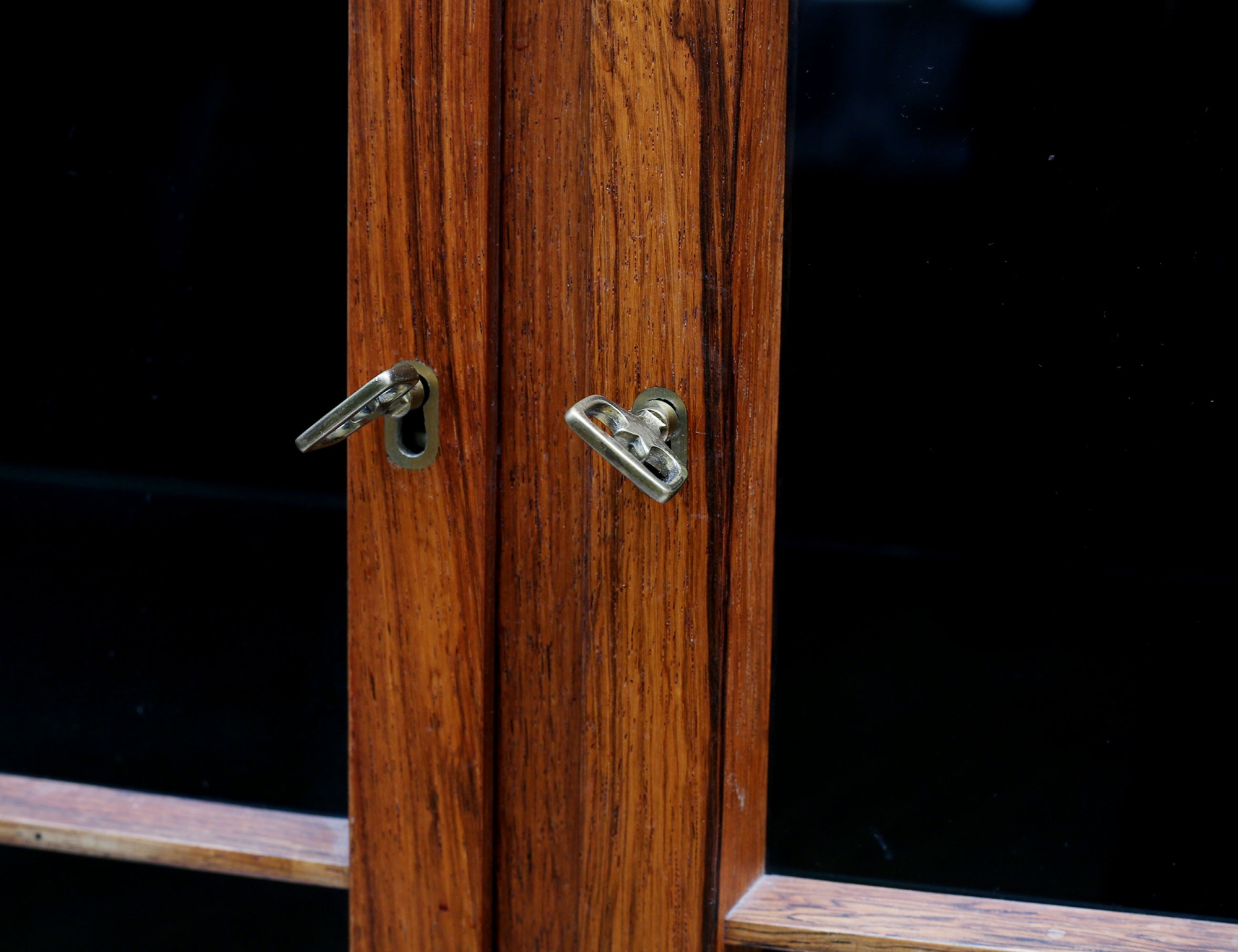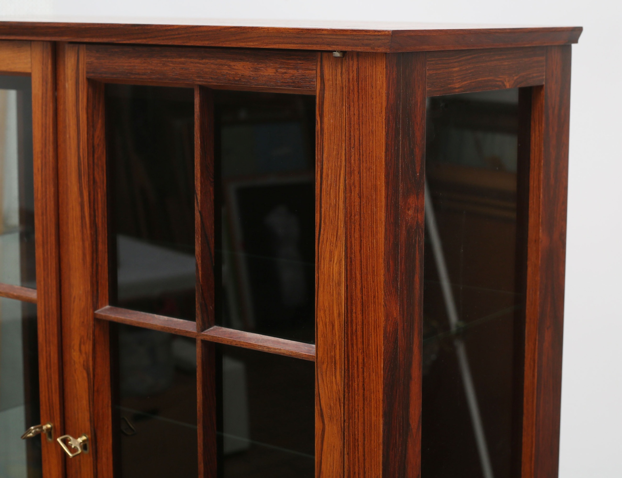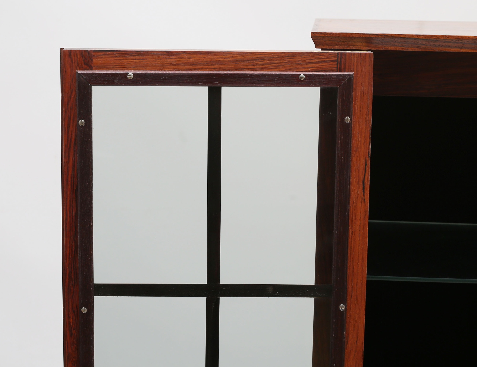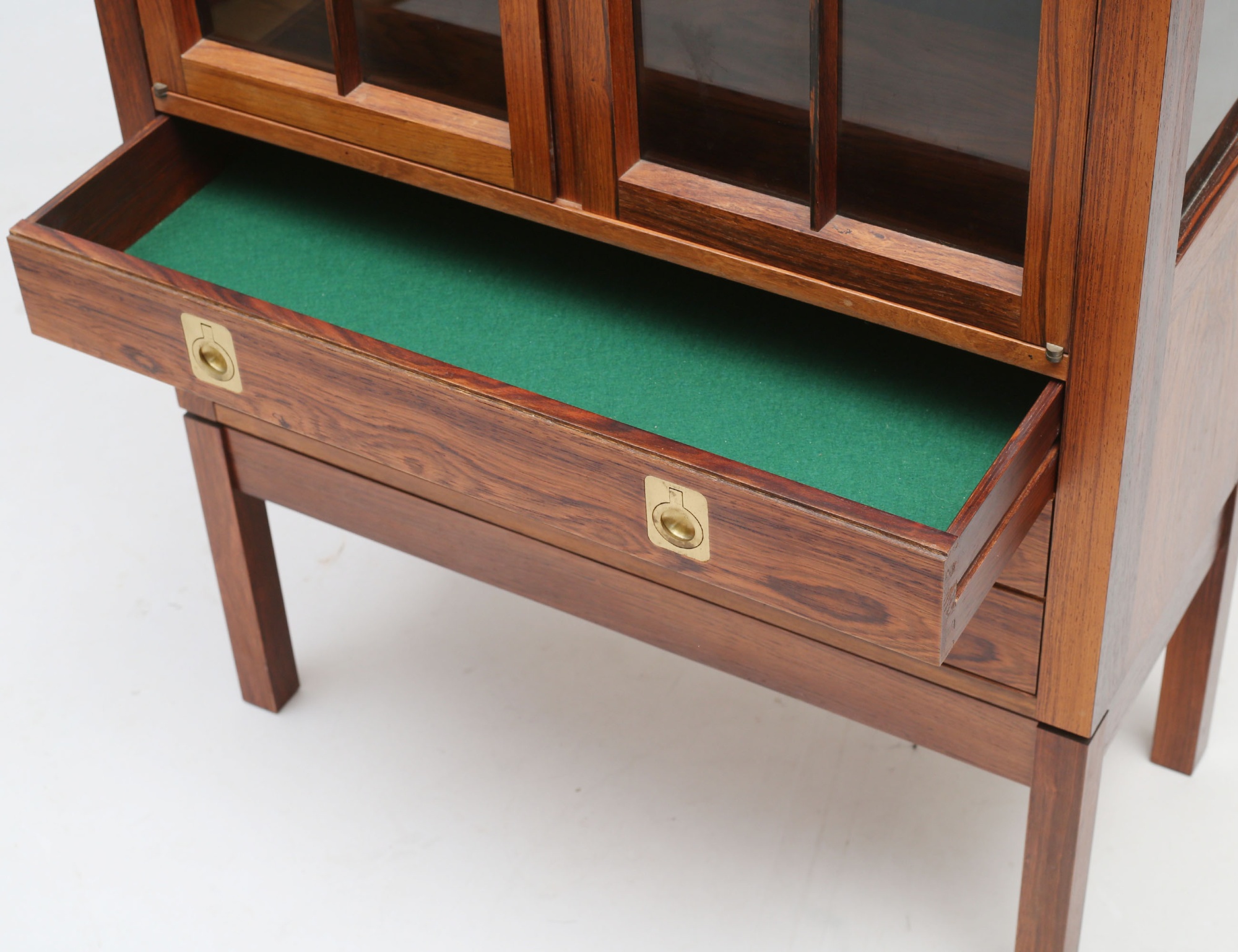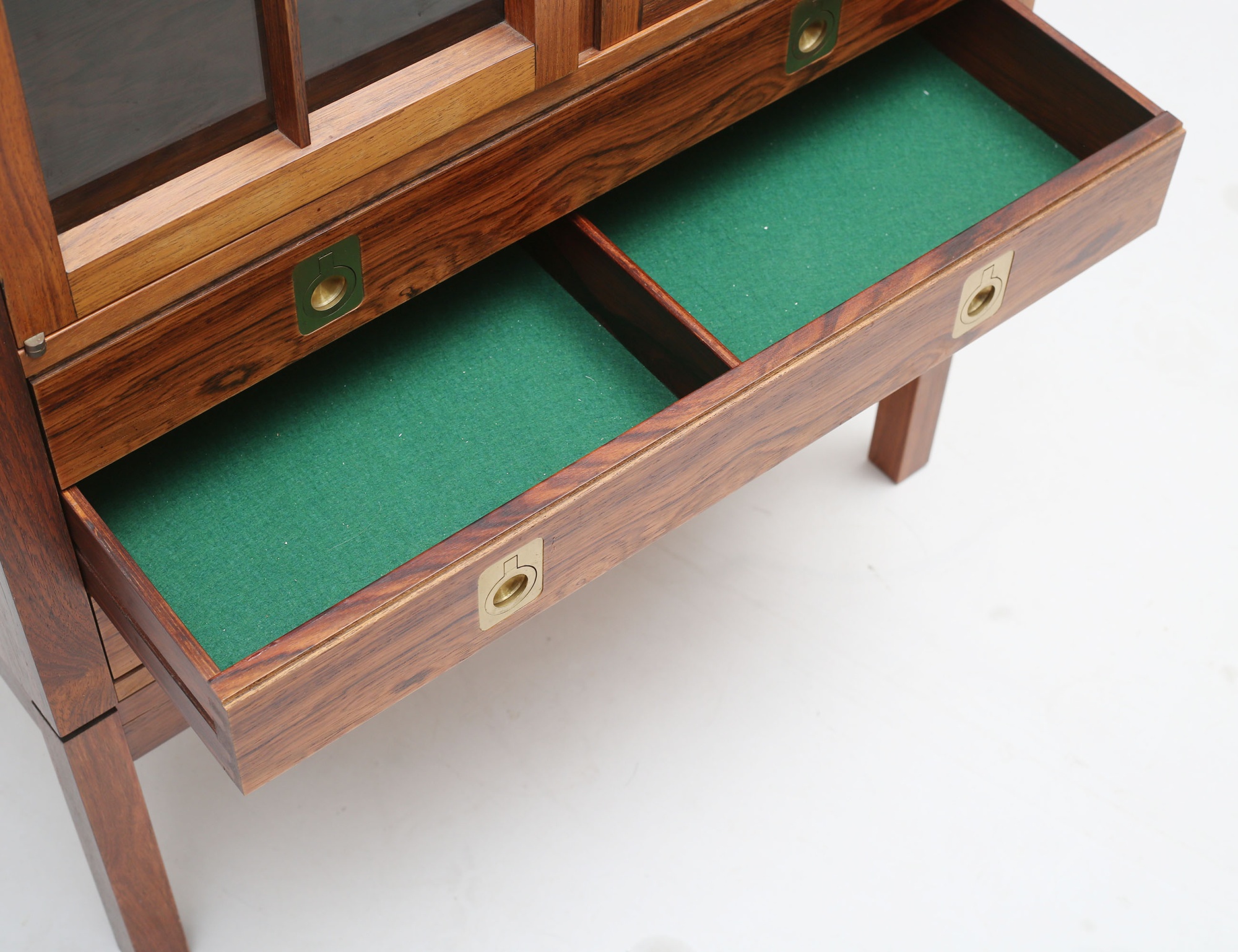 Torbjörn Afdal Bruksbo Norge, jakaranda, glasade spröjsade dörrar, tre hyllplan i glas, tre lådor med beslag i mässing, invändig belysning, citesintyg medföljer, höjd 150, bredd 72, djup 32