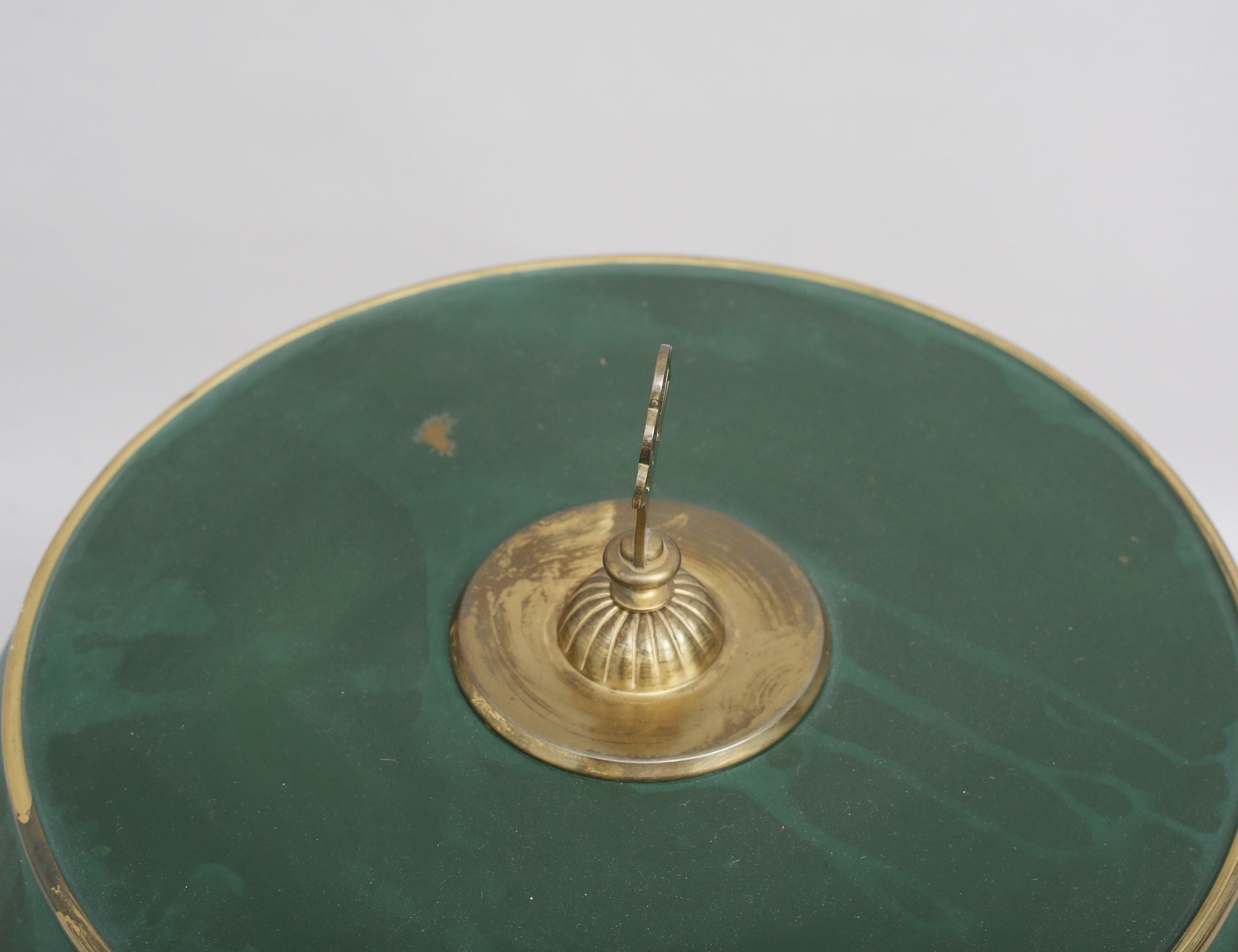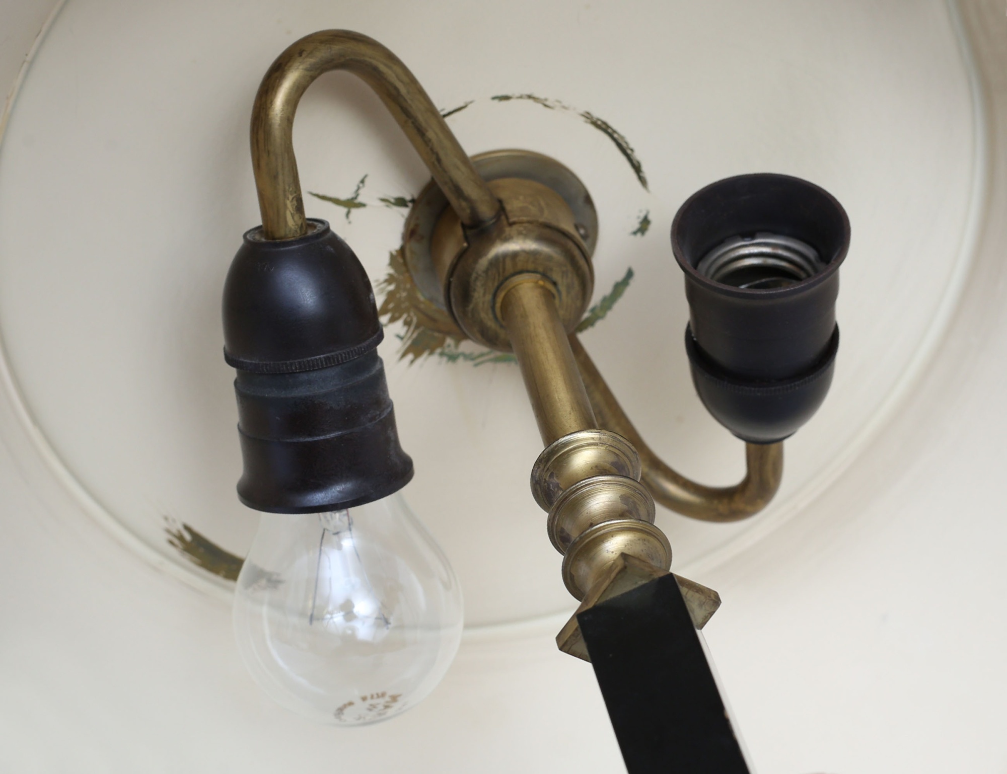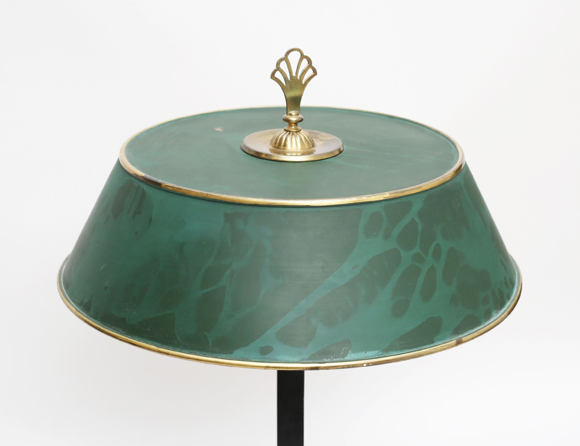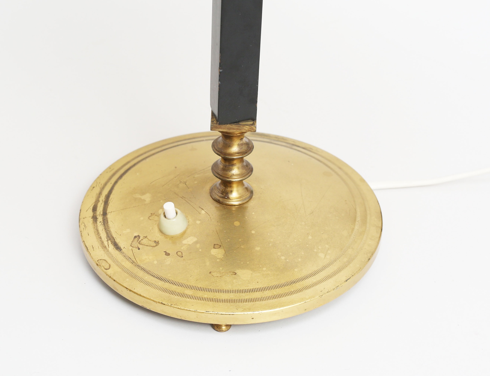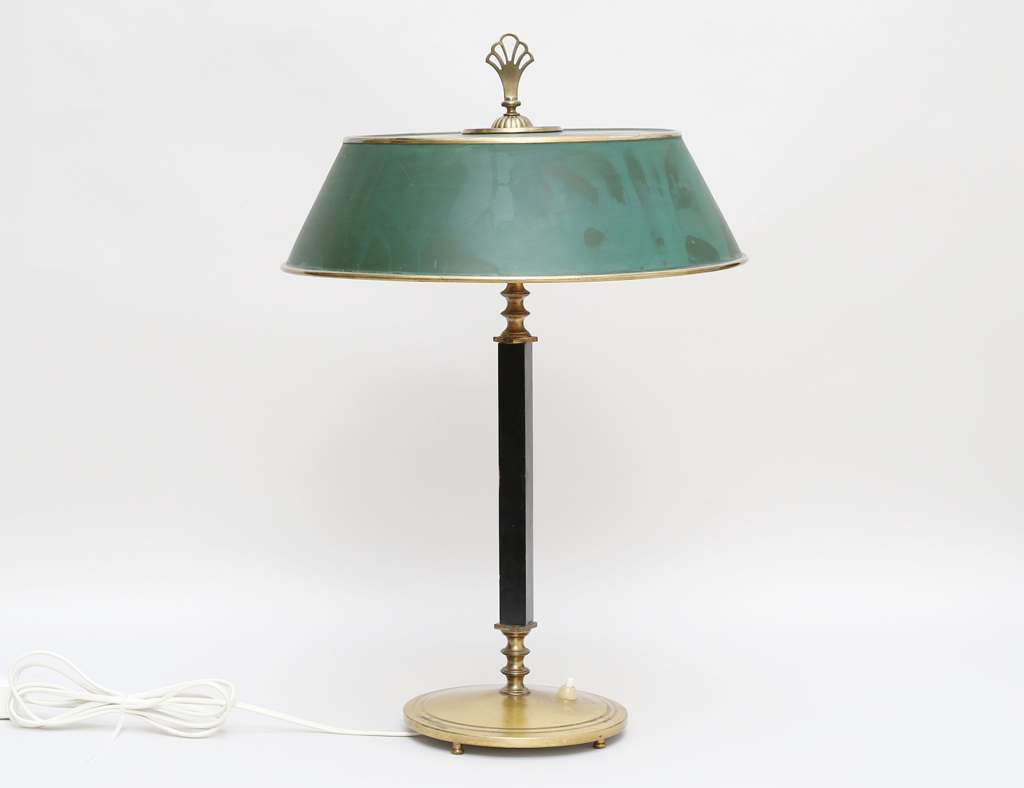 Arvid Böhlmarks Lampfabrik modell 6942, mässing, stam i svarvad mässing samt svärtat trä, grönlackerad skärm, funktionstestad, höjd 54 (bruksslitage/fläckar)
