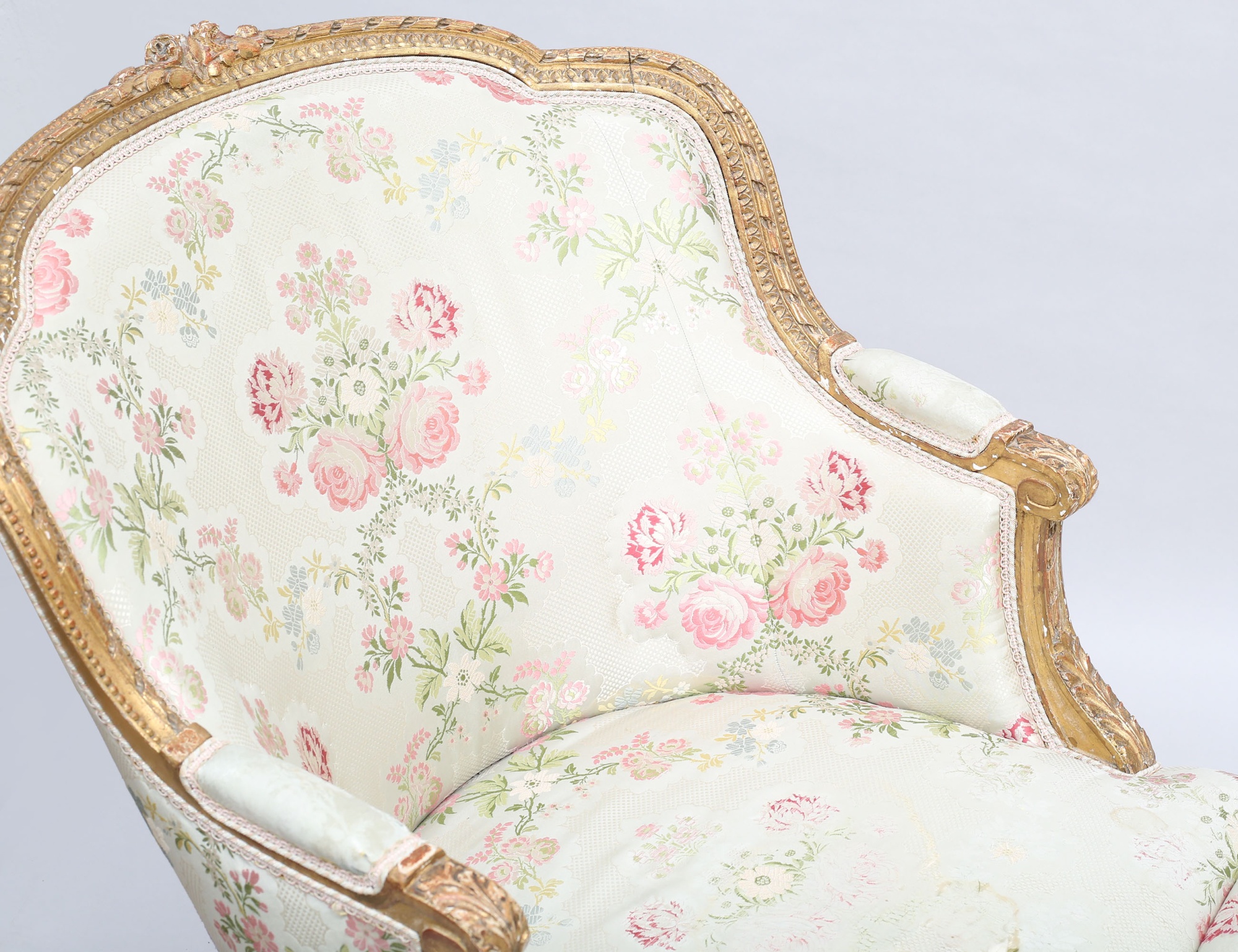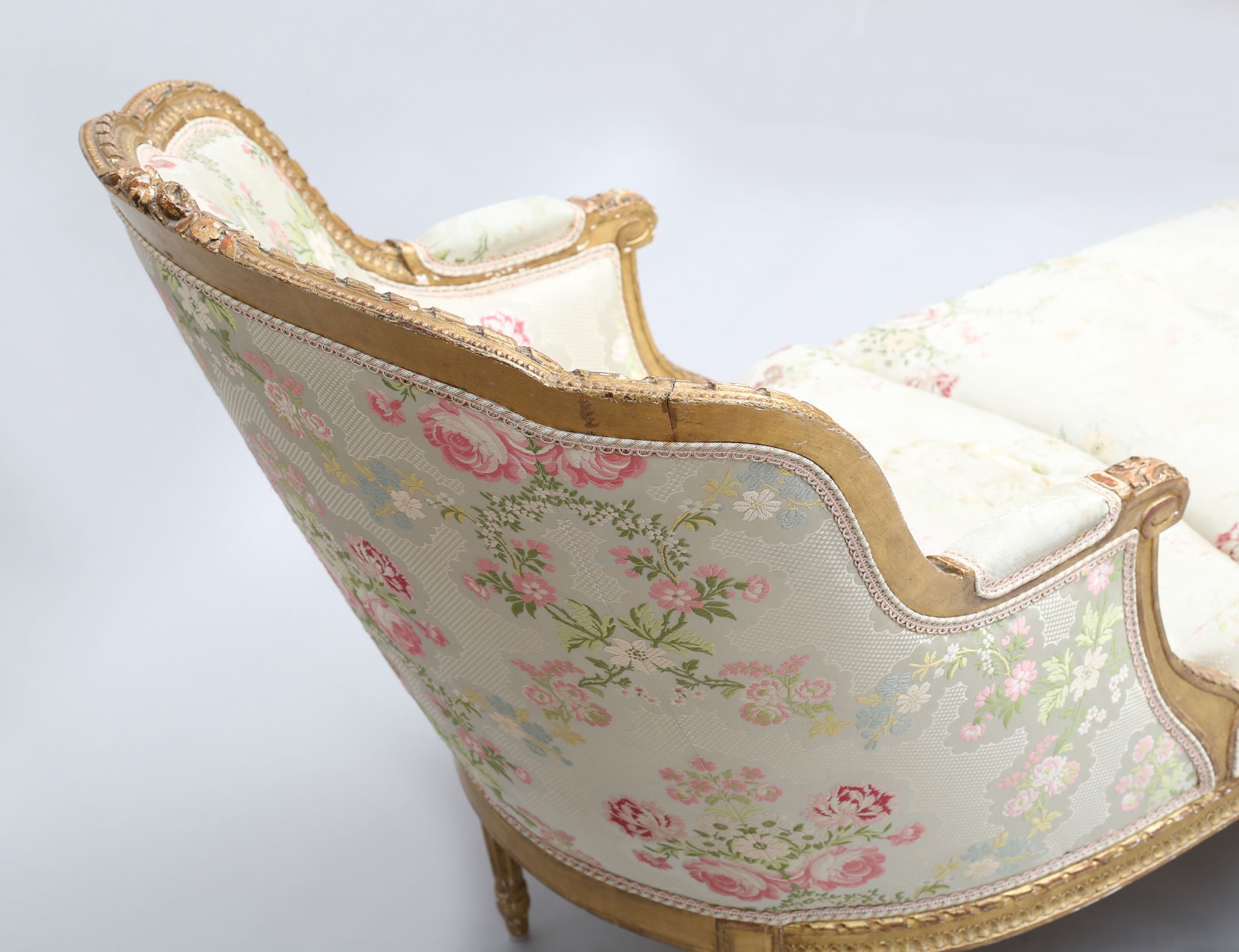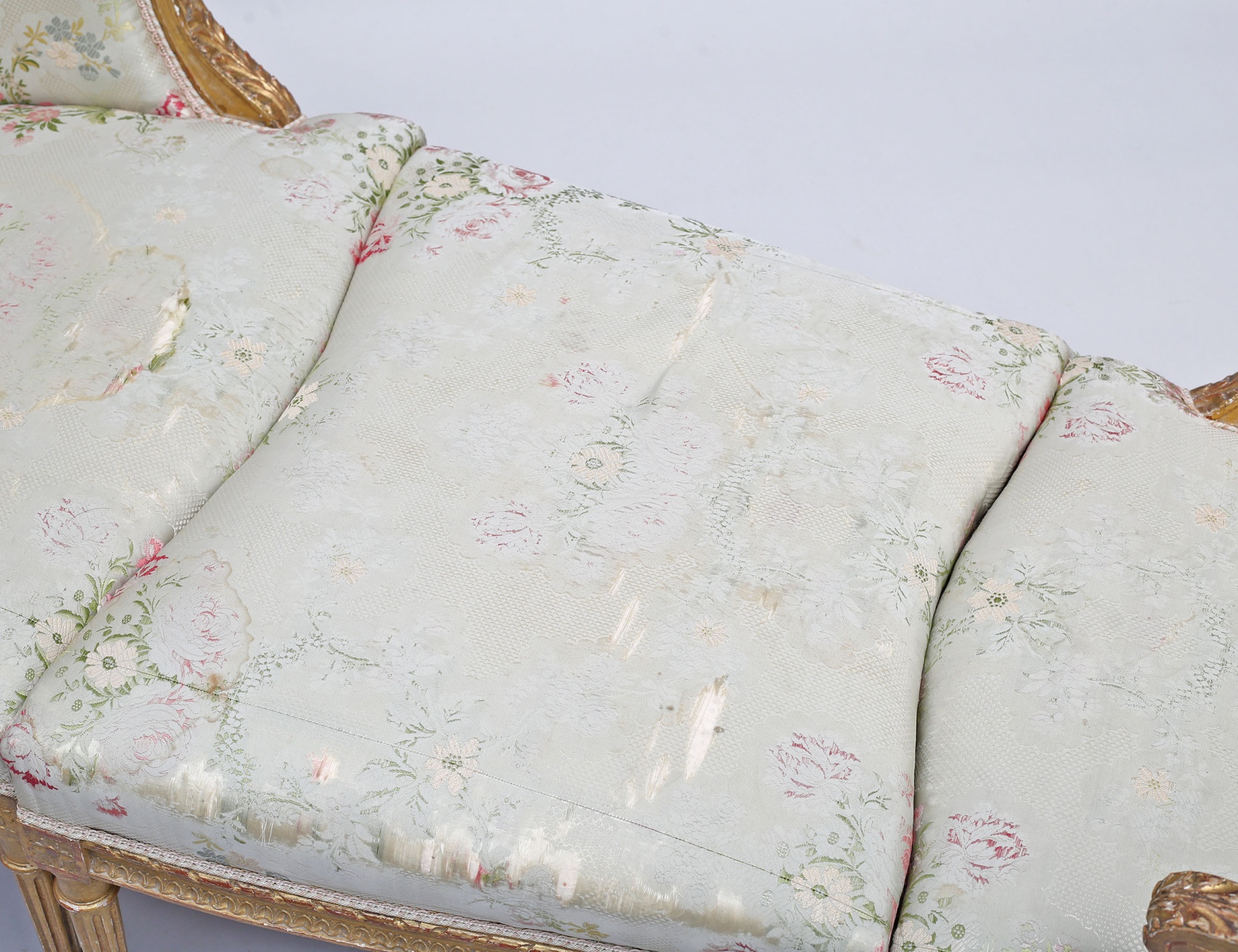 Frankrike sent 1800-tal, träskuren och förgylld dekor, runda avsmalnande ben med kannelyr, fast stoppning, 3 delar, höjd 88, längd 195, bredd 72 (sidenklädsel med skador/fläckar)