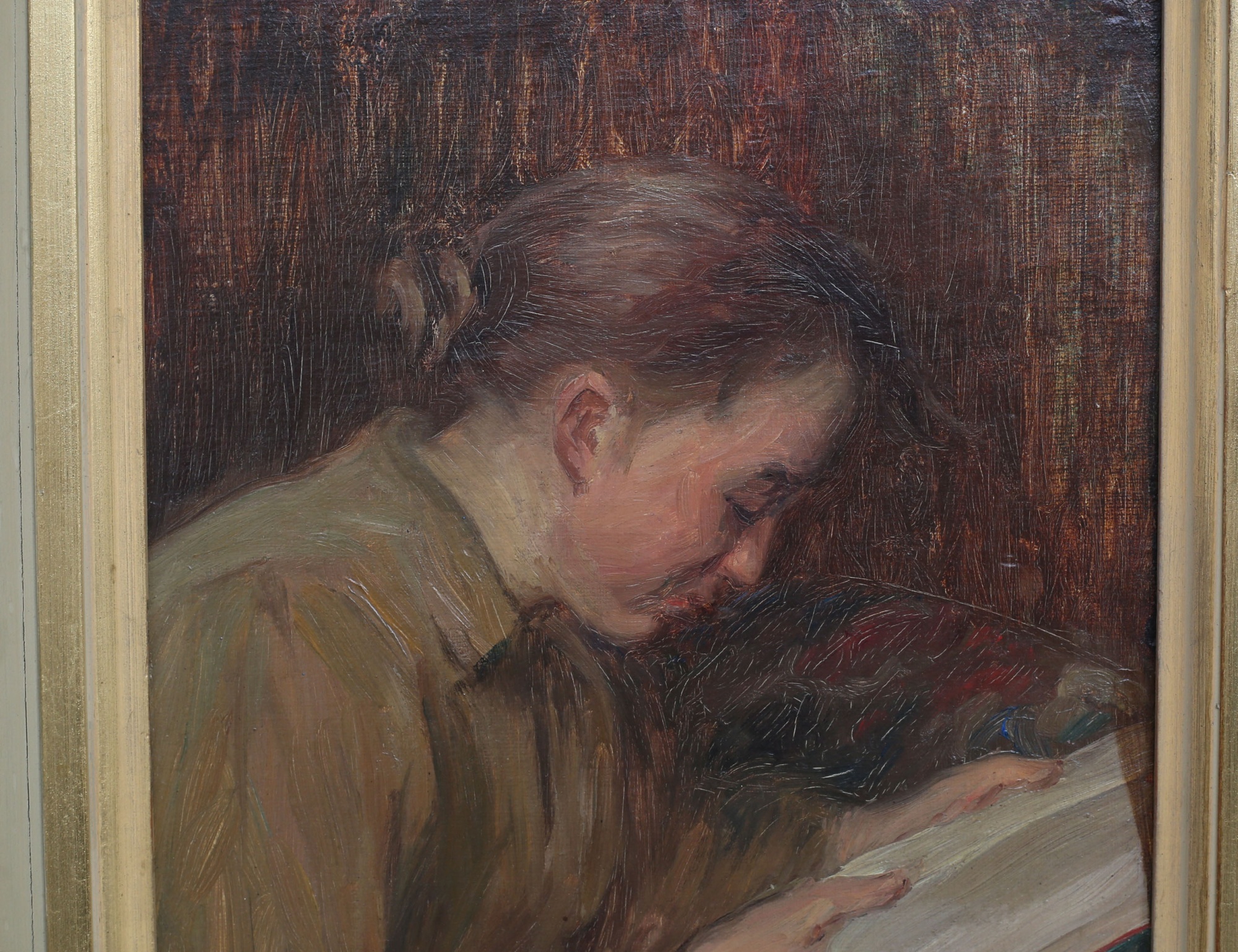 oljemålning på pannå, kvinna med bok, signerad atergo, 33x24, rammått 44x35
