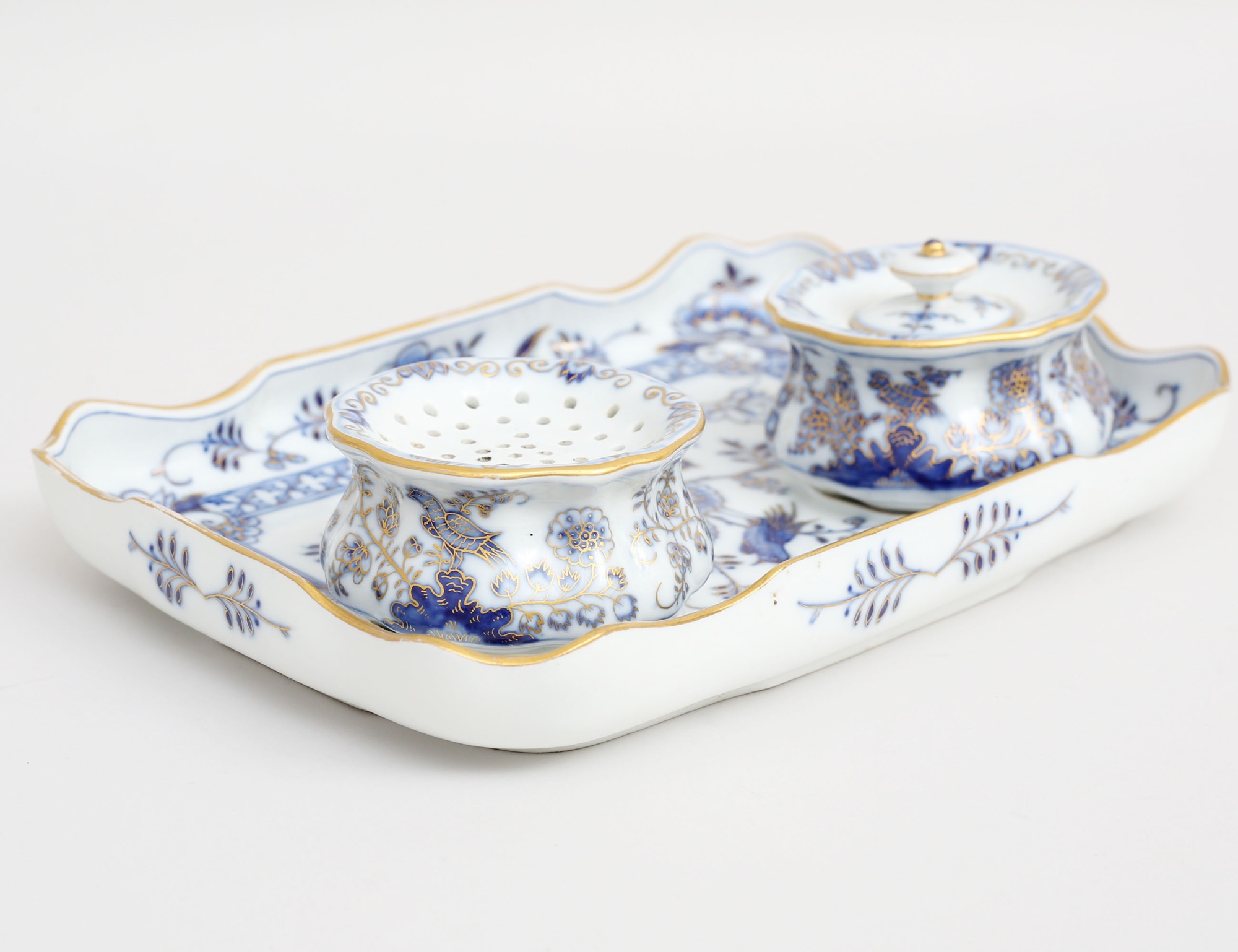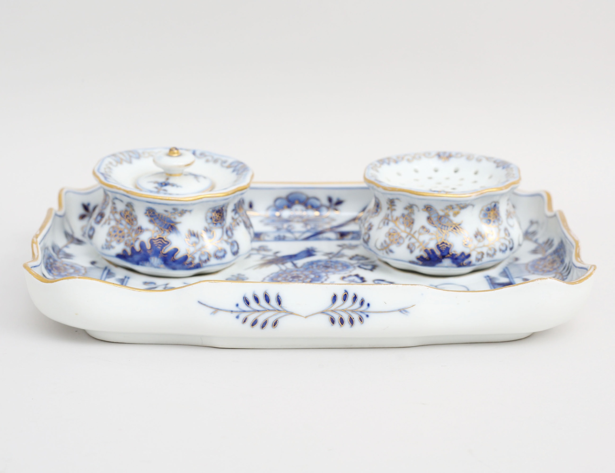 blåvit underglasyrdekor av fåglar och blommor, delvis förgylld, två lösa delar på bricka, bredd 22x15