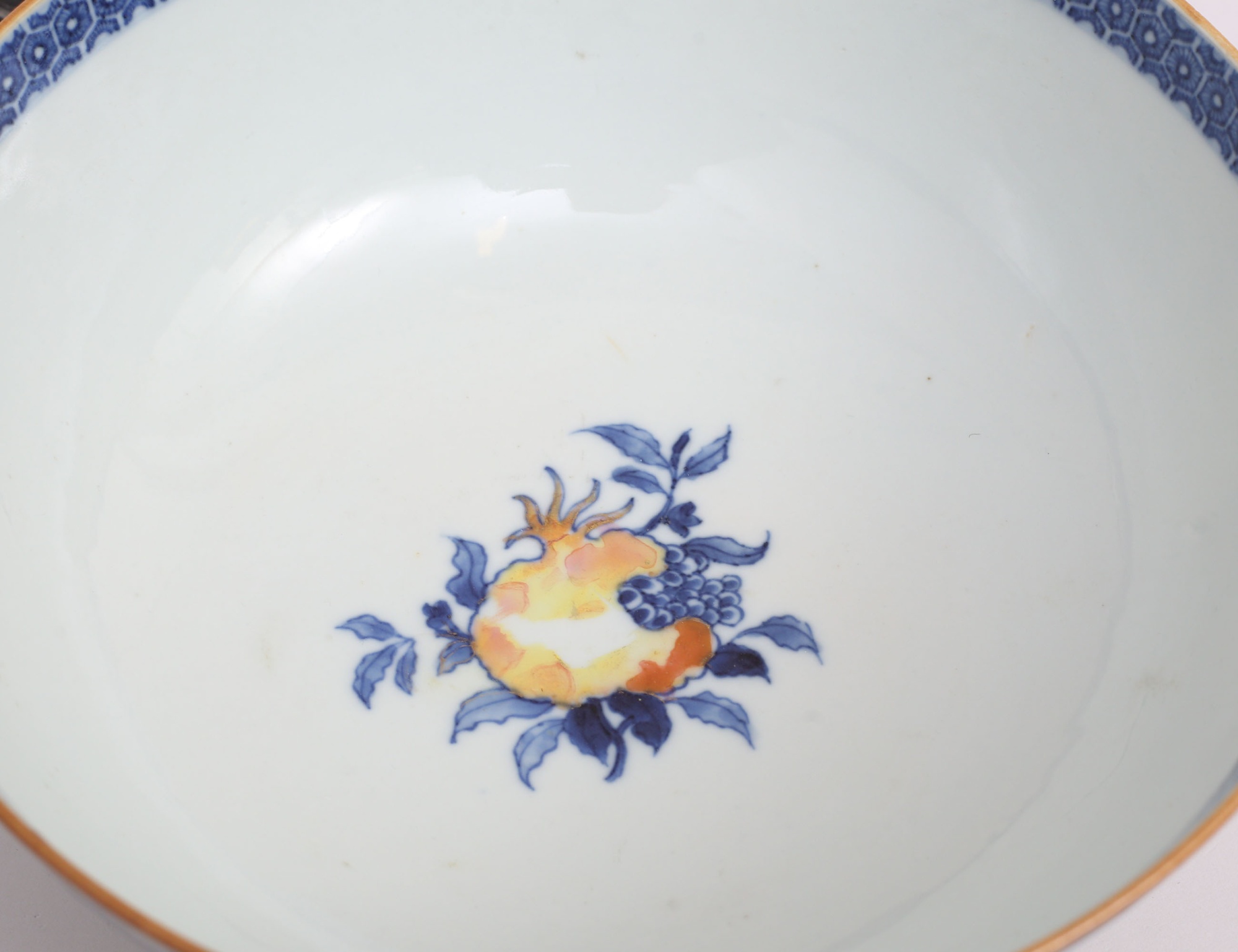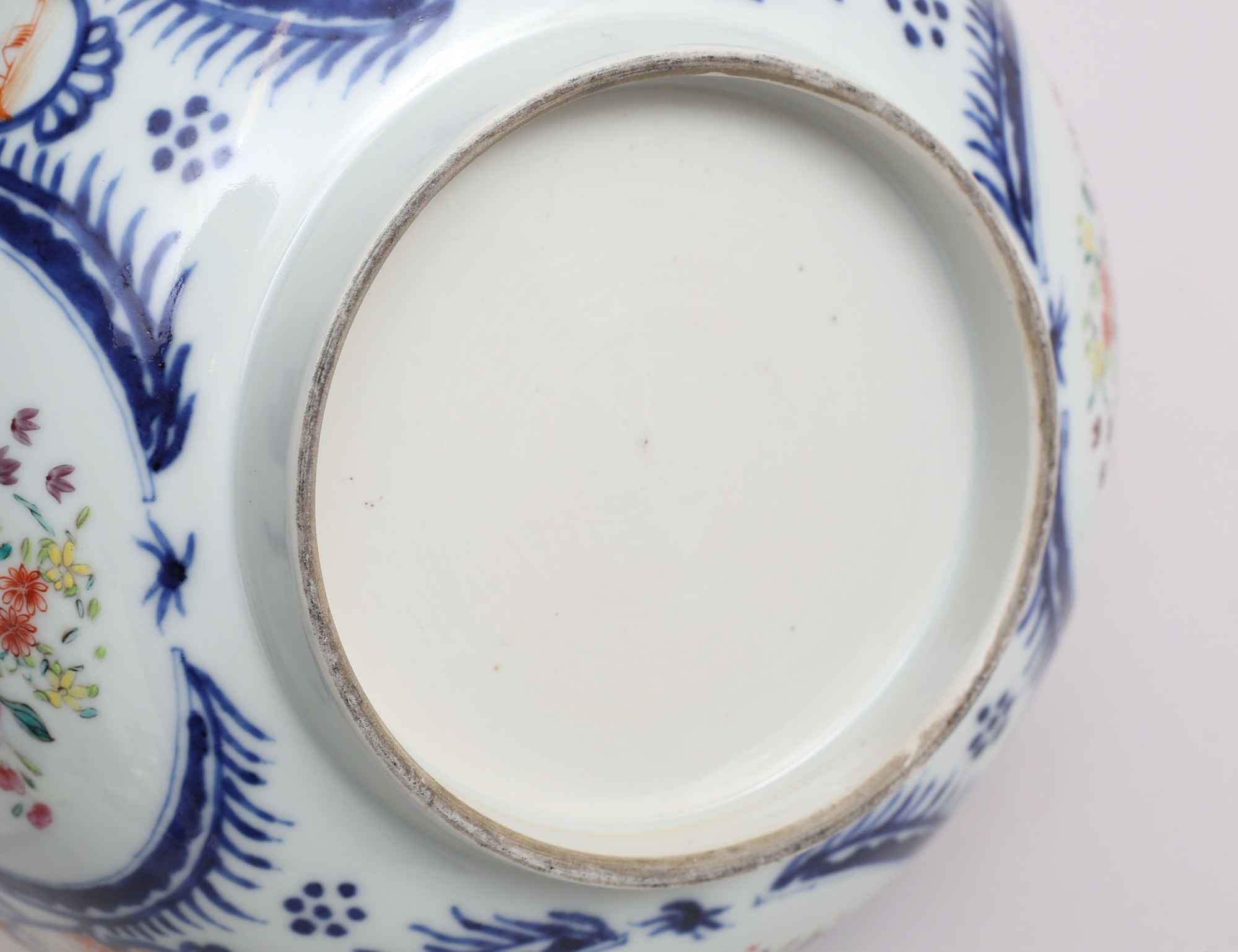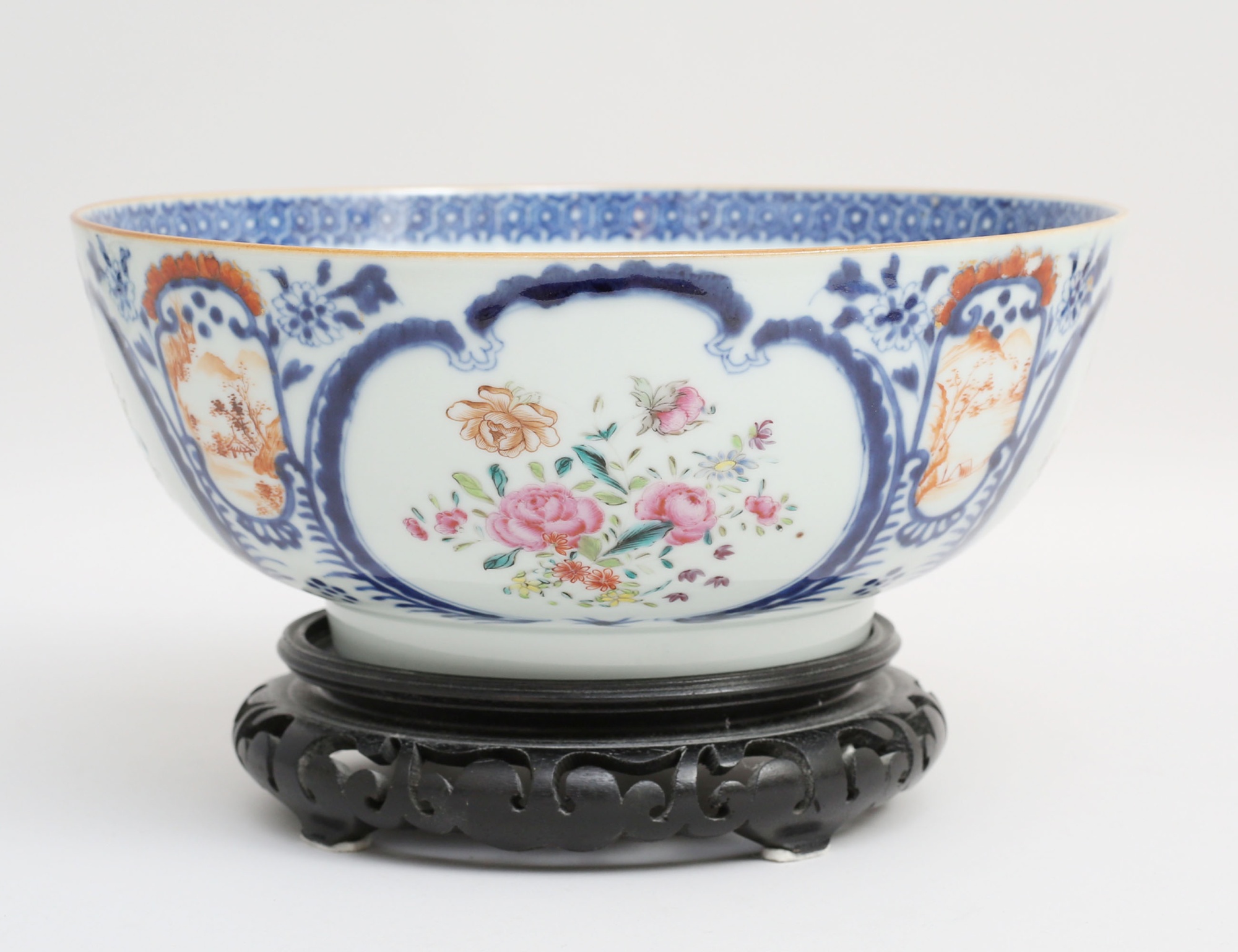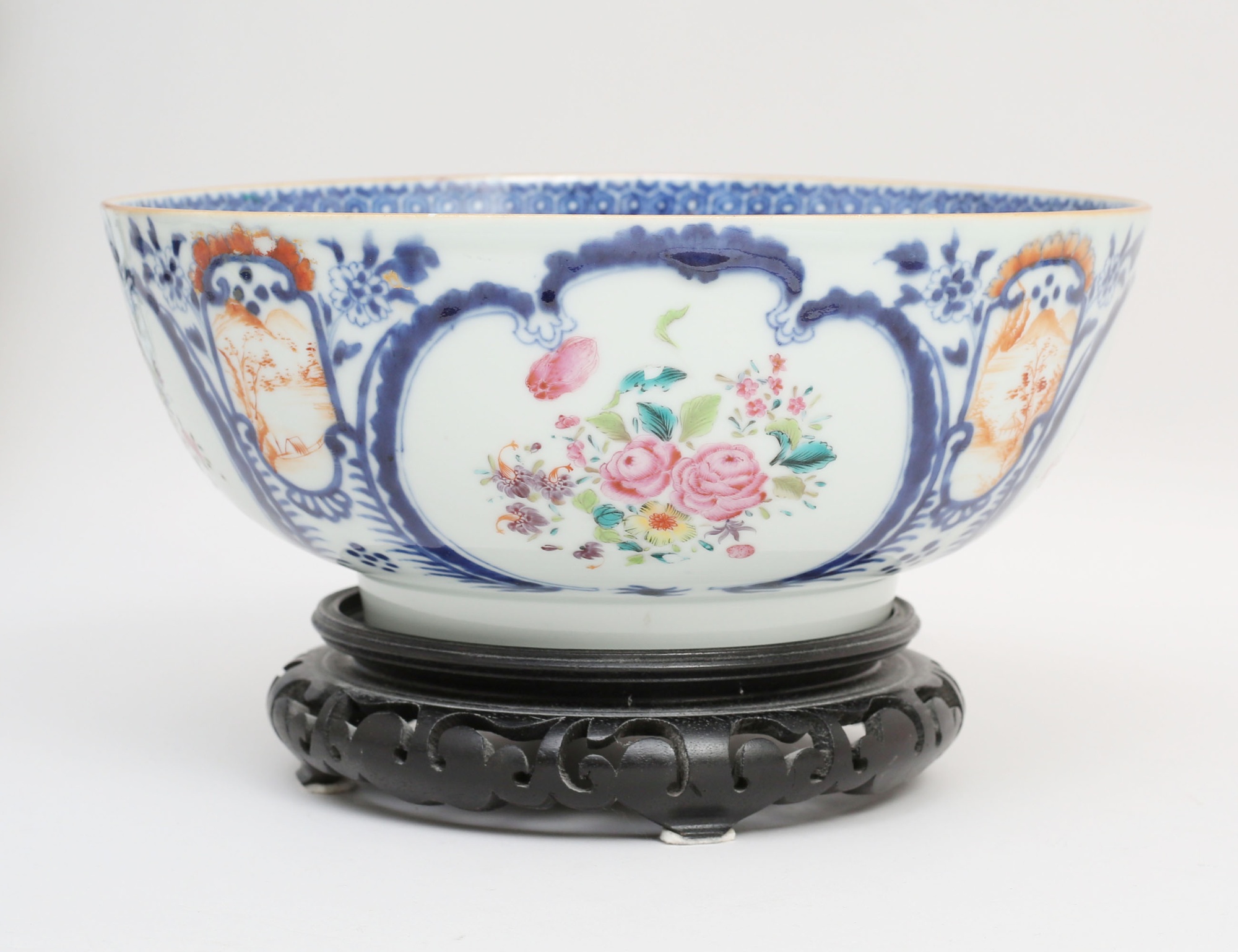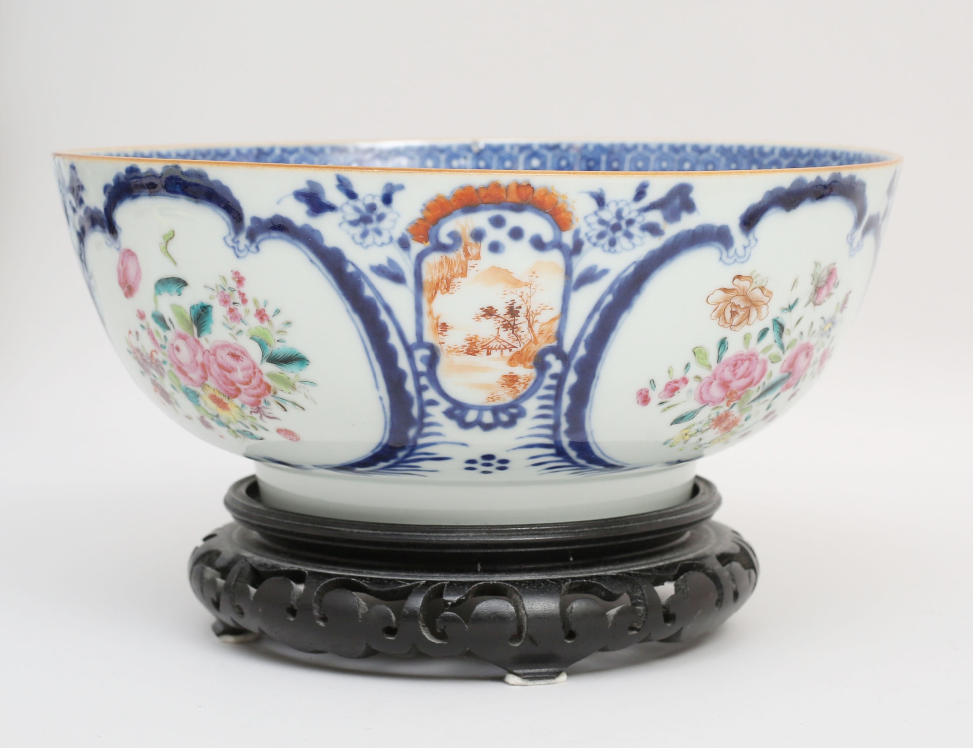 Qianlong 1736-1795, famille rose och underglasyrblått, dekor av bla. blommor i rocailleformationer, granatäpple och landskap, senare sockel i rosenträ, höjd 11(15), diameter 26 (spår av förgyllning, smärre glasyrbortfall)