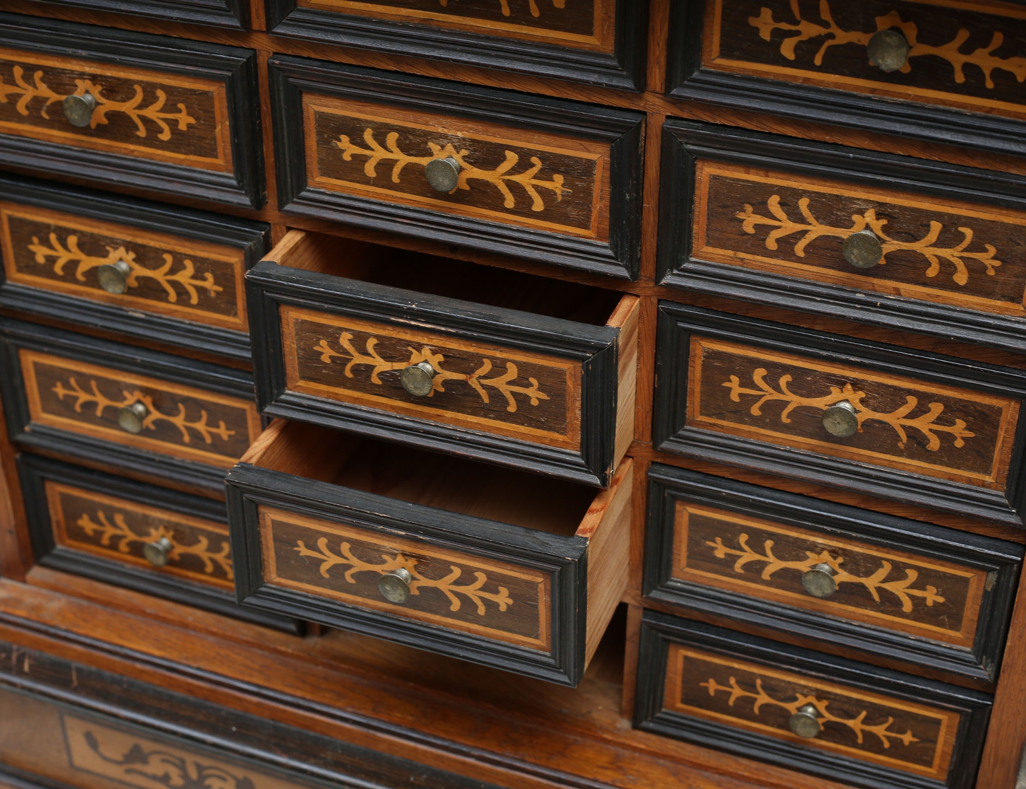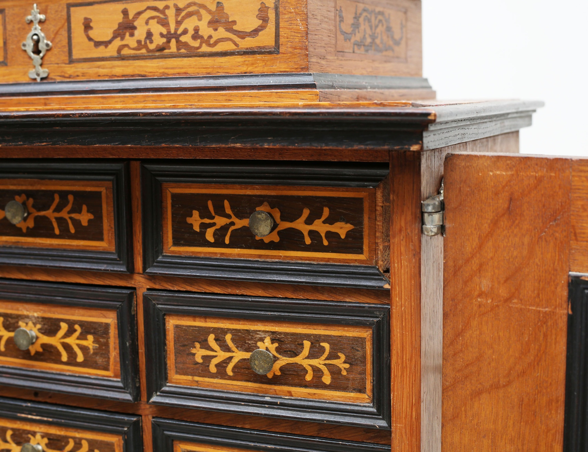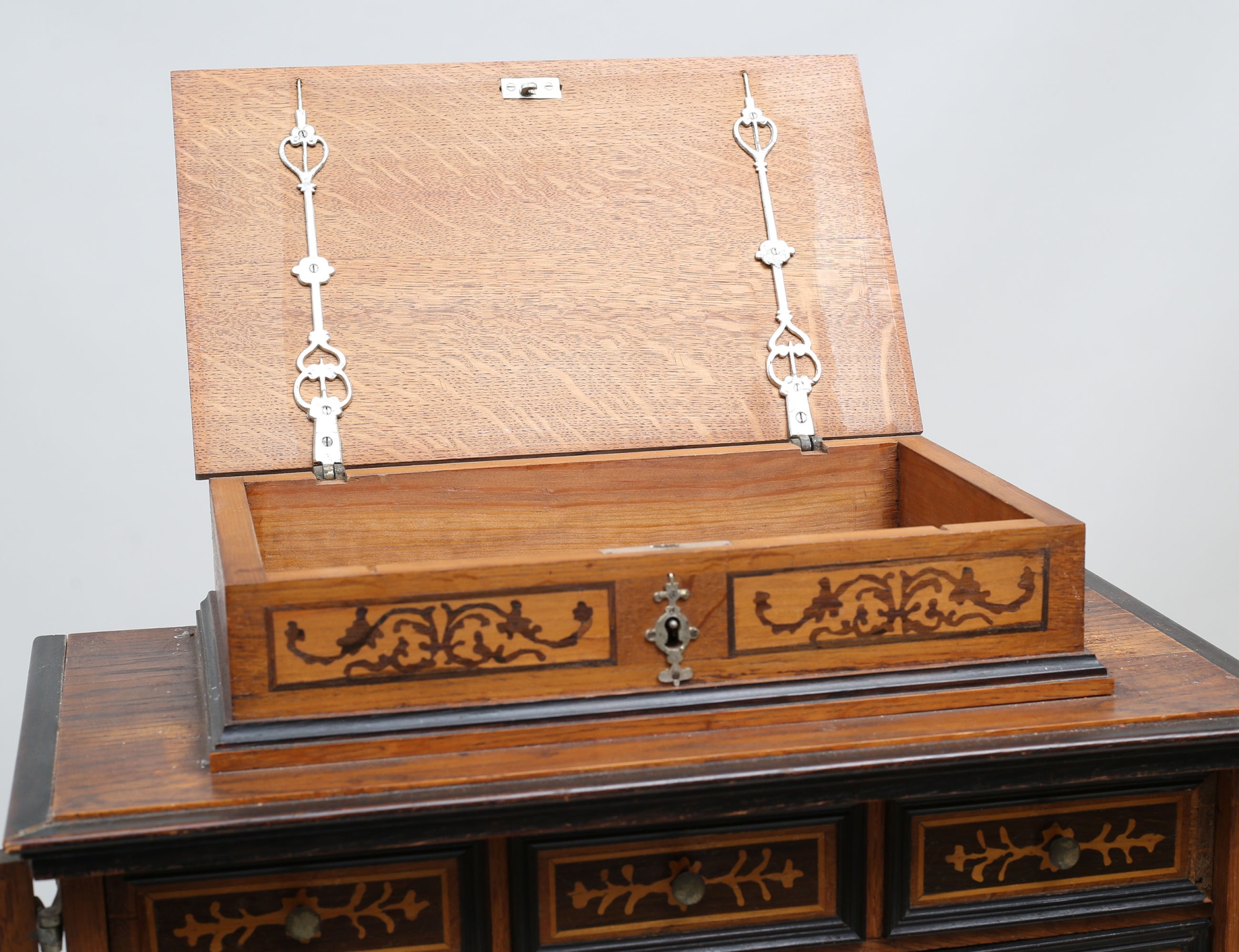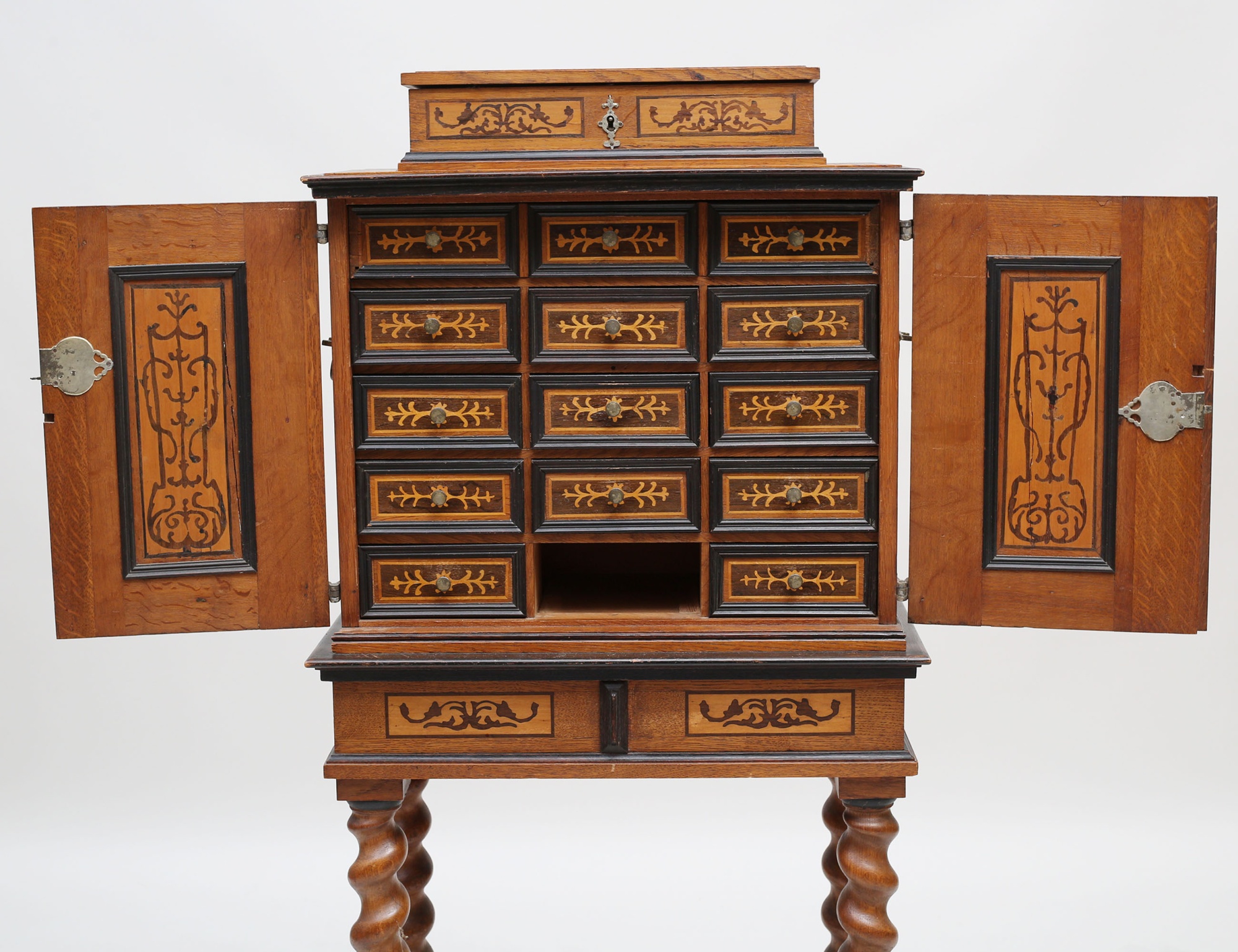 ek med intarsia, överdel med skrin, mellanparti med 15 lådor, spiralsvarvad benställning, höjd 132, bredd 57, djup 30 (lister, en låda samt nyckel saknas)