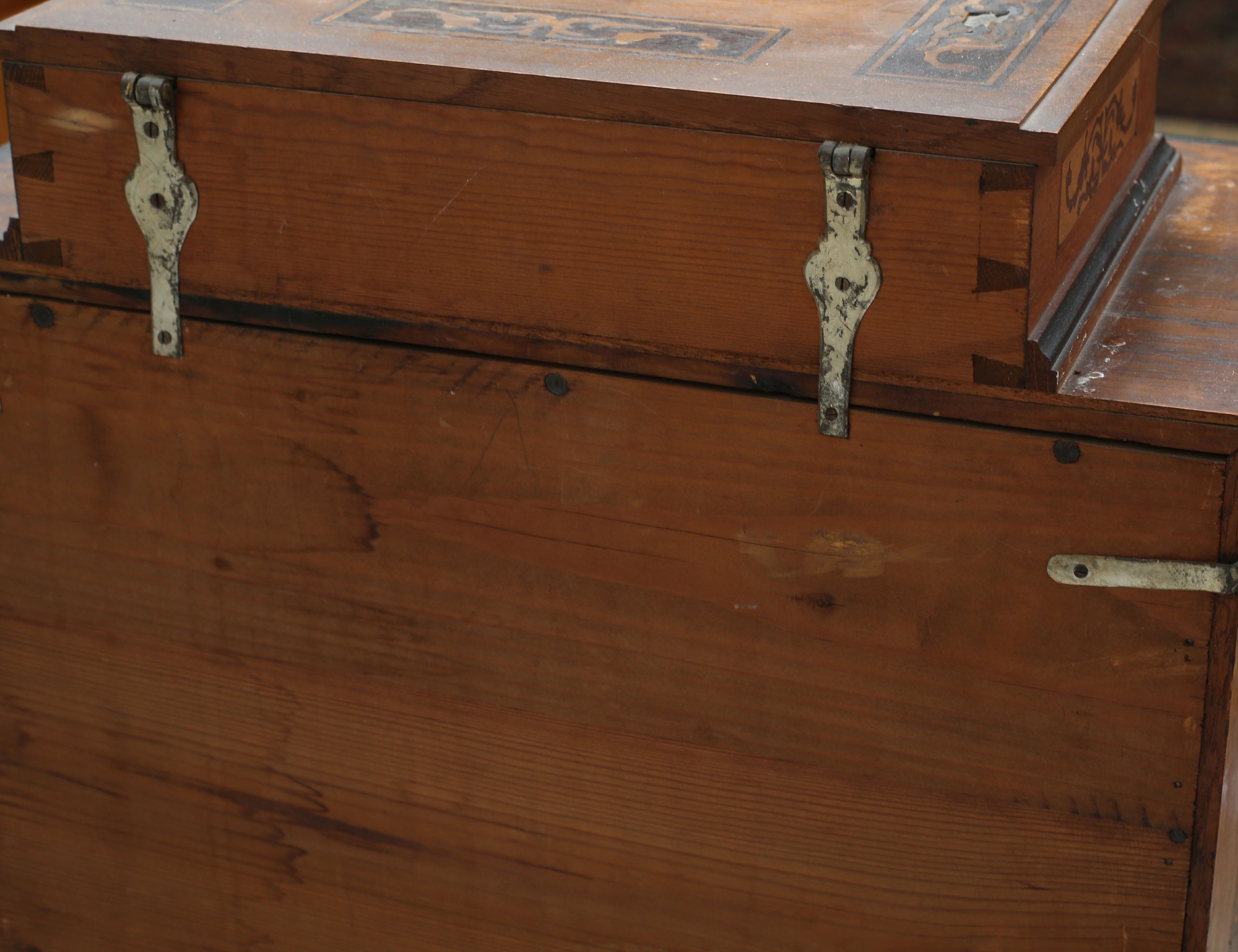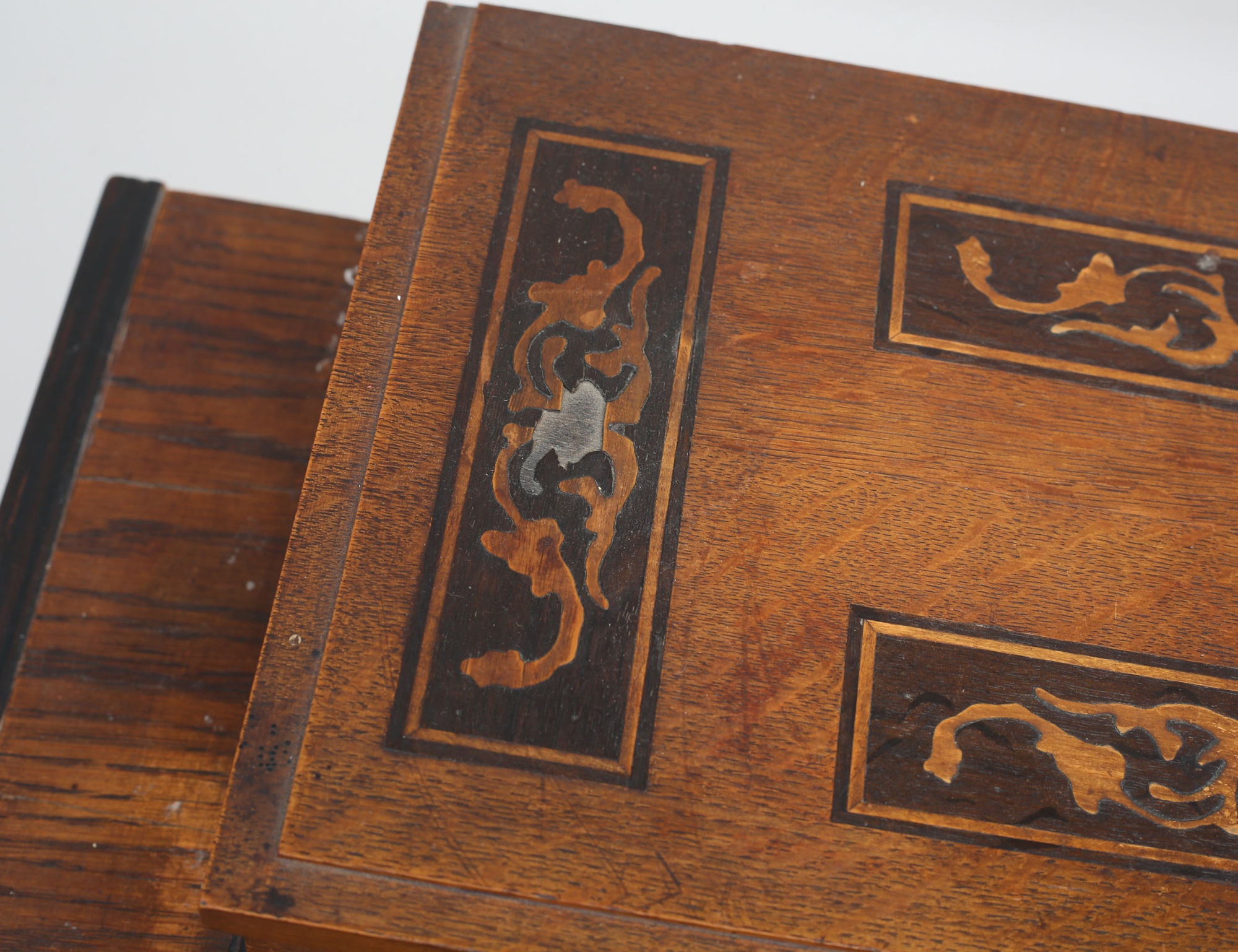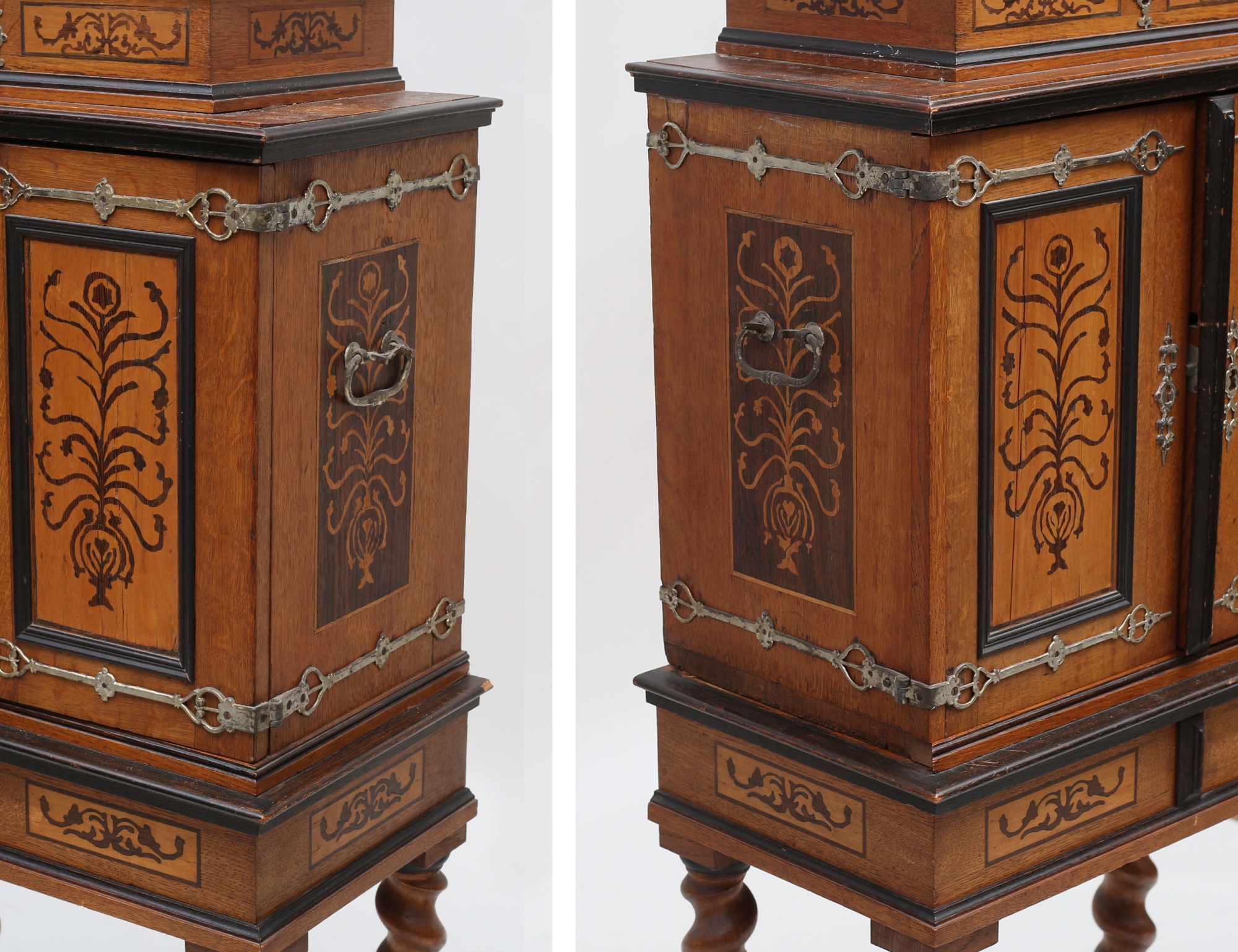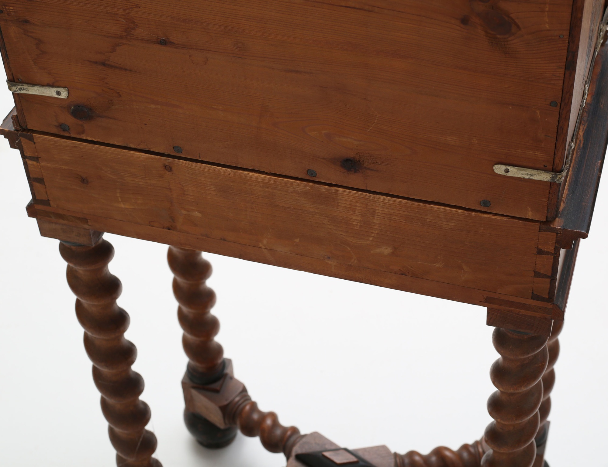 ek med intarsia, överdel med skrin, mellanparti med 15 lådor, spiralsvarvad benställning, höjd 132, bredd 57, djup 30 (lister, en låda samt nyckel saknas)
