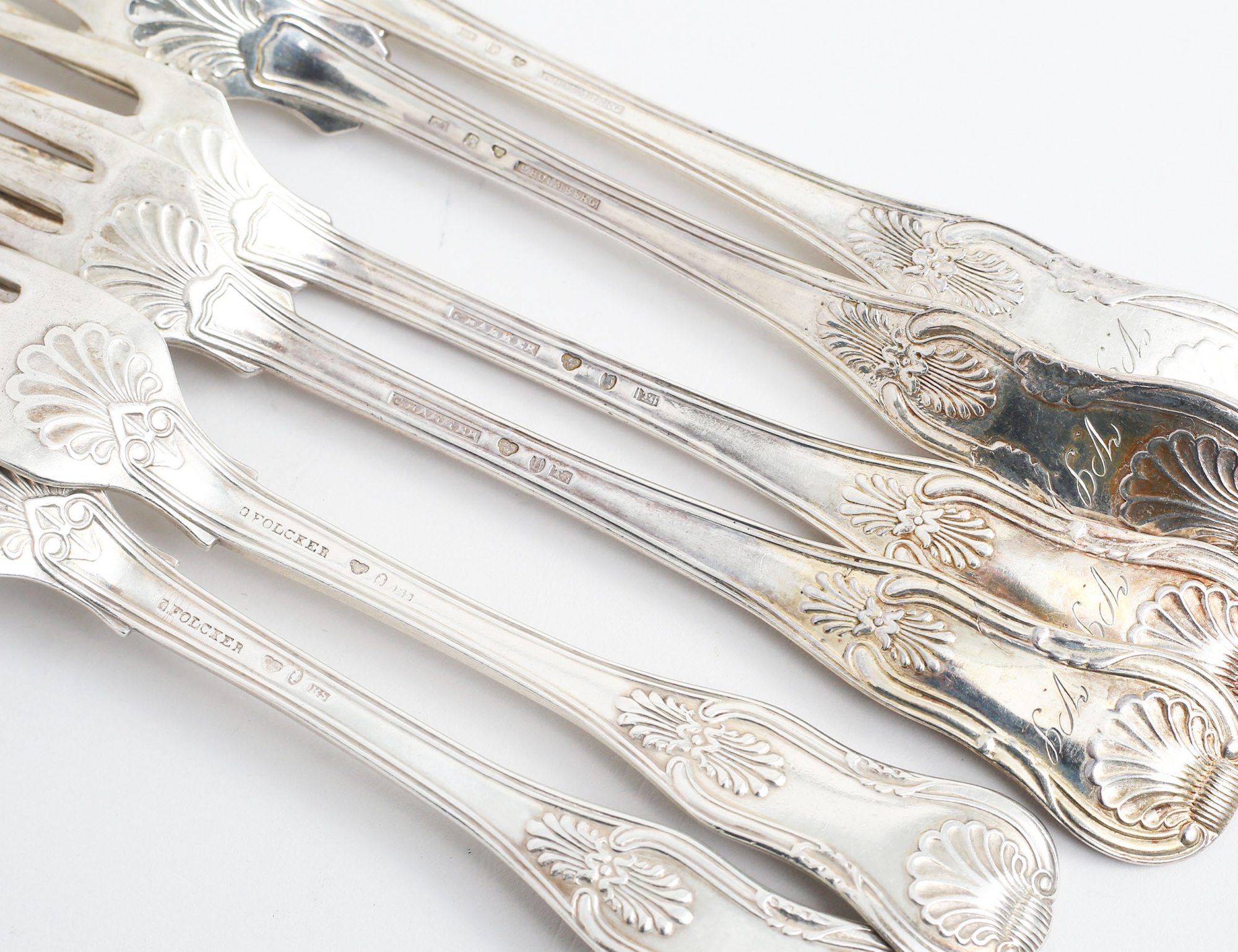 silver, 2 stycken Peter Holmberg Örebro 1845, 2 stycken Christian Hammer Stockholm 1849, 2 stycken Gustaf Folcker Stockholm 1856, vikt 436 gram (6)