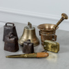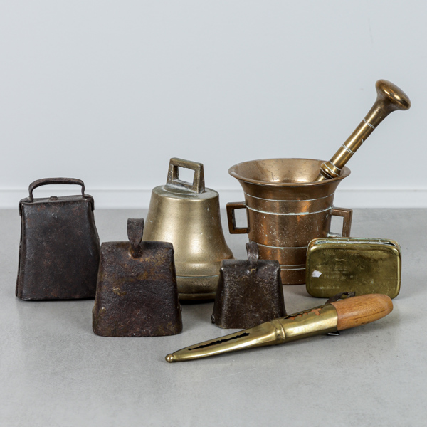 3 ko bjällror, 1 luskam i etui, mortel med stöt samt kniv Hellberg, Eskilstuna