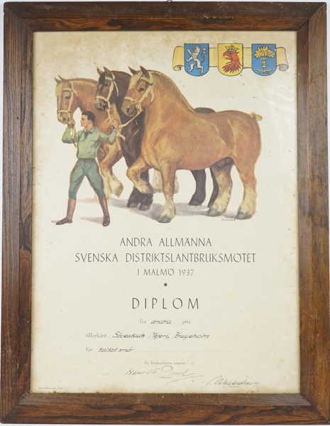 Bilder Diplom, inramat, Andra Allmänna Svenska Distriktslantbruksmötet i Malmö 1937.