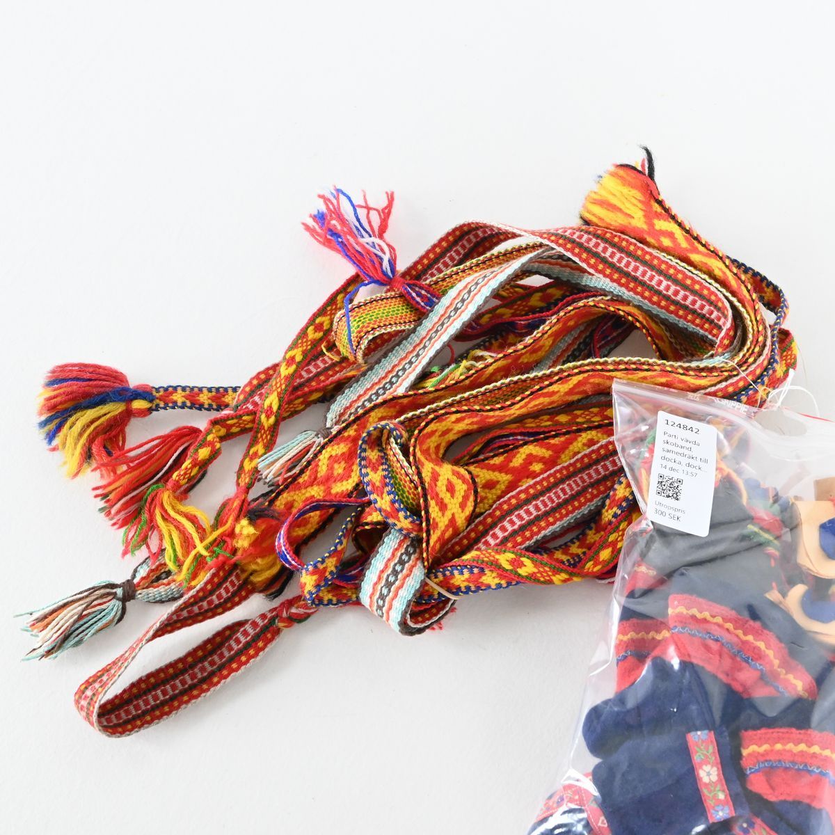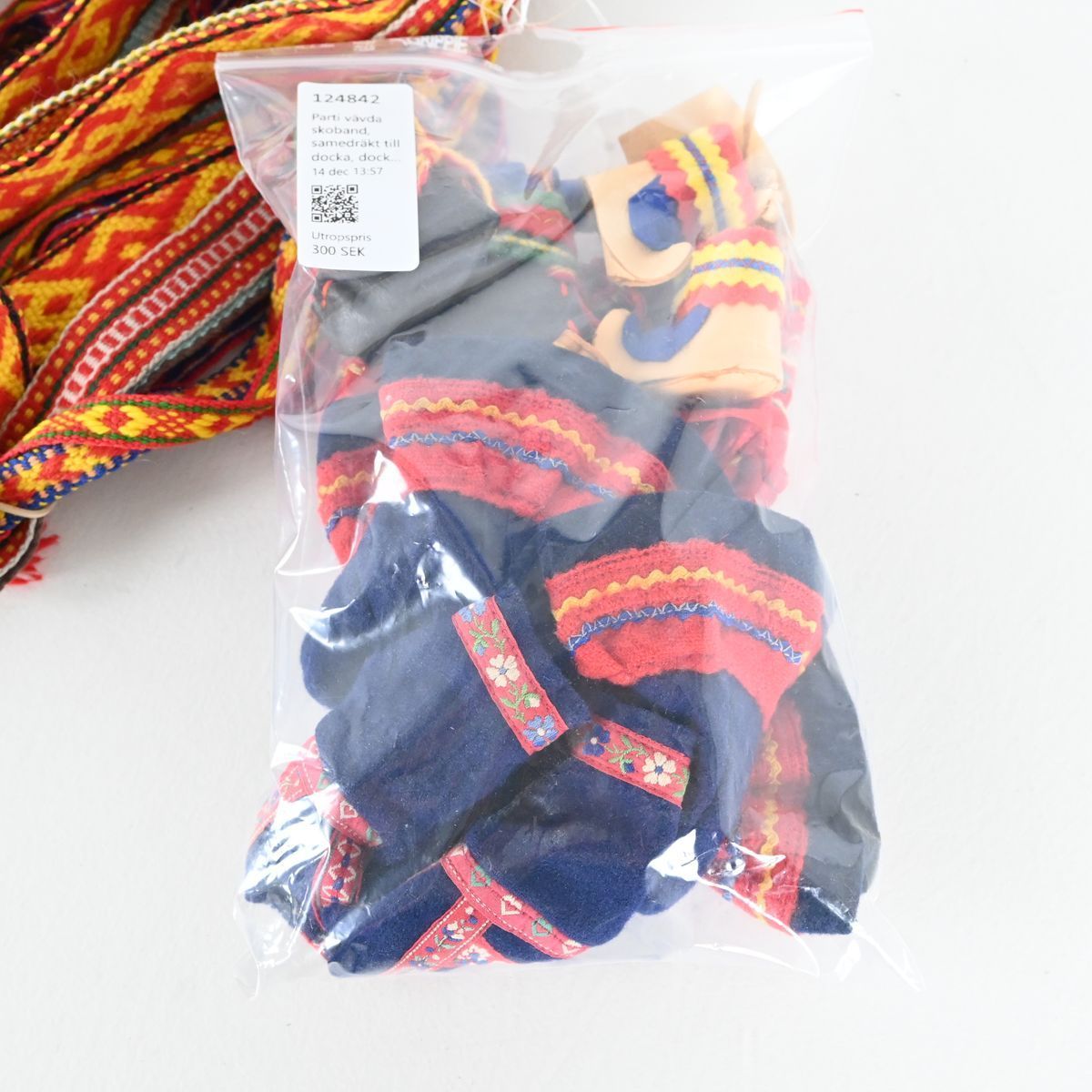 Bilder Parti vävda skoband, samedräkt till docka, dockor mm