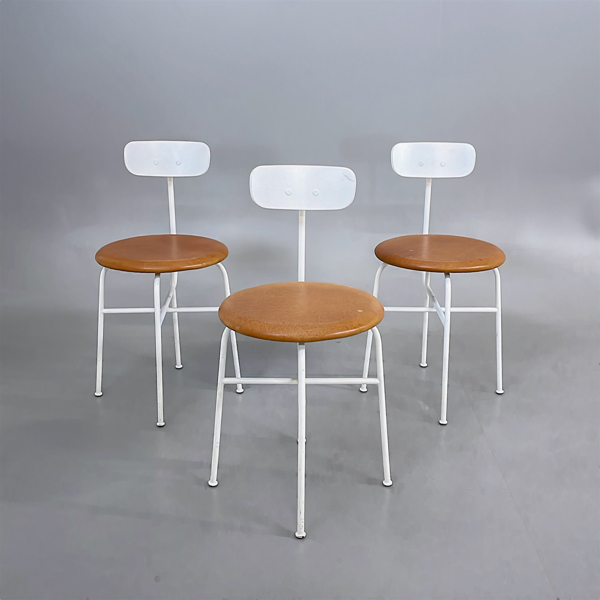 3 stycken stolar Afteroom stol 4 från Audo Copenhagen. Formgiven av designstudion Afteroom. Stativ och ryggstöd i vitt med sits i cognacsfärgat skinn.