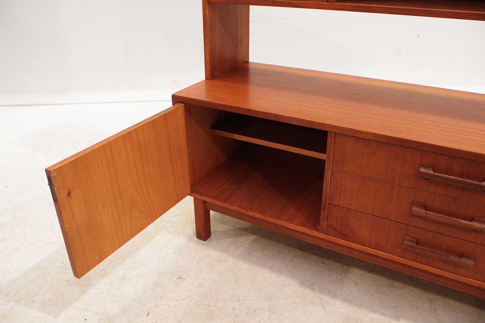 SIDEBOARD med hylla 2 delar, teak, 1950/60-tal. H:148x 160x 45cm. ställvis mindre slitage