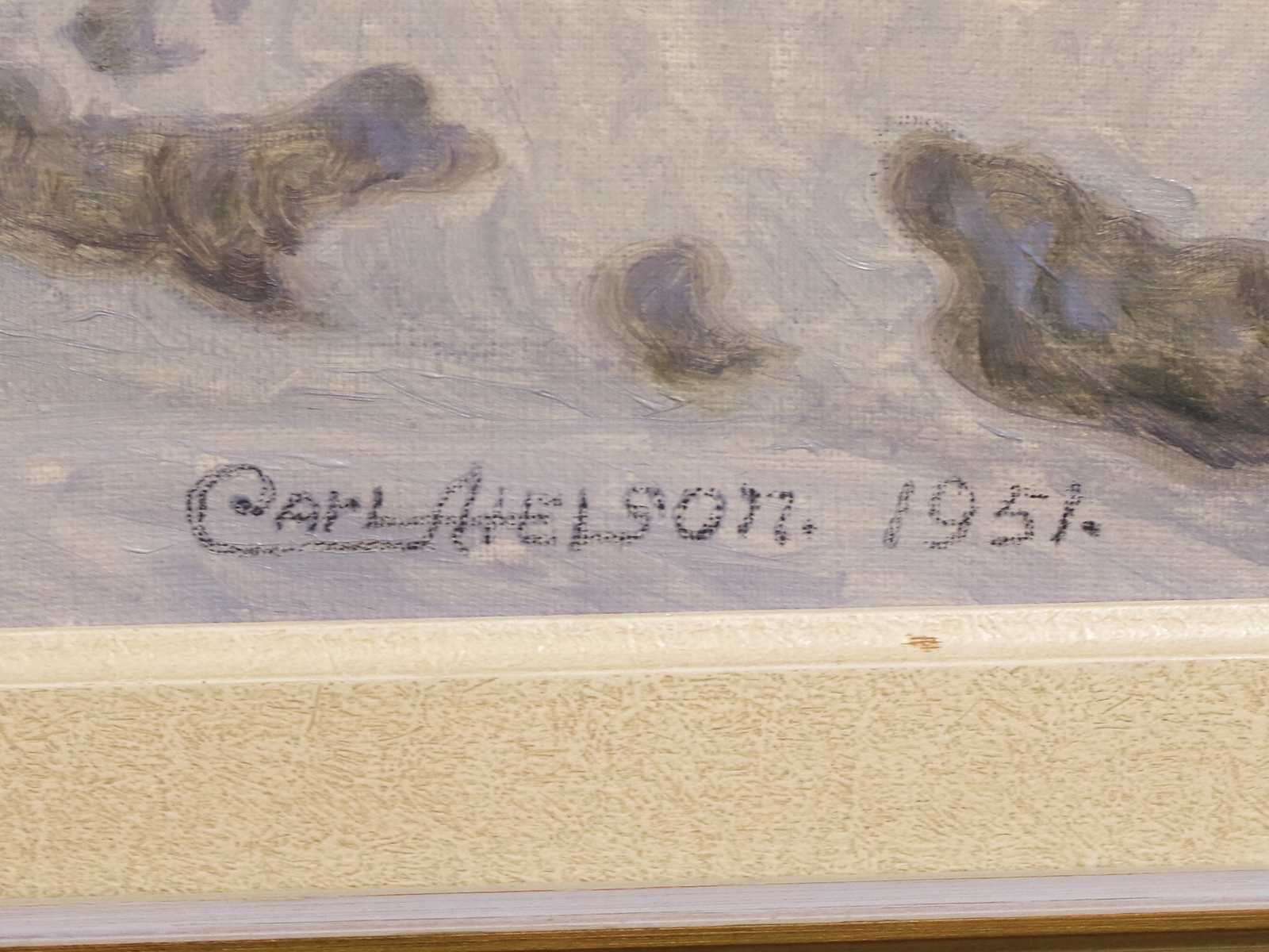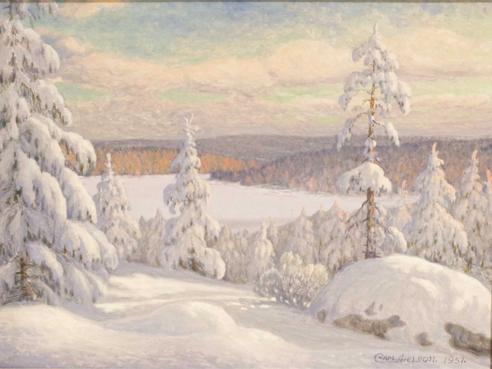 Bilder CARL AXELSON. Olja på duk, "Vinterafton Långserud", signerad och daterad 1951. 59x44cm bildytans mått.