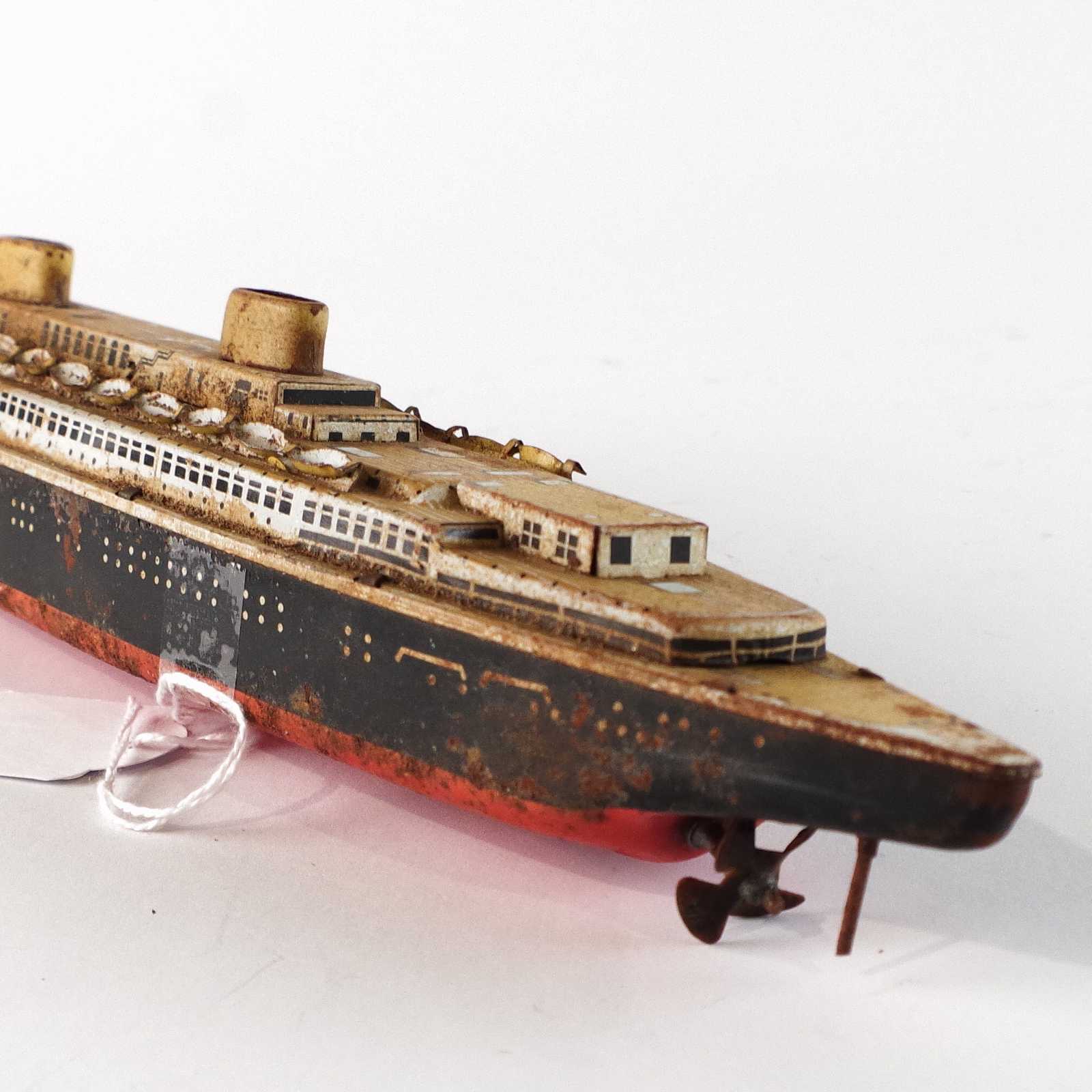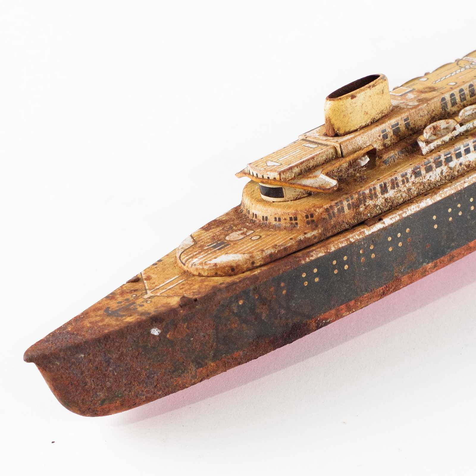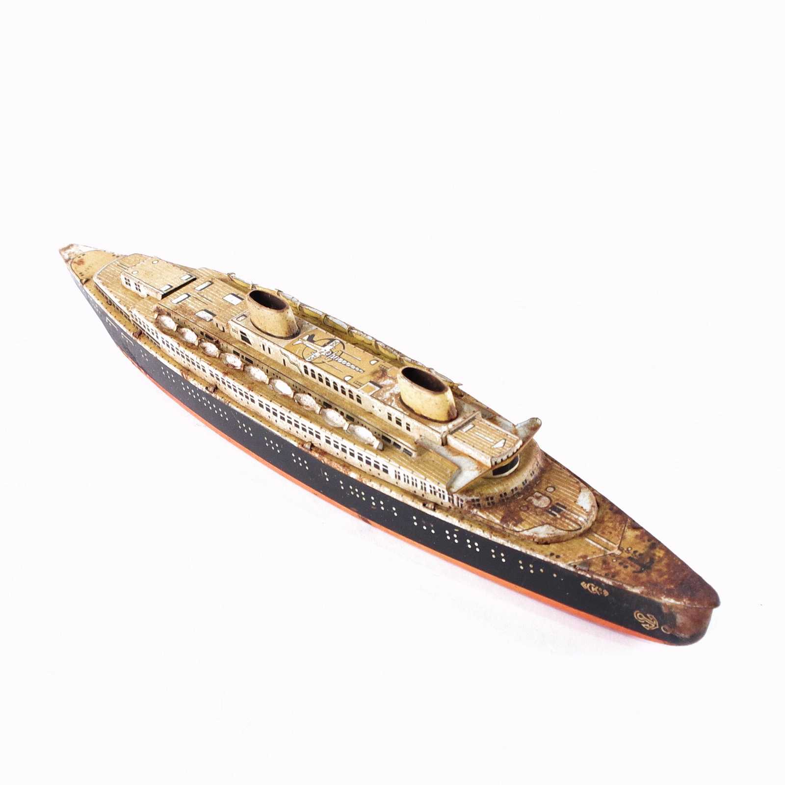 Bilder LEKSAKSFARTYG äldre, plåt. US Zone Germany. L: 34cm. (rost förekommer, nyckel saknas)