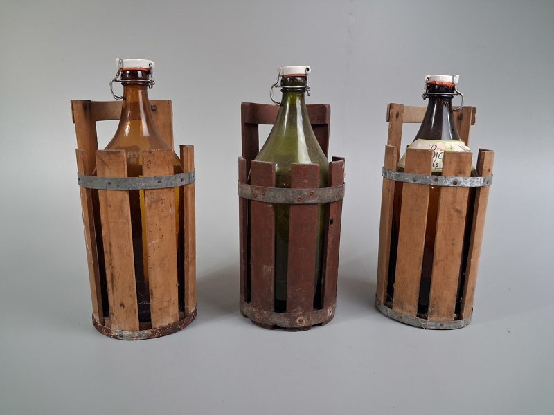 3 Dryckes flaskor i ställ.
