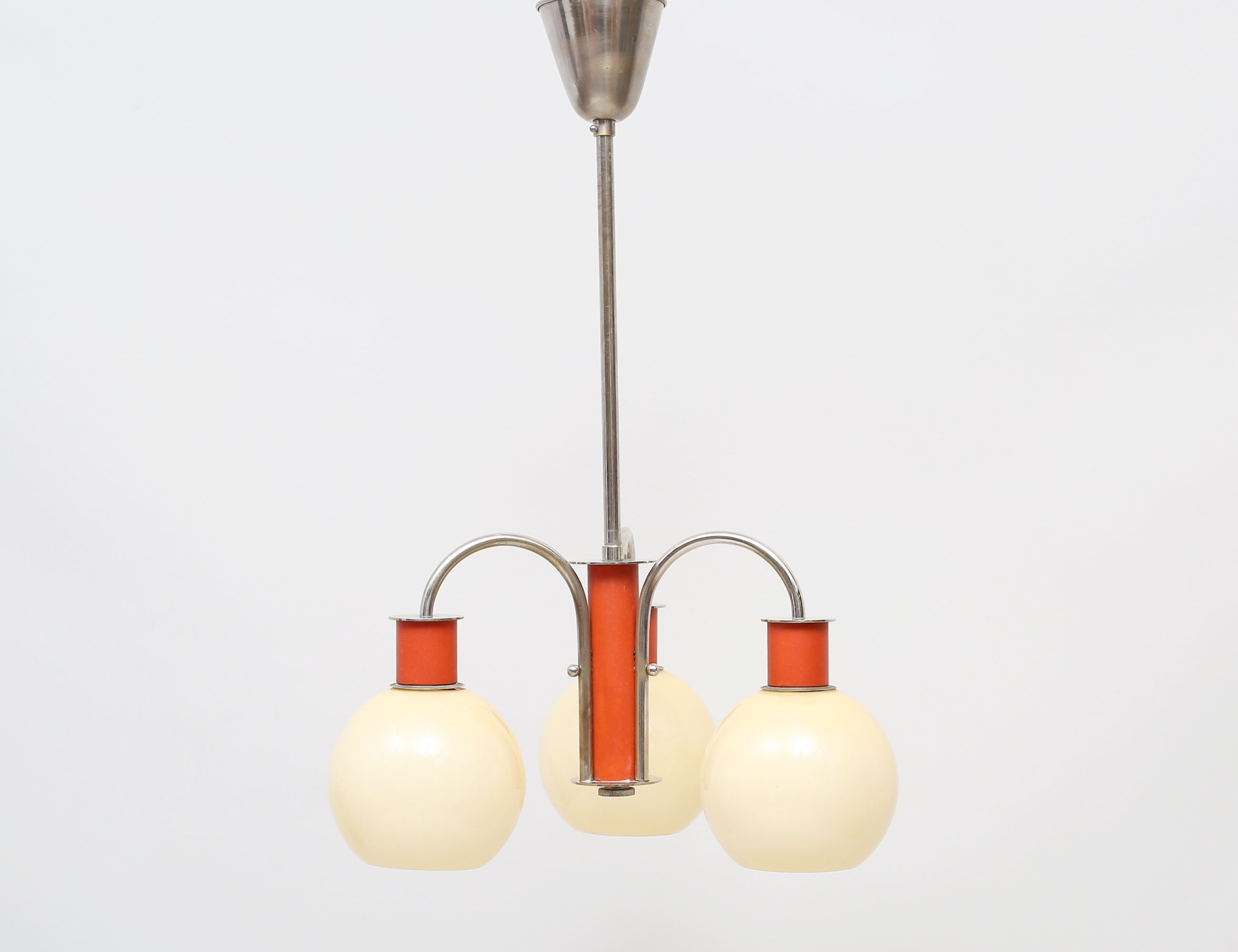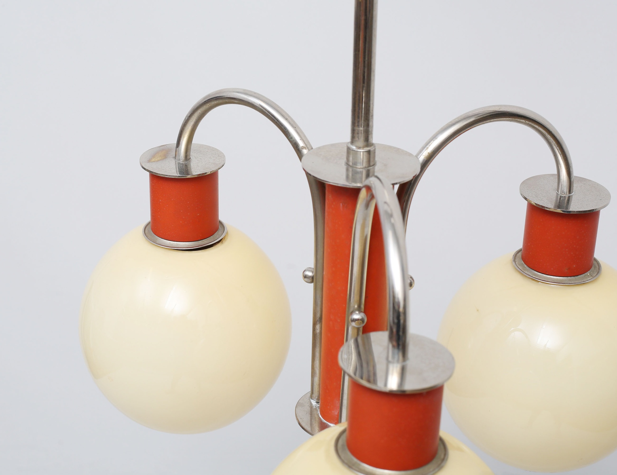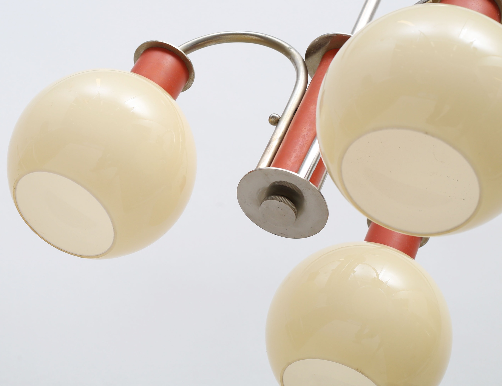 Erik Tidstrand för Nordiska Kompaniet, kromad stomme med röda detaljer, tre gräddvita glaskupor, höjd 64, diameter 43