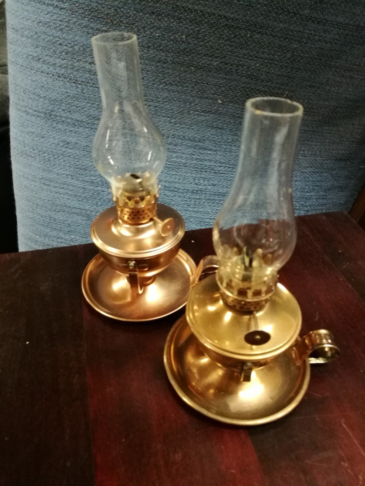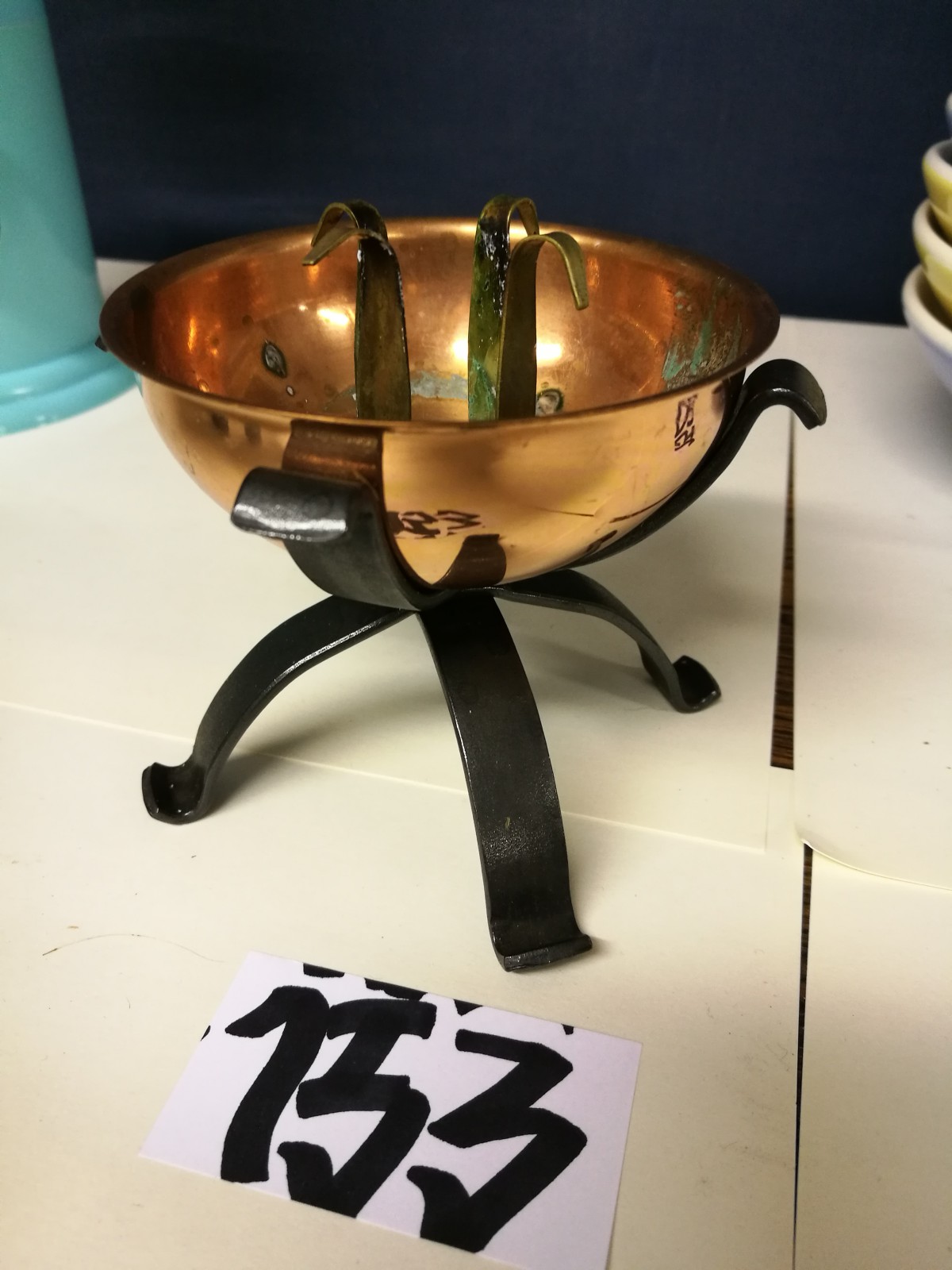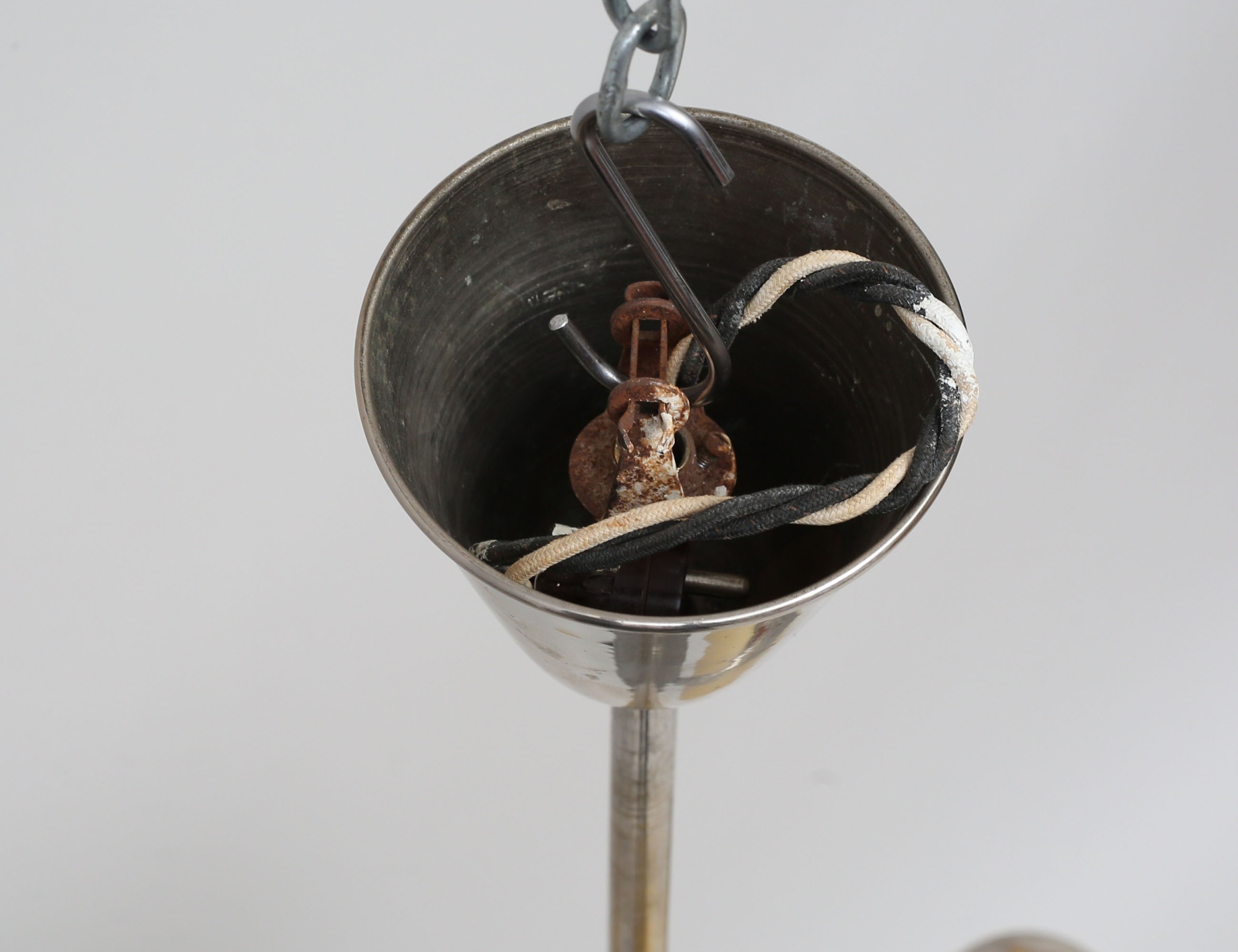 Erik Tidstrand för Nordiska Kompaniet, kromad stomme med röda detaljer, tre gräddvita glaskupor, höjd 64, diameter 43