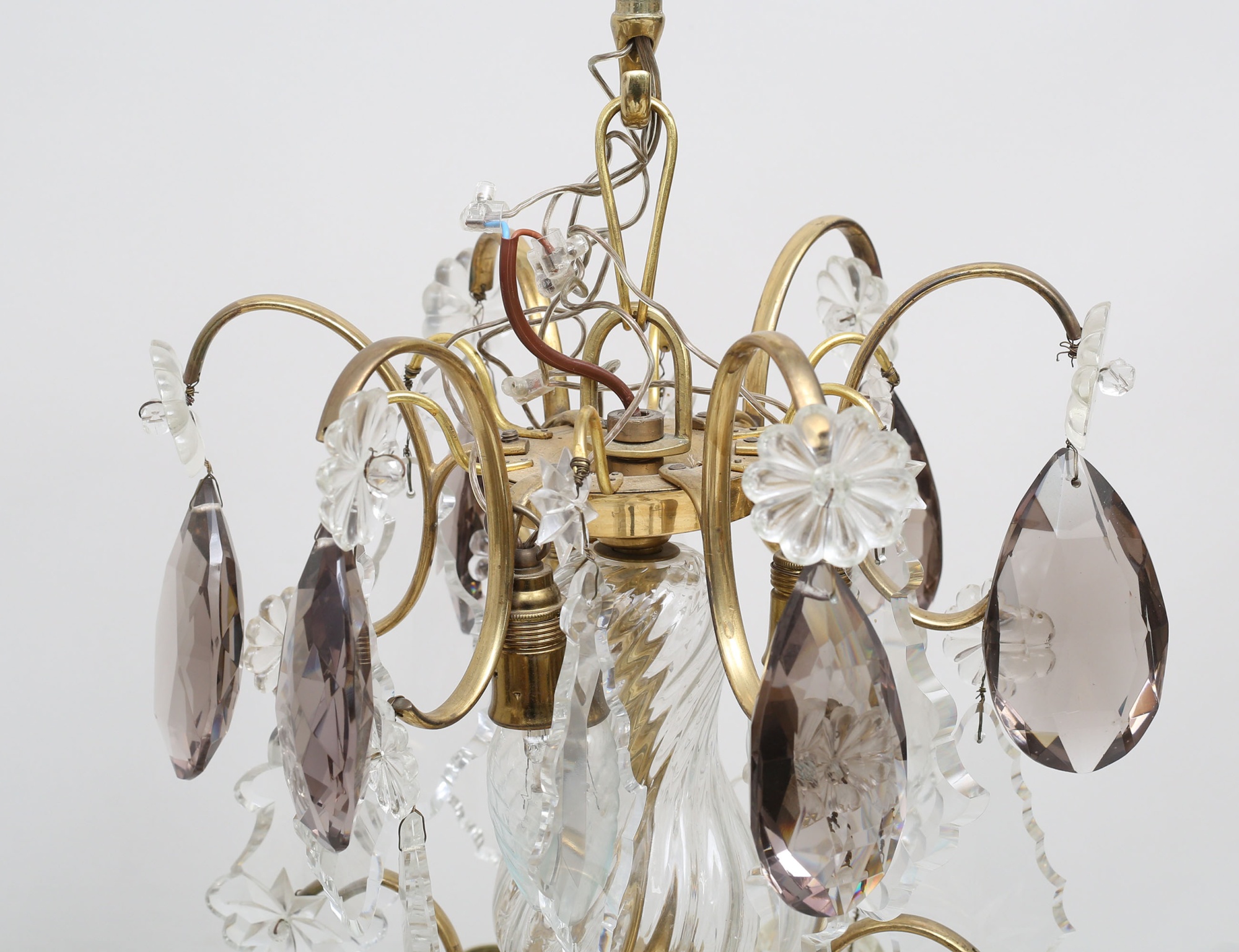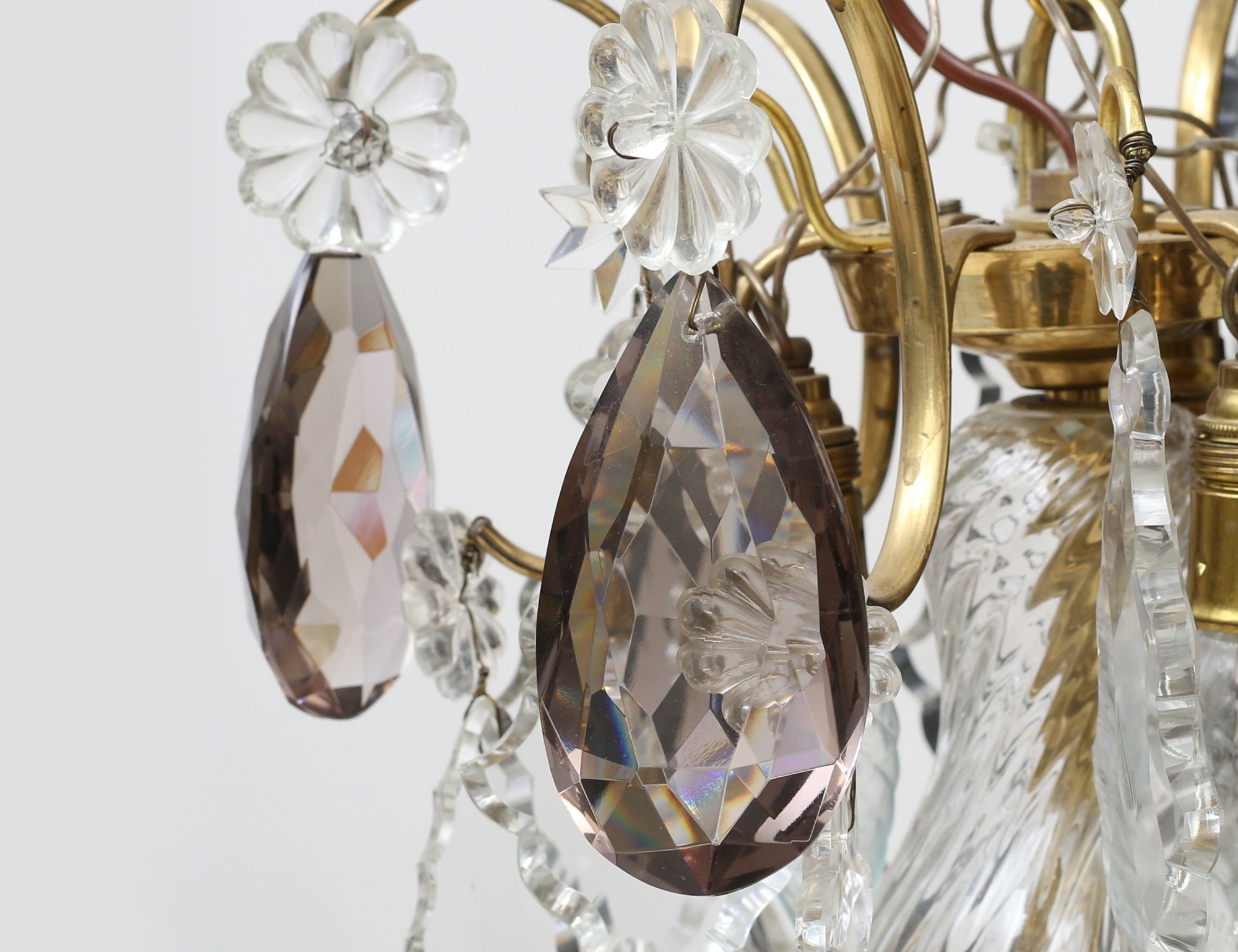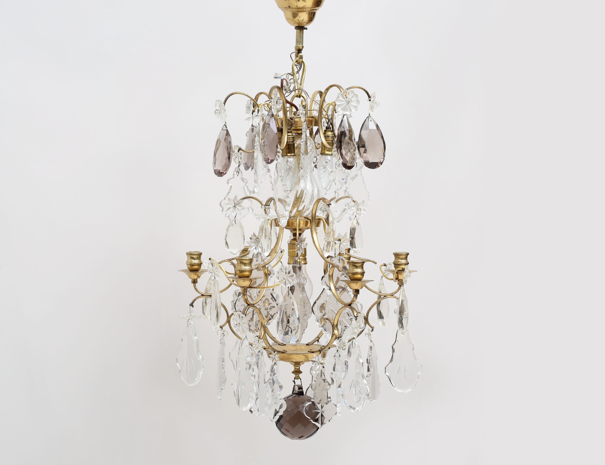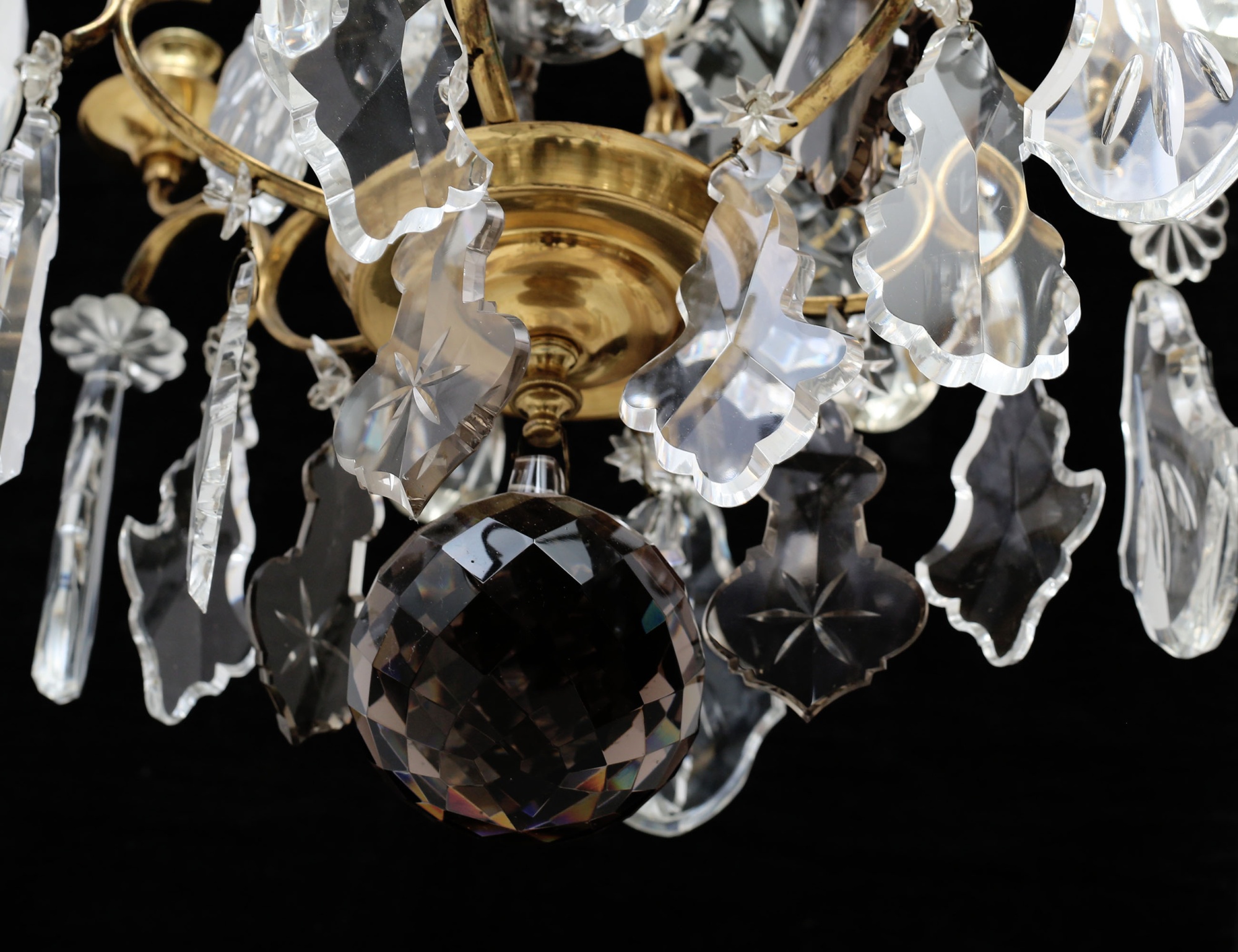 stomme i förgylld mässing, fasettslipade olikformade prismor, några röktonade, för sex ljus, elektrifierad, höjd 90, diameter 50