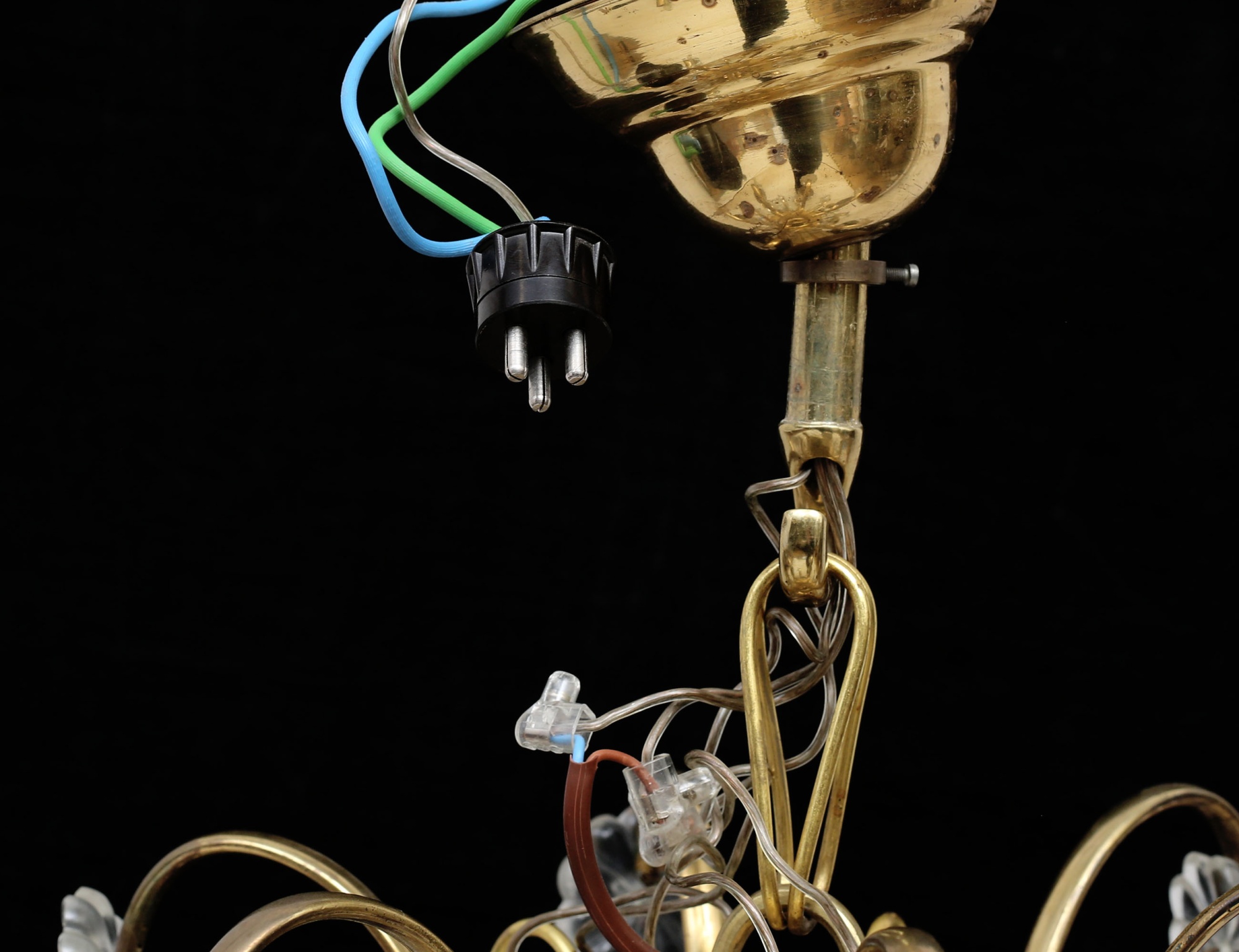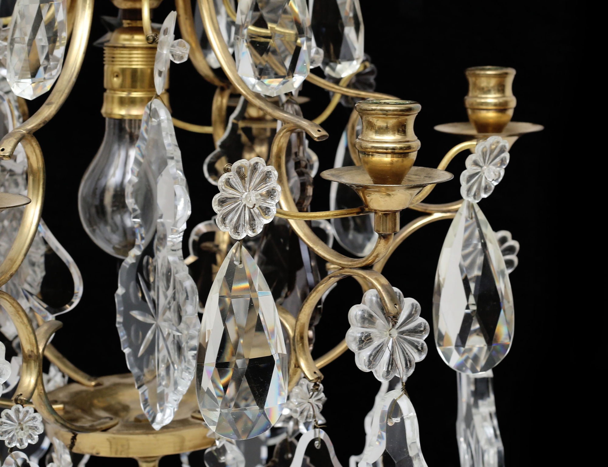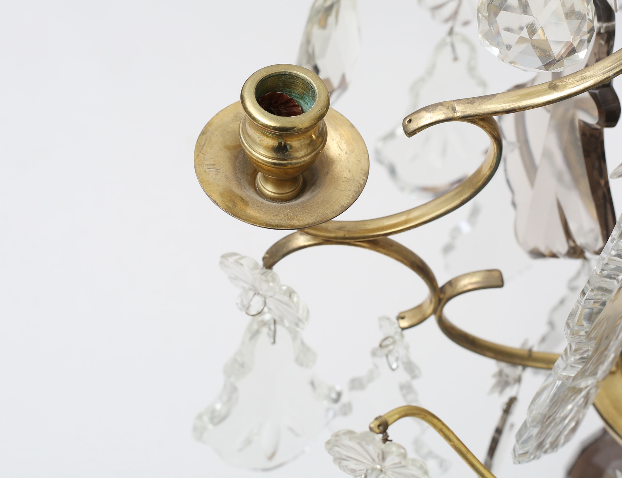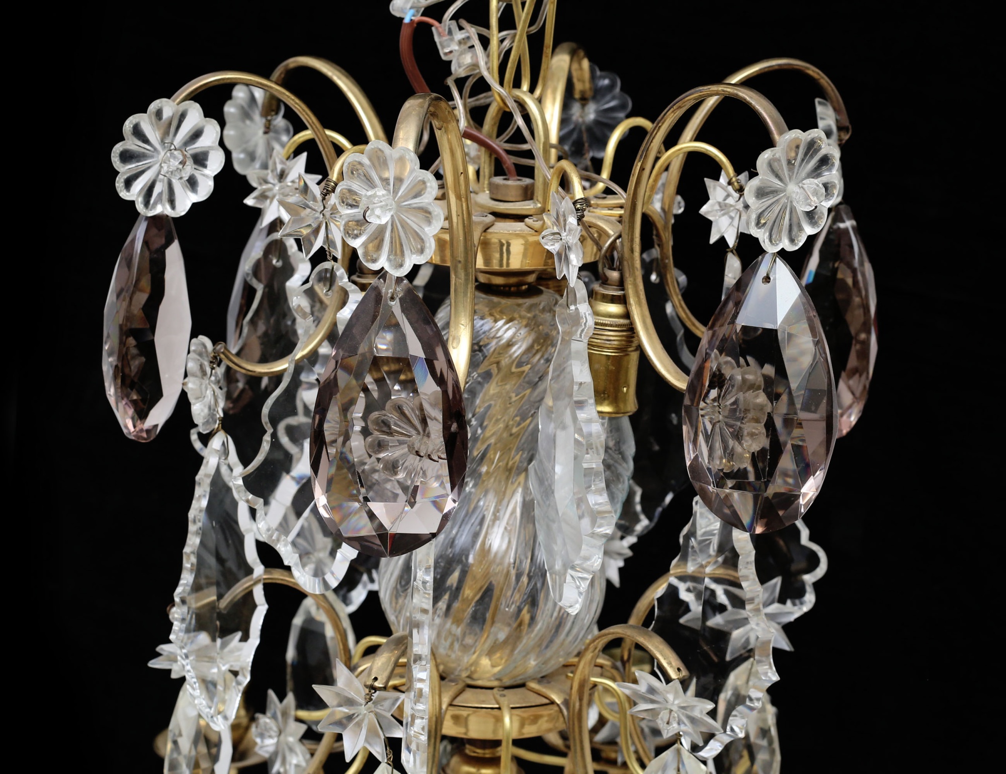 stomme i förgylld mässing, fasettslipade olikformade prismor, några röktonade, för sex ljus, elektrifierad, höjd 90, diameter 50
