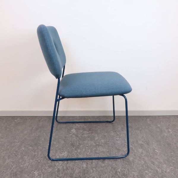 Klädd stol från svenska Blå Station, modellen Dundra S70 formgiven av Stefan Borselius., klädd i ett blått tyg på sits och rygg med ett matchande blått med-stativ. En bekväm stol perfekt för längre möten då sitsen och ryggen är generöst vadderad. Nypris ca: 6000 :-