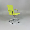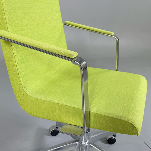 Arbetsstol Woods från EFG. Perfekt enklare stilren stol till hemmakontoret. Woods är designad av den norska designern Steinar Hindenes. Klädd i grönt slitstarkt tyg med fotkryss, gaspelare och armstöd i krom. Nypris ca 7500:-