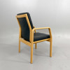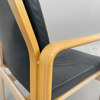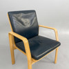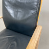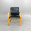 Klassisk fåtölj av JOC. Klädd i mörkblått skinn med stomme i bok.