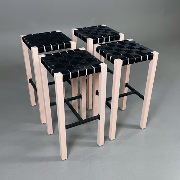 Raka kopplade ben i trä i rosa färg flätad sadelhjord av svart nylon. Sitthöjd 73.