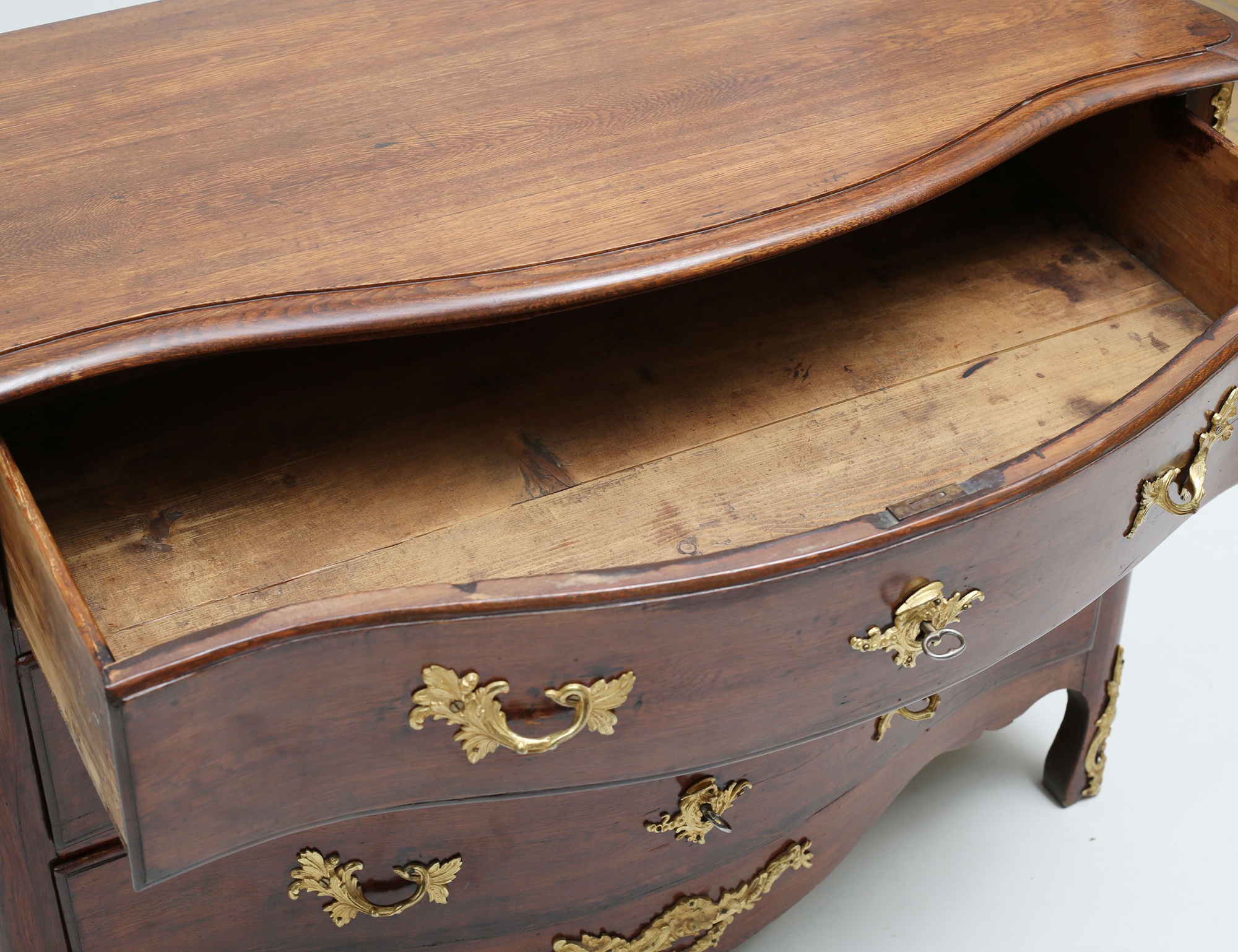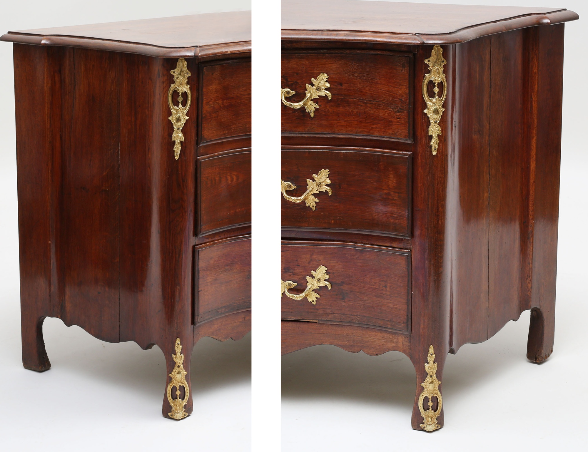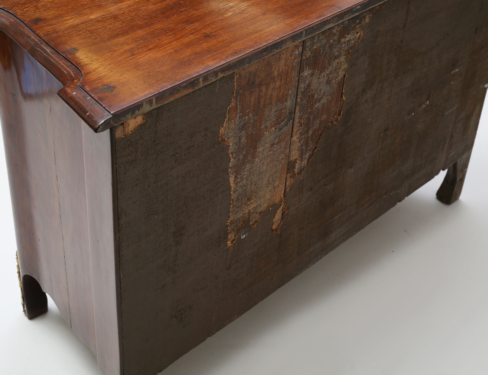 brunbetsad polerad furu, svängd front, tre lådor, beslag och ornament i förgylld mässing, profilerad skiva, äldre men senare lås, höjd 78, bredd 122, djup 56 (sidorna med torksprickor)