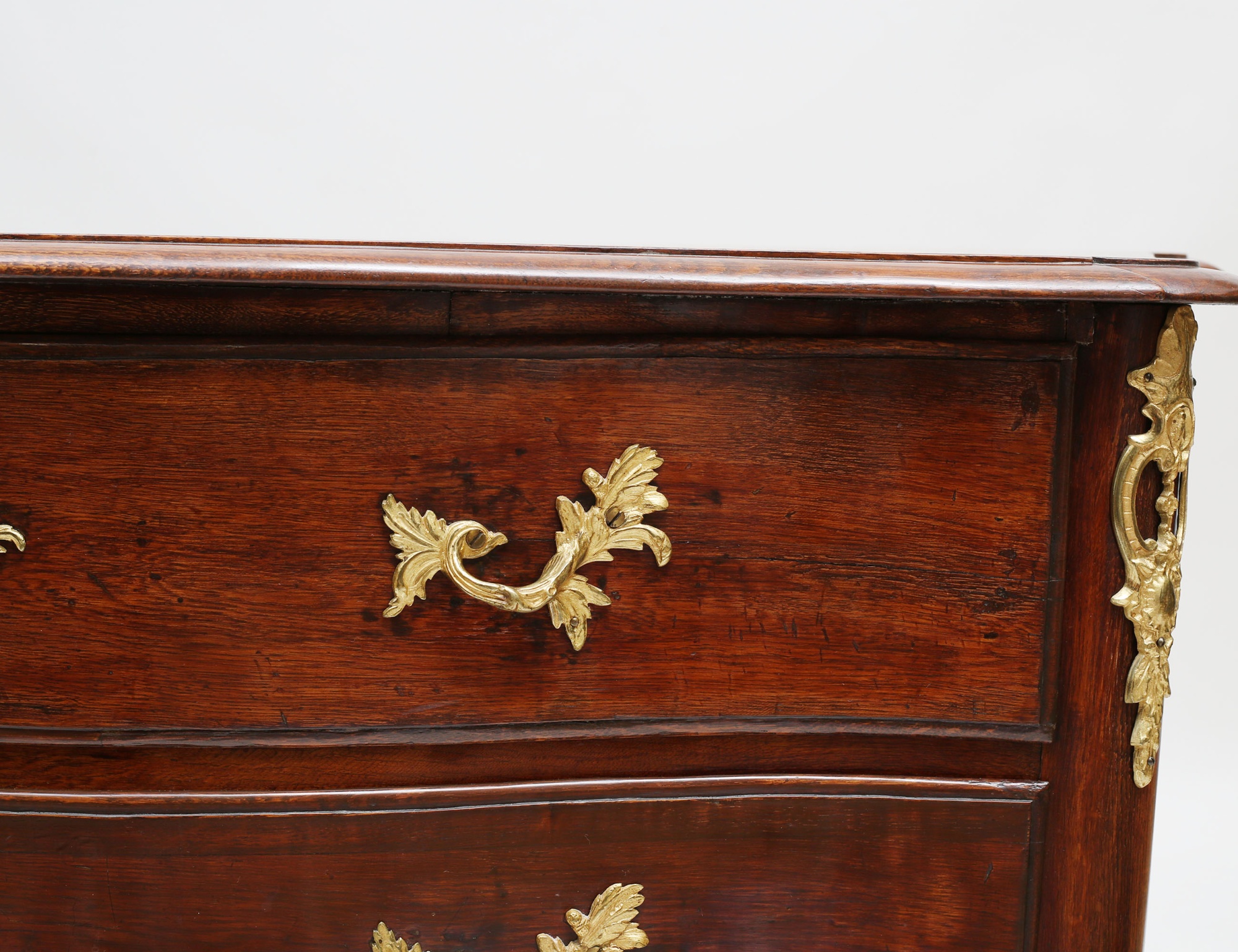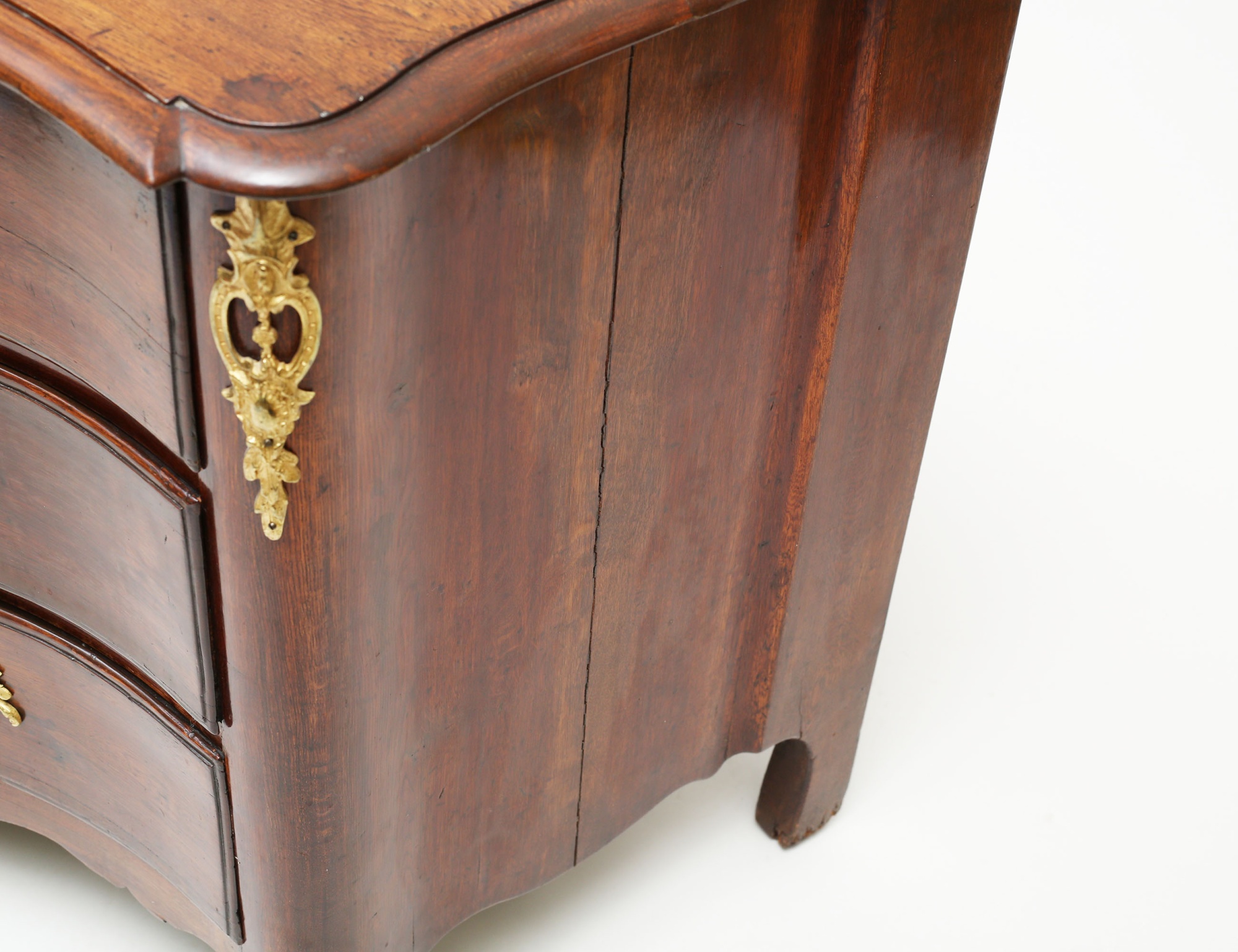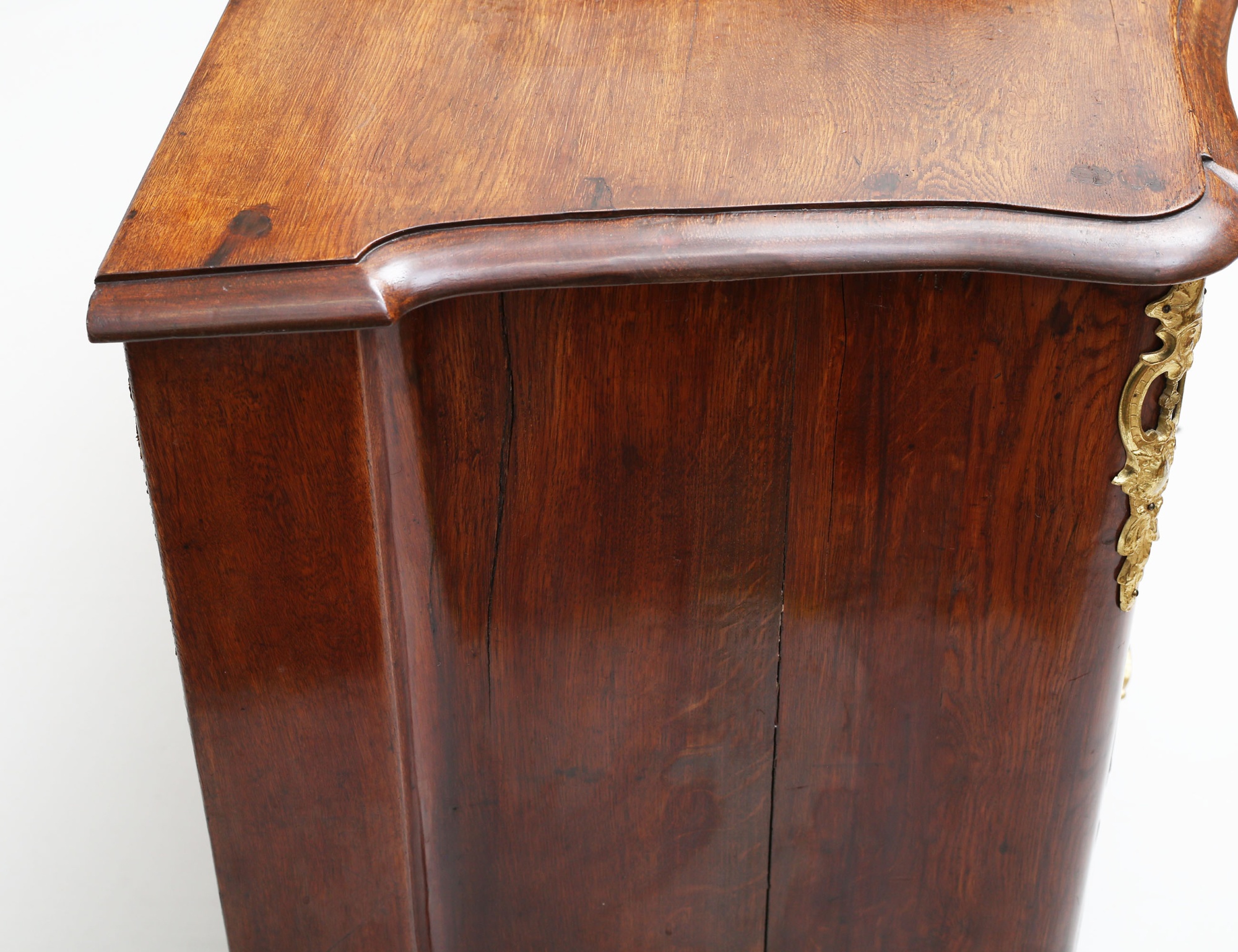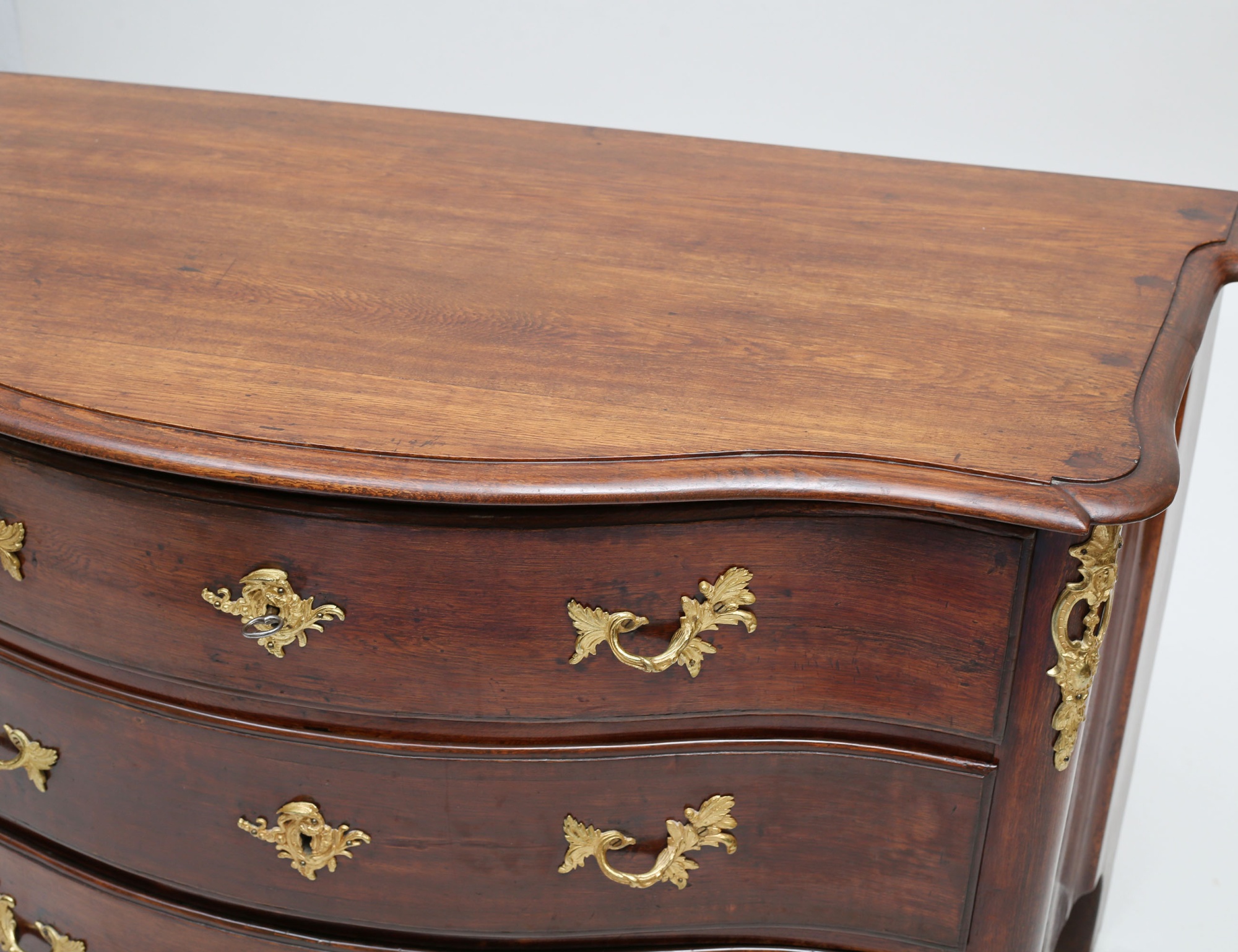 brunbetsad polerad furu, svängd front, tre lådor, beslag och ornament i förgylld mässing, profilerad skiva, äldre men senare lås, höjd 78, bredd 122, djup 56 (sidorna med torksprickor)
