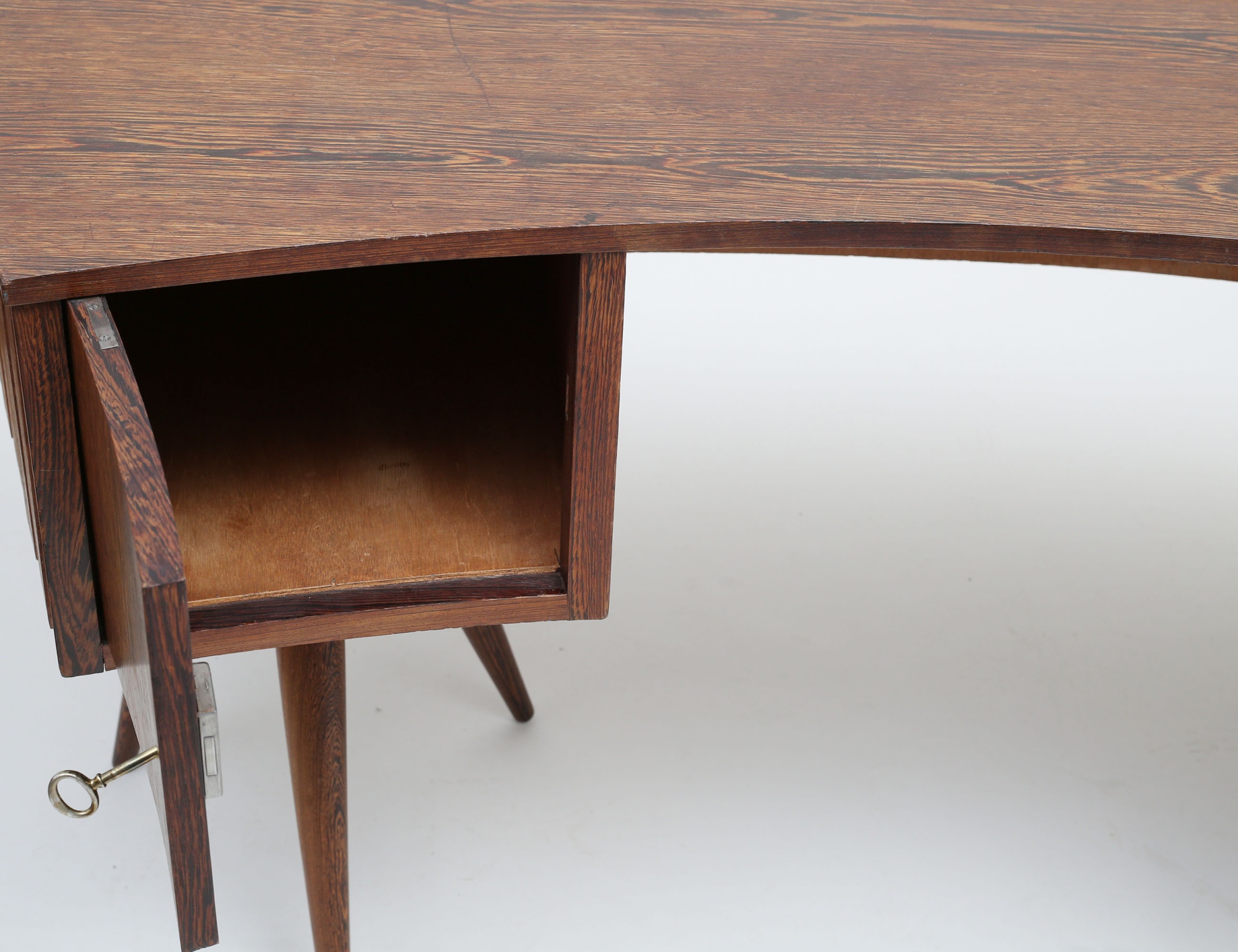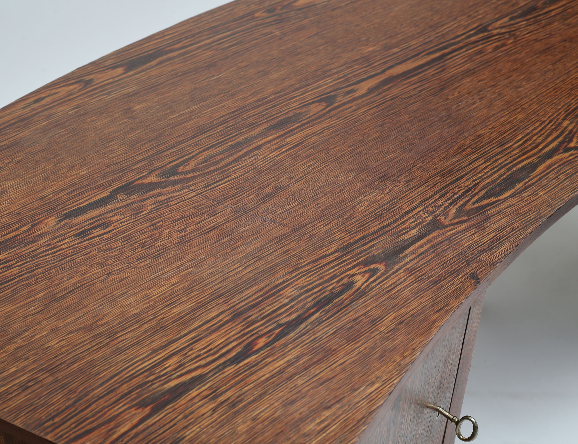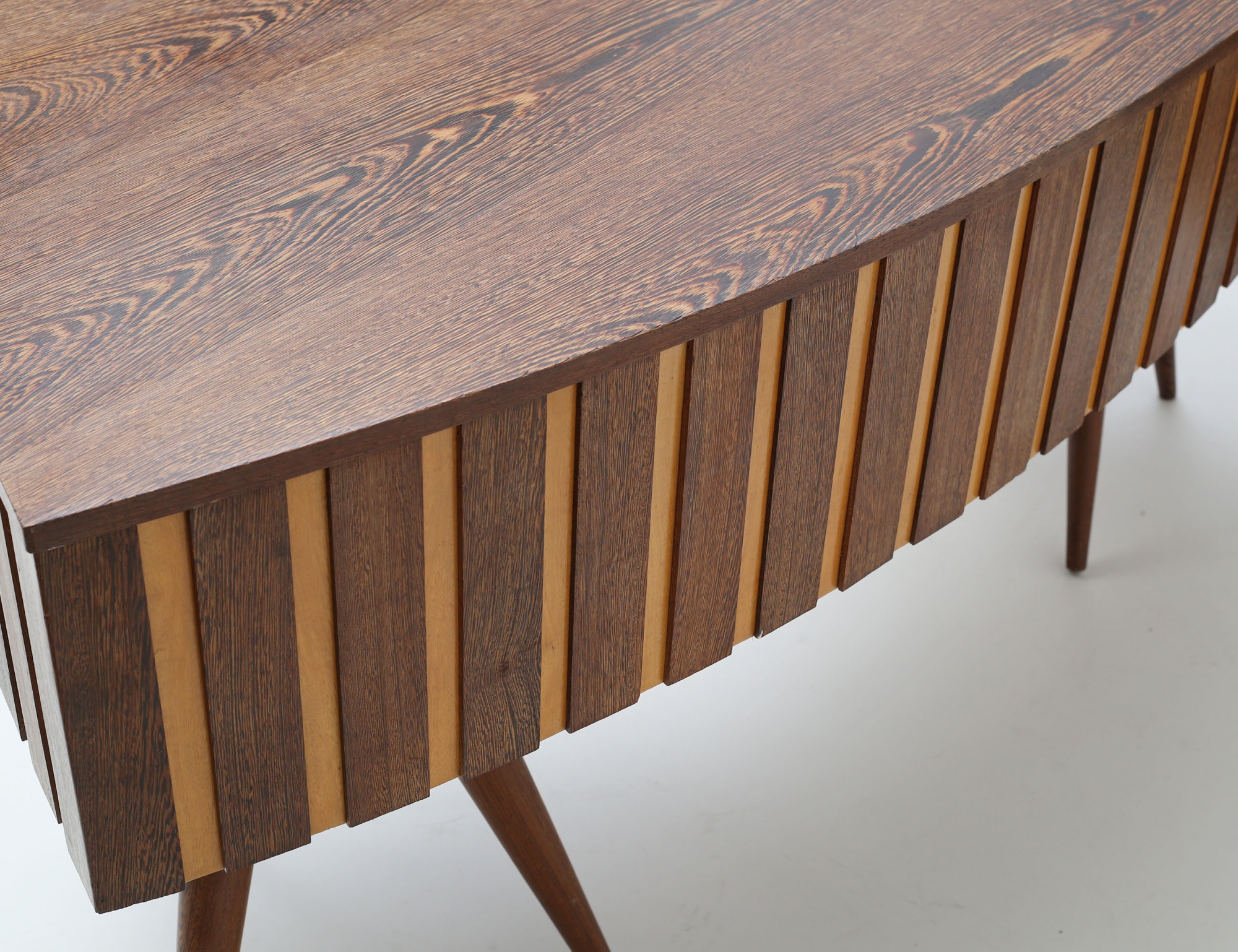 1900-talets andra hälft, svängd form, valnötsfanér, sidor samt baksida med paneler, front med två lådor samt skåp, på vardera sida tre nedåt avsmalnande ben, fristående, höjd 79, bredd 170, djup ca. 70 (repor, smärre stötmärken)