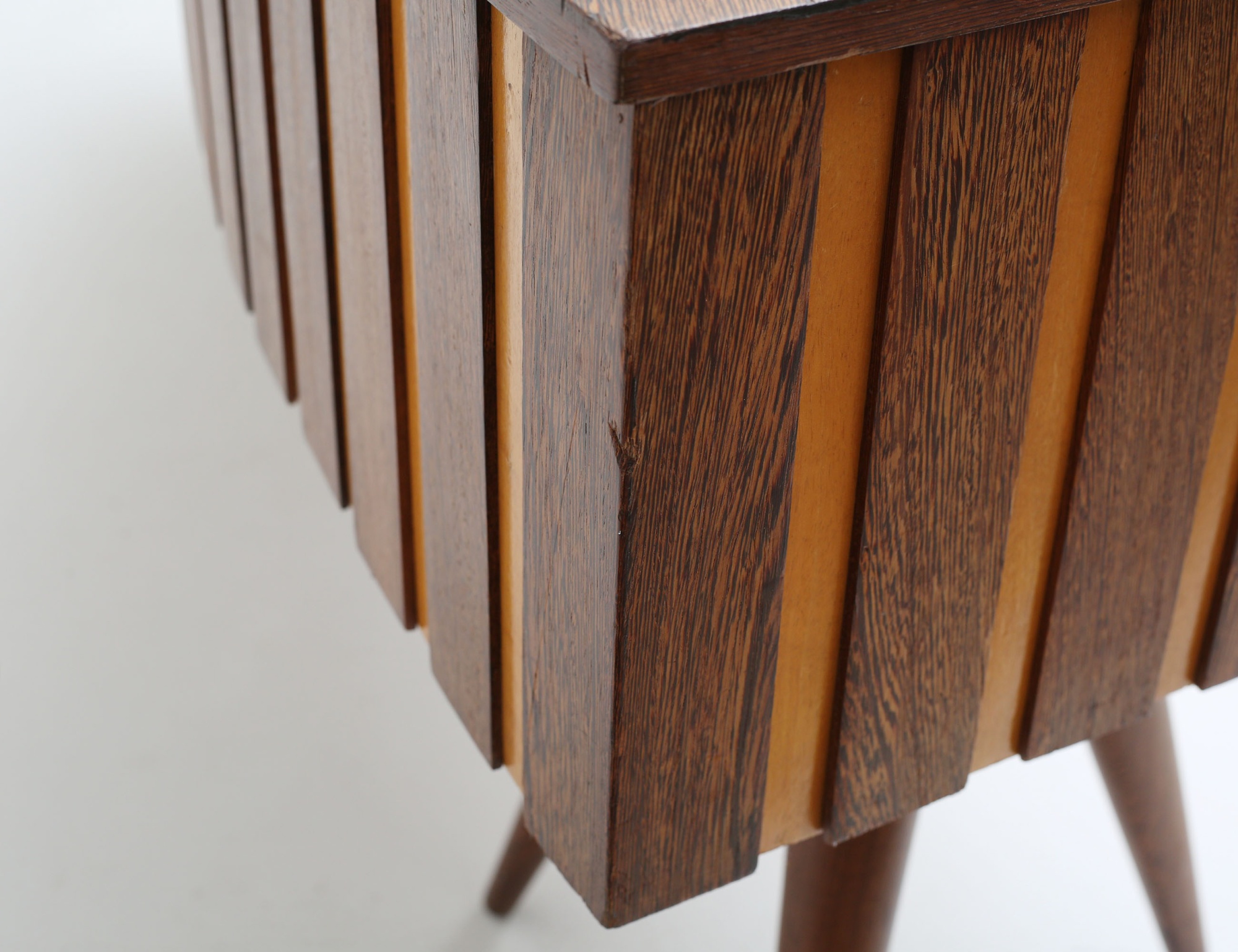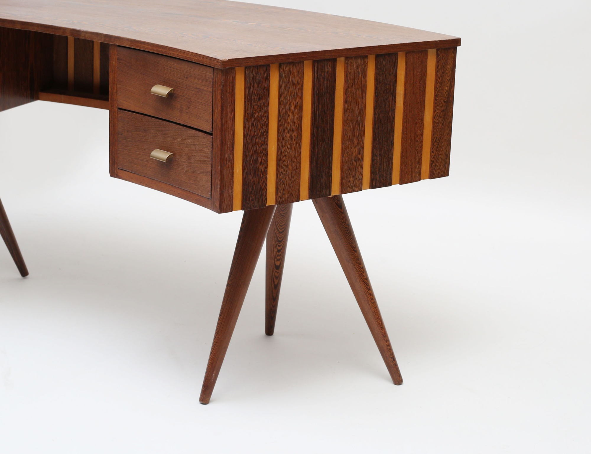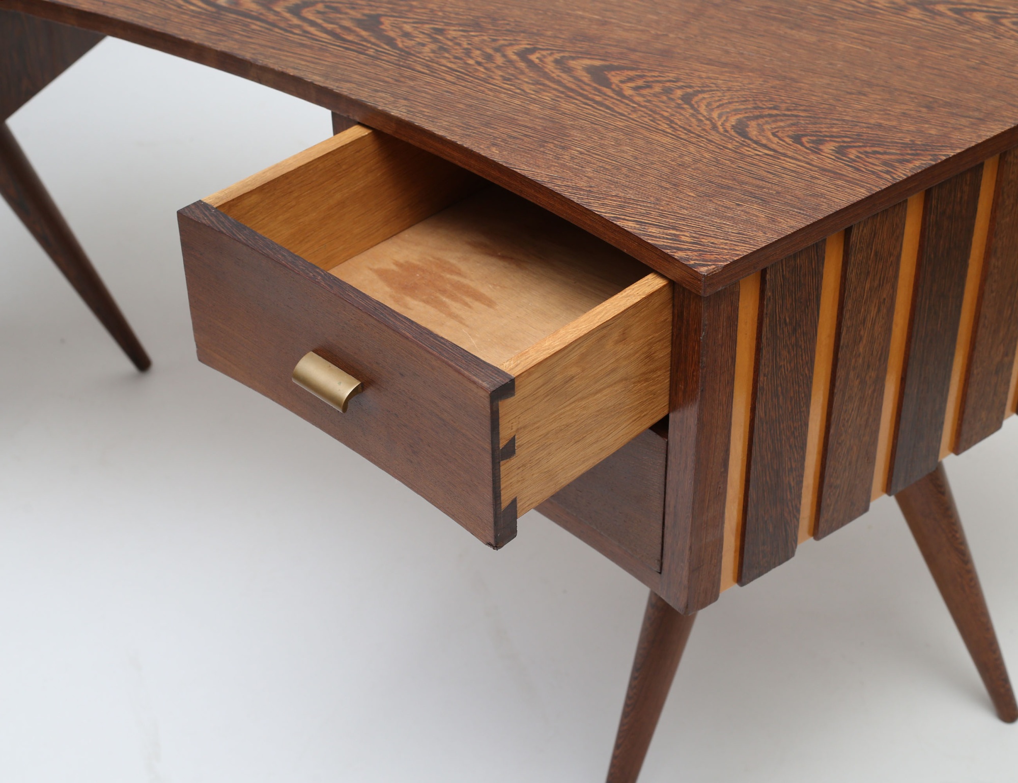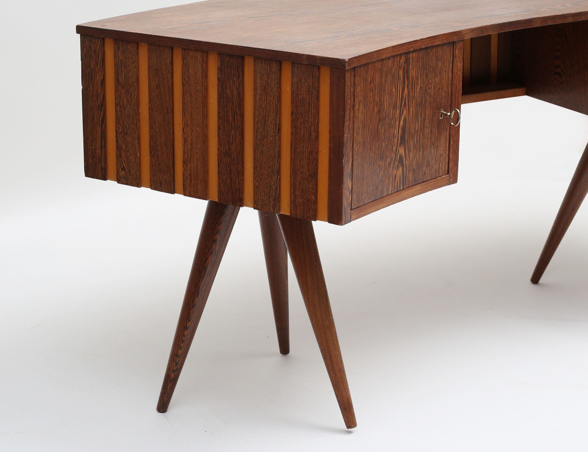1900-talets andra hälft, svängd form, valnötsfanér, sidor samt baksida med paneler, front med två lådor samt skåp, på vardera sida tre nedåt avsmalnande ben, fristående, höjd 79, bredd 170, djup ca. 70 (repor, smärre stötmärken)