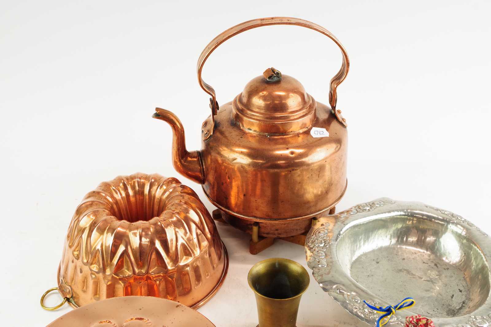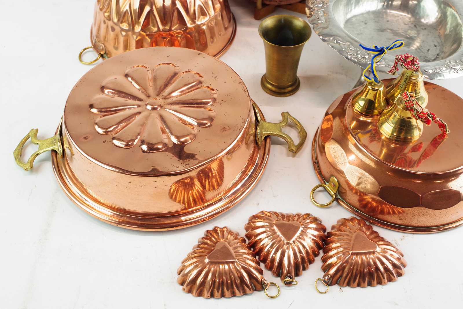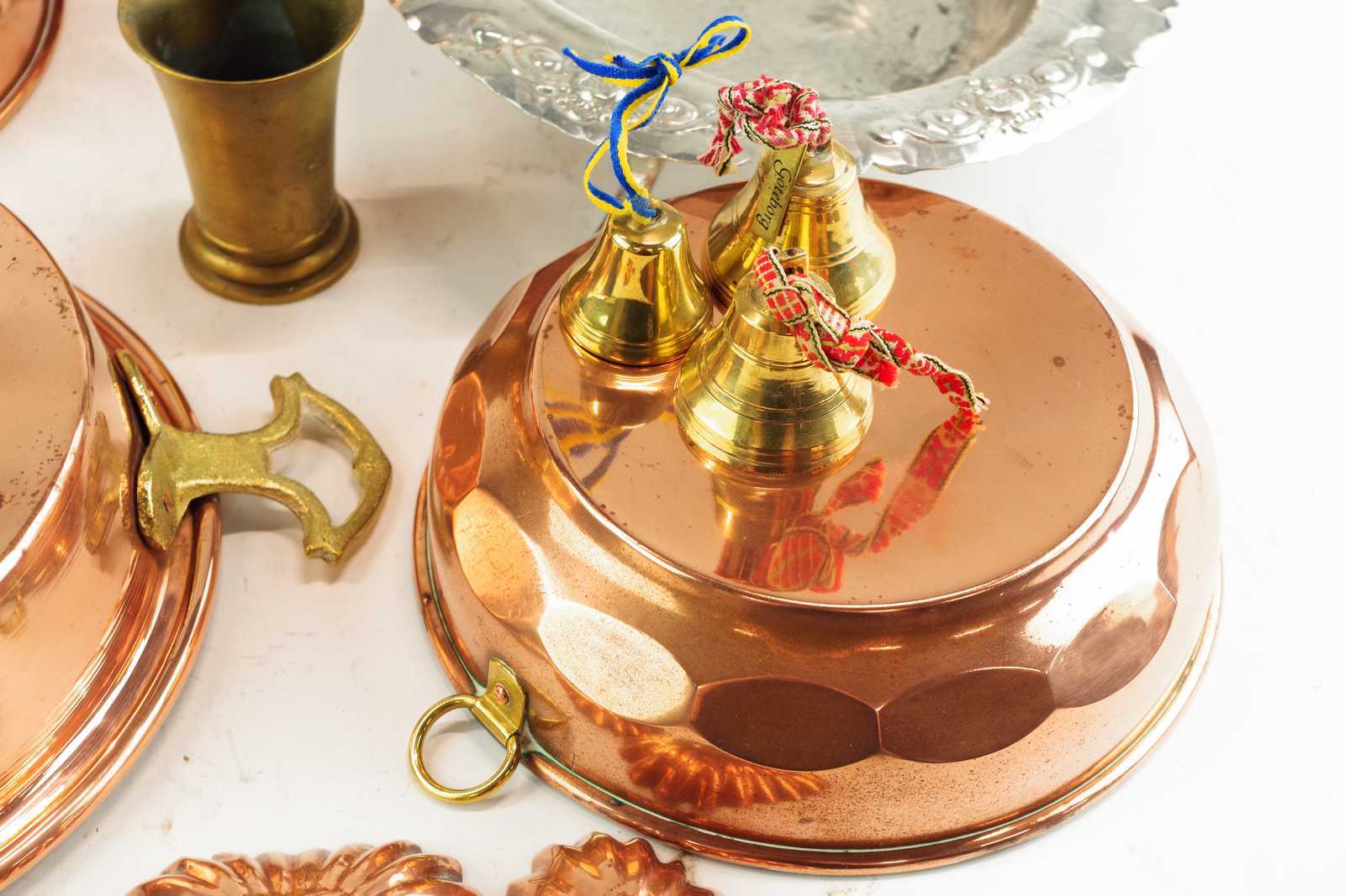 Bilder parti KOPPARFÖREMÅL, TENNFAT, MÄSSINGSBJÄLLROR Sockerkaksform D:18,5 cm